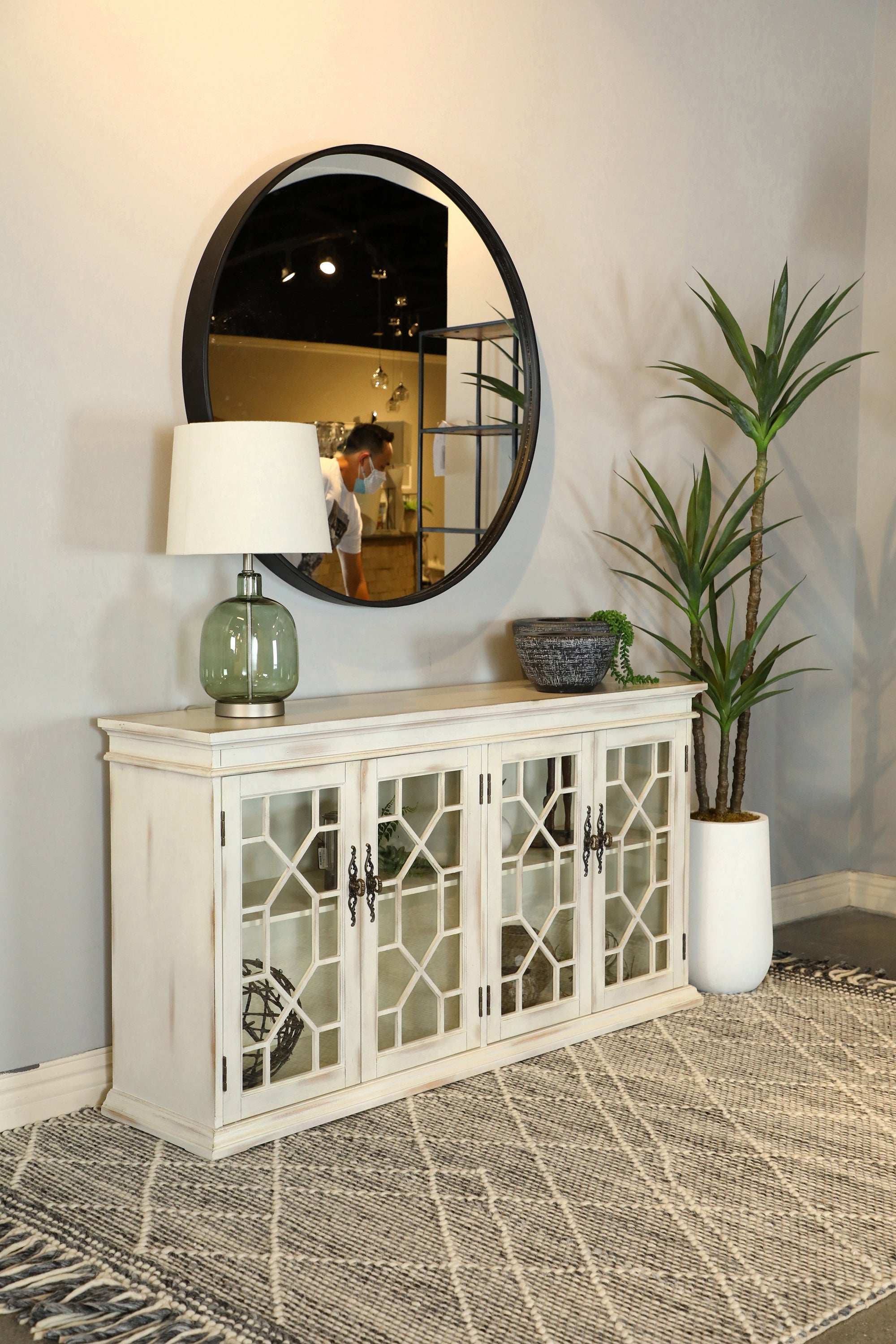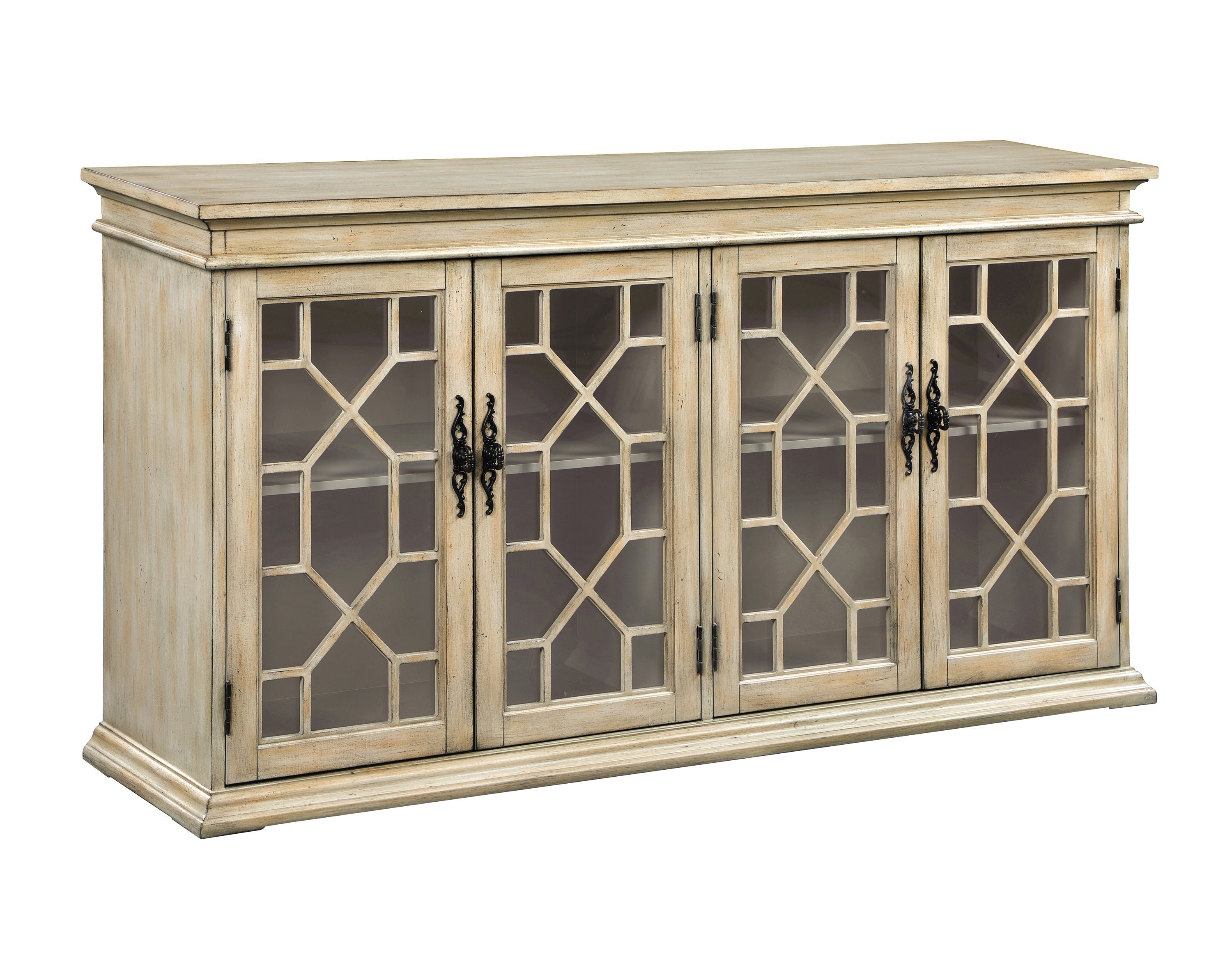 Traditional with country flair, this accent cabinet makes a fine furniture piece for a modern farmhouse style home. A light honey finish with a subtle weathered look adds a rustic charm, while glass panel cabinet doors feature a classical trim design. A double set of cabinet doors invite you to organize books and server sets, making is suitable for a living room or dining room space. Fastened on each of the four doors is an antique-style hardware pull with a contrasting dark bronze finish that lends a classic touch. A flush base offers extra stability and support while a spacious narrow tabletop offers room for table lamps and decor.