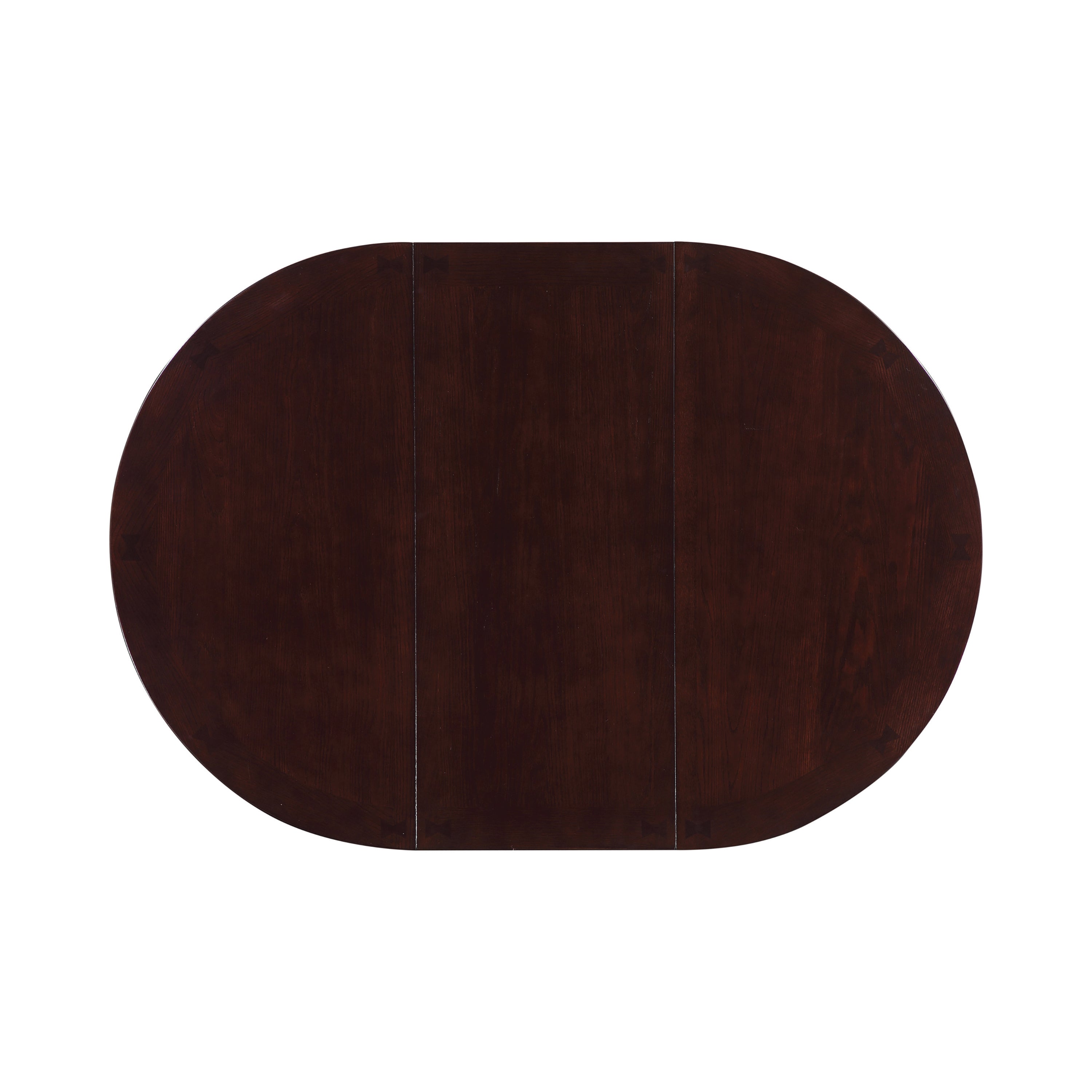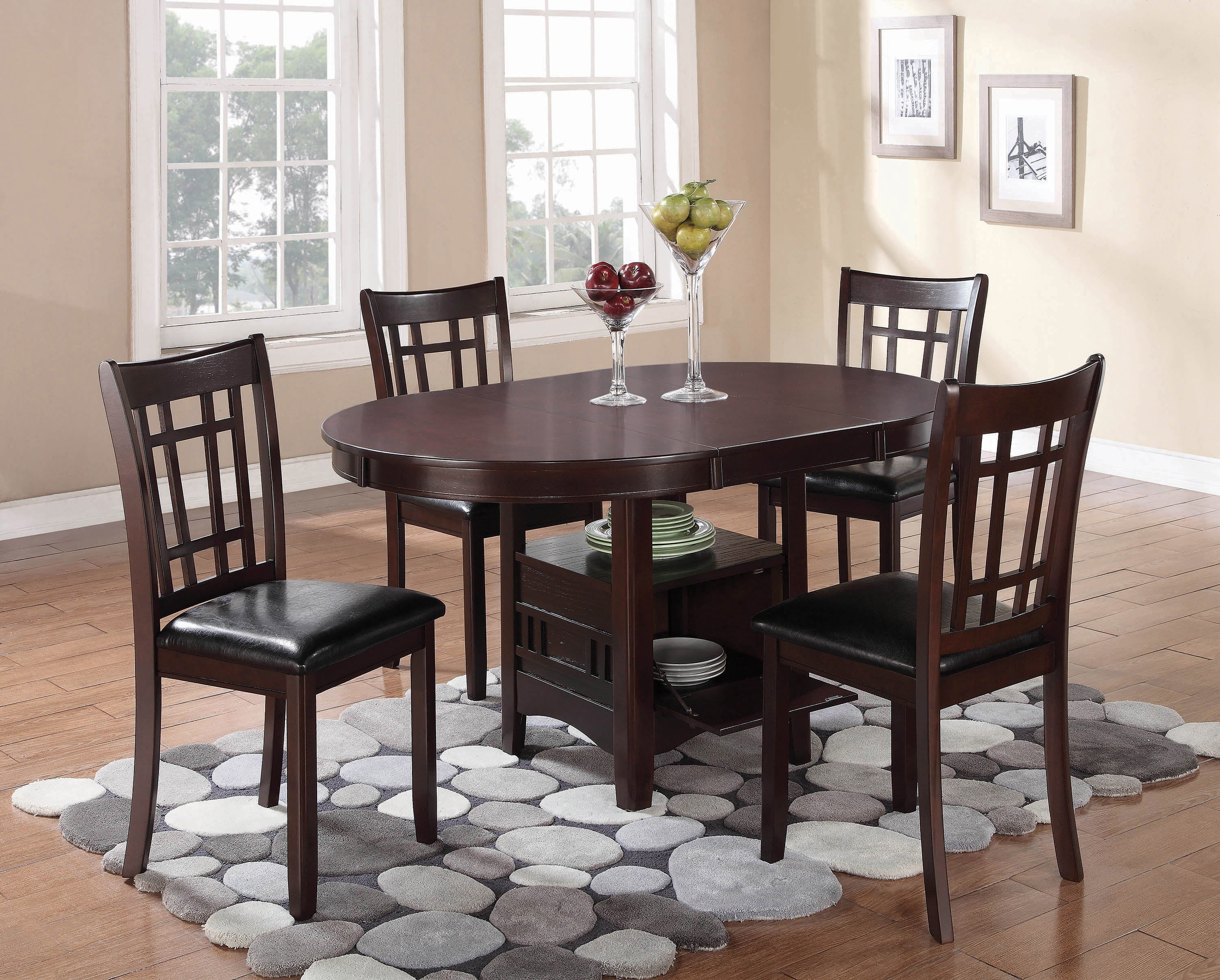 From the Lavon Collection, a transitional dining table that's both eclectic and versatile. Oval shape for intimate gatherings with 18" extension leaf. Warm espresso finish is inviting and matches your cozy home decor. Table base has closed storage unit and top shelf to keep the table top uncluttered and meal-focused. Matching chairs feature black leatherette cushions.
