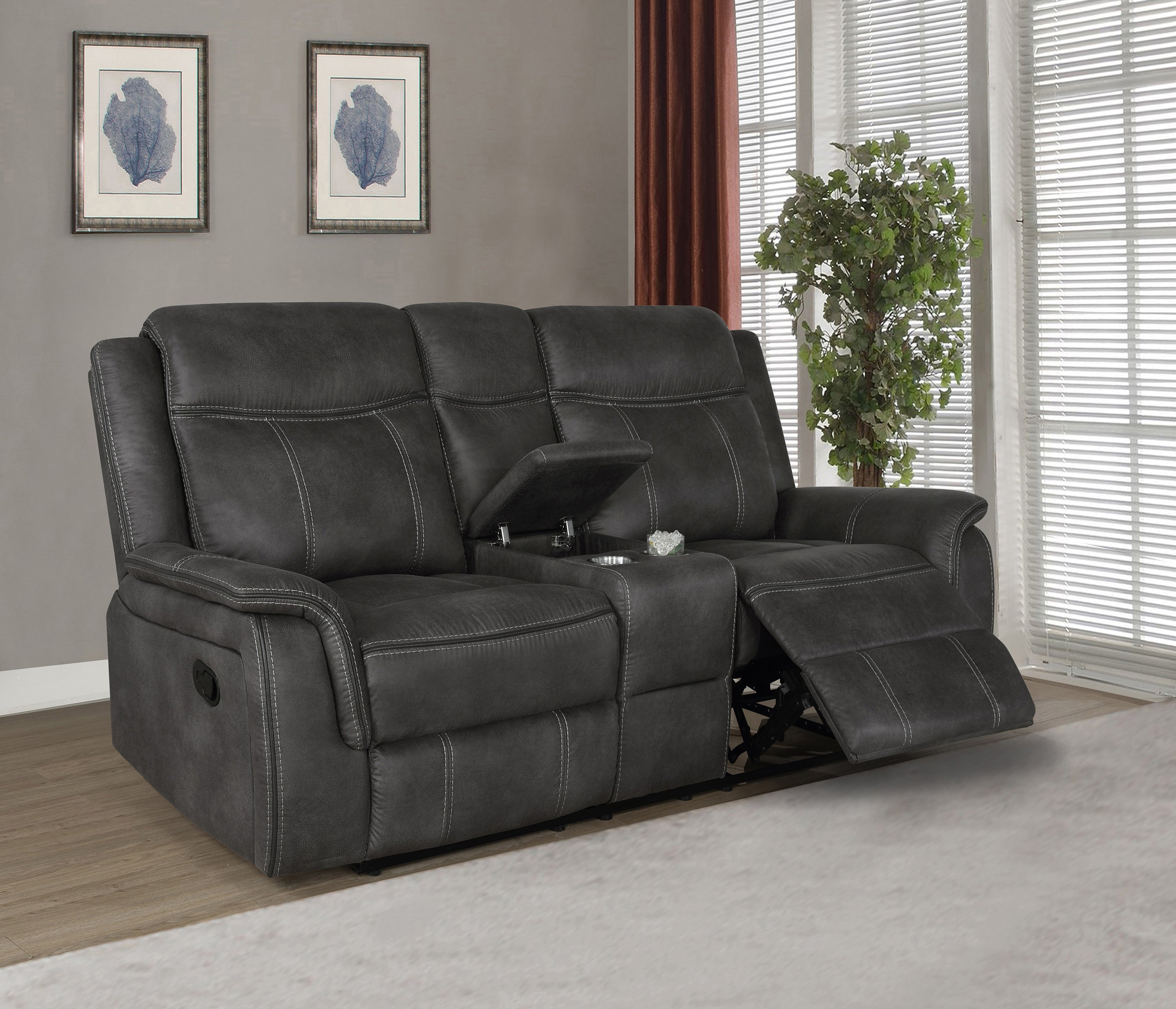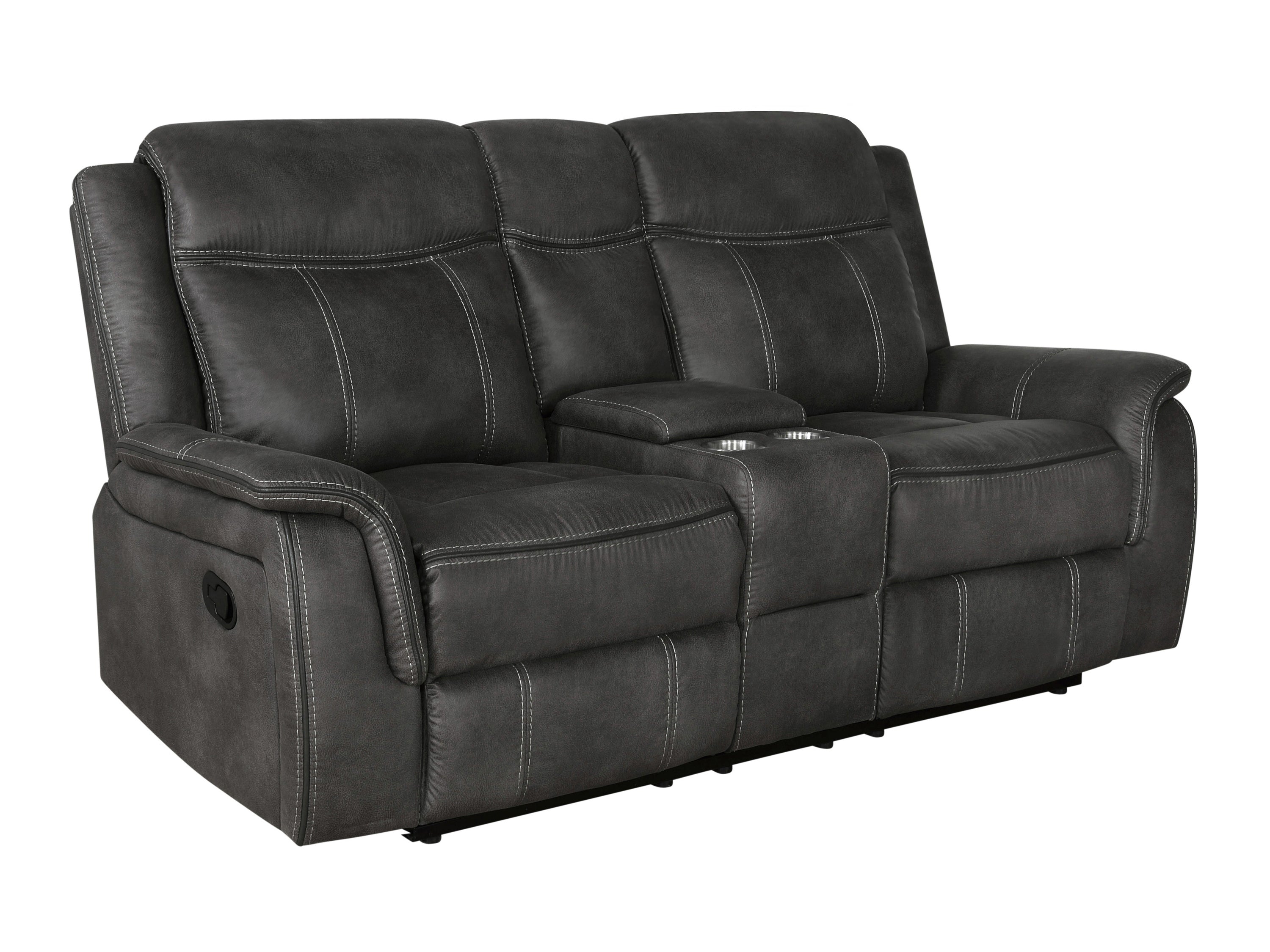 A motion loveseat with console becomes the center of attention in your living space. Fall in love with its microfiber upholstery, making a soft and cozy seating area for all to admire. This motion loveseat is equipped with a manual reclining mechanism for ultimate relaxation. The accompanying center console comes with a lift-top design and storage within. In front of the center console is two stainless steel cupholders to keep drinks on hand.