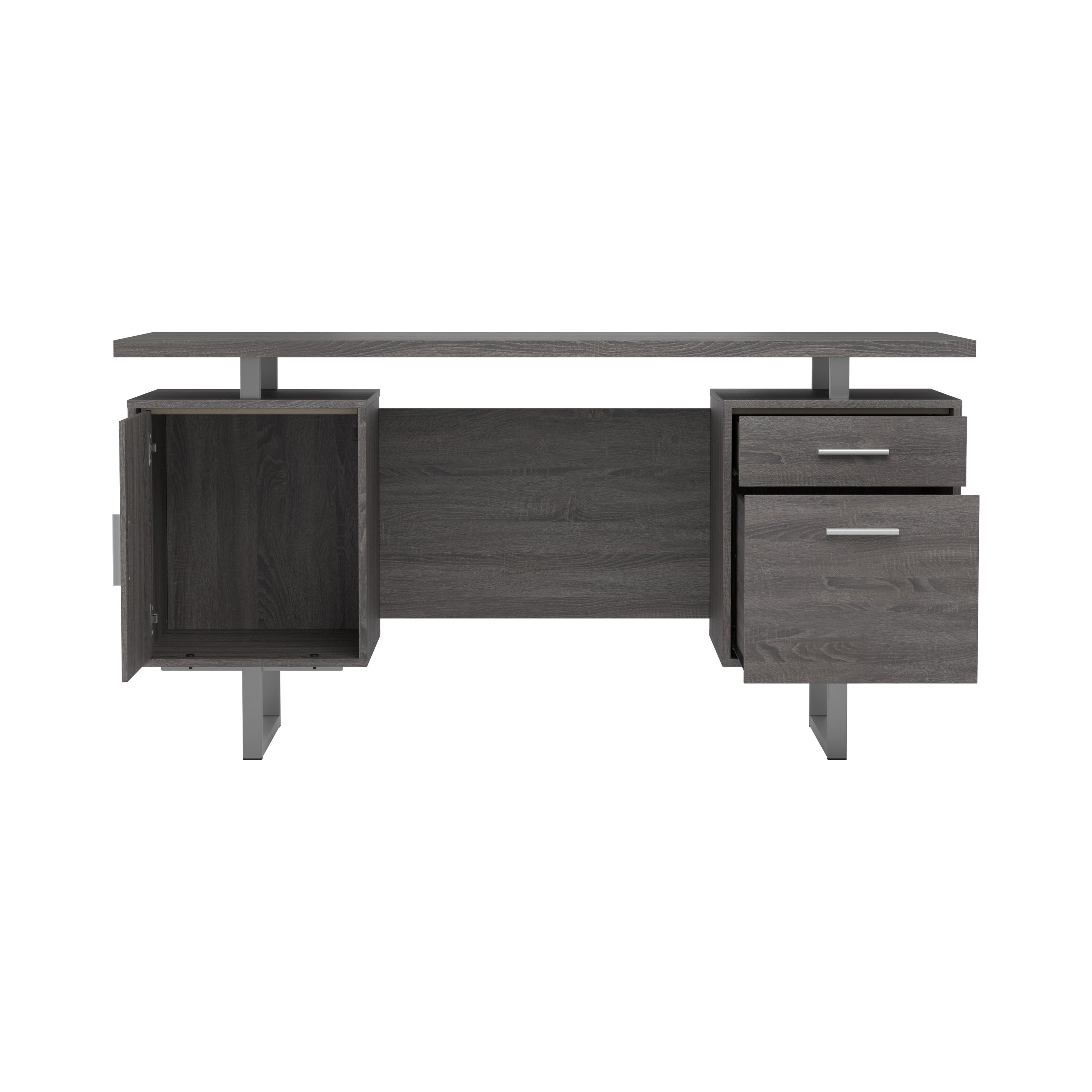 Chic and modern, this wooden writing desk creates a gorgeous focal point in any home office. Sleek lines of silver finish metal create a sturdy foundation for its stylish design. A rectangular, floating tabletop adds visual intrigue to its clean silhouette. A storage cabinet, drawer, and file cabinet keep office essentials organized with ease. Available in your choice of attractive colors, there's an elegant option to effortlessly match with your space.