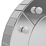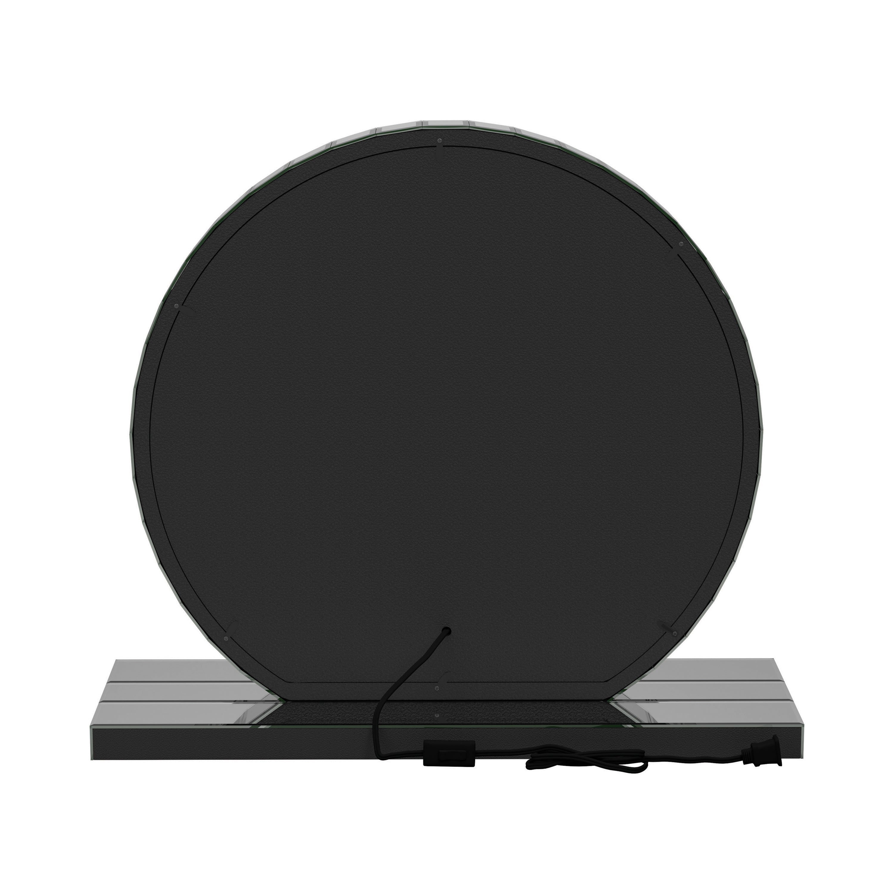 Elevate a fun atmosphere with this LED table mirror. This round contoured mirror is reminiscent of a dinner plate design, surrounded by a silver frame with black details. The LED light feature adds a fun visual element enhanced by the mirrored surface. A stand is included for display on a shelf or table. Add this mirror to a bookcase with other curiosities for added dimension and interest.