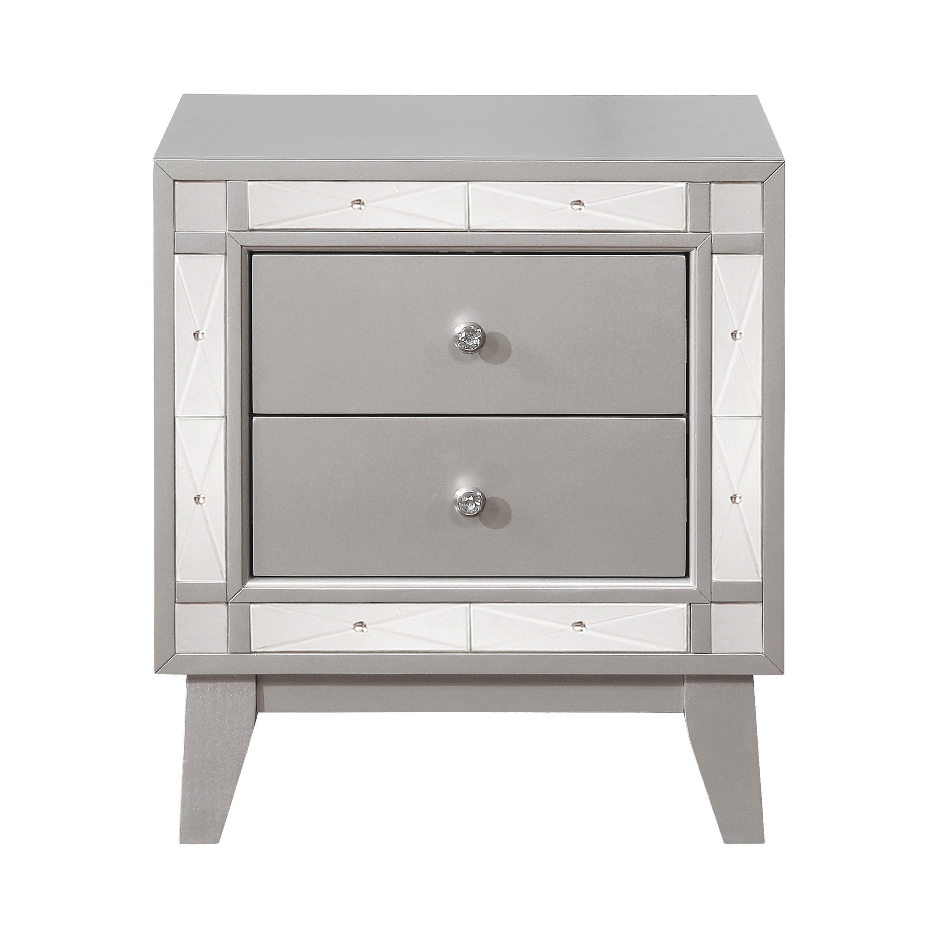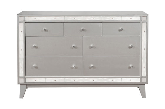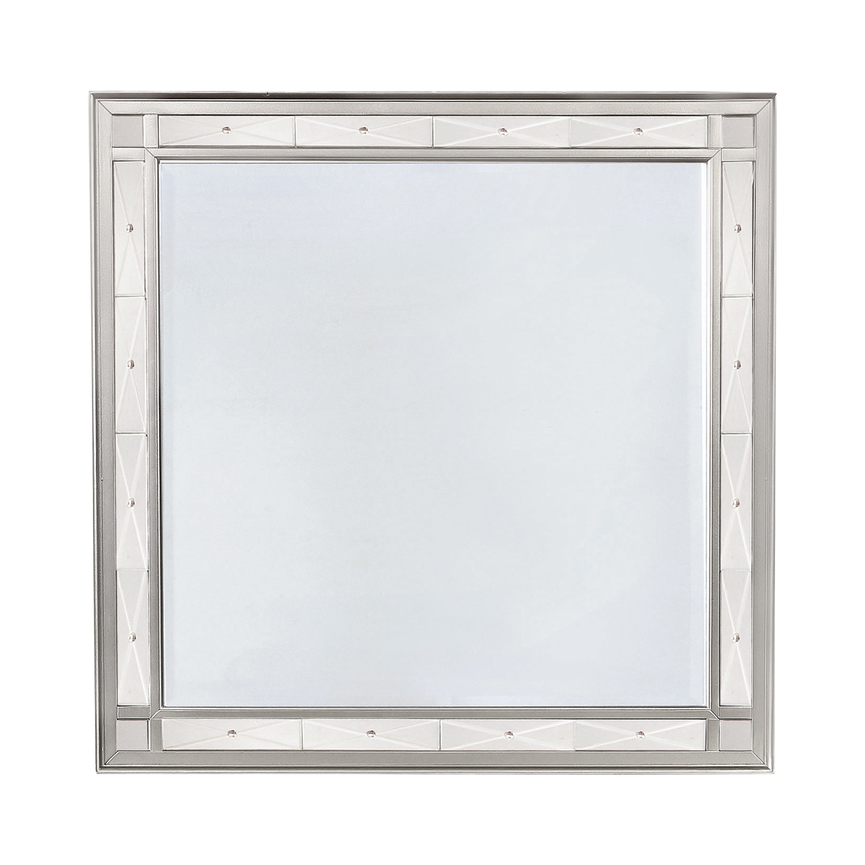 The Leighton collection presents this magnificent glam-style bed. It has an upgraded metallic finish that evokes images of sparkling mercury. The etched mirror-paneled accented frameworks features real mirrors for a mesmerizing effect. Wrapped in metallic leatherette with scintillating wave patterns. This bed is an absolute delight for the bedroom.