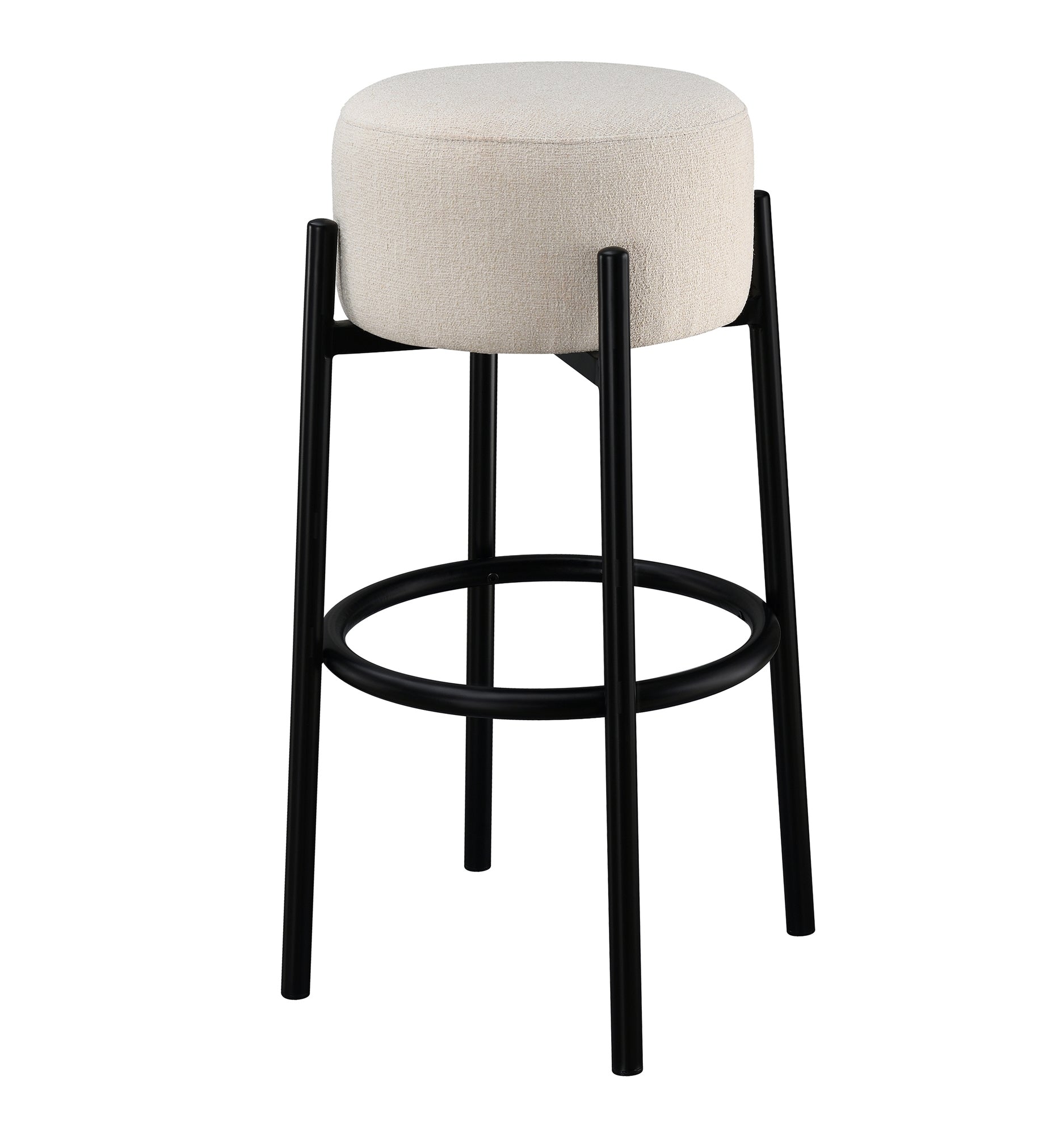 Casual with sleek lines, slide this pair of contemporary stools up to a bar or kitchen breakfast area. Designed with a thick pouf-like cushion wrapped in a white upholstery, this stool lends an elegant playful charm to any space. The pouf-inspired seat rests nestled between an extension of the minimal style, sleek modern frame. Presenting a stark contrast in color, each two-tone stool presents a white seat cushion held by a black finish frame. Four slim side supports lift the round cushion, offering rest and relaxation with a matching round brace that acts as a footrest.
