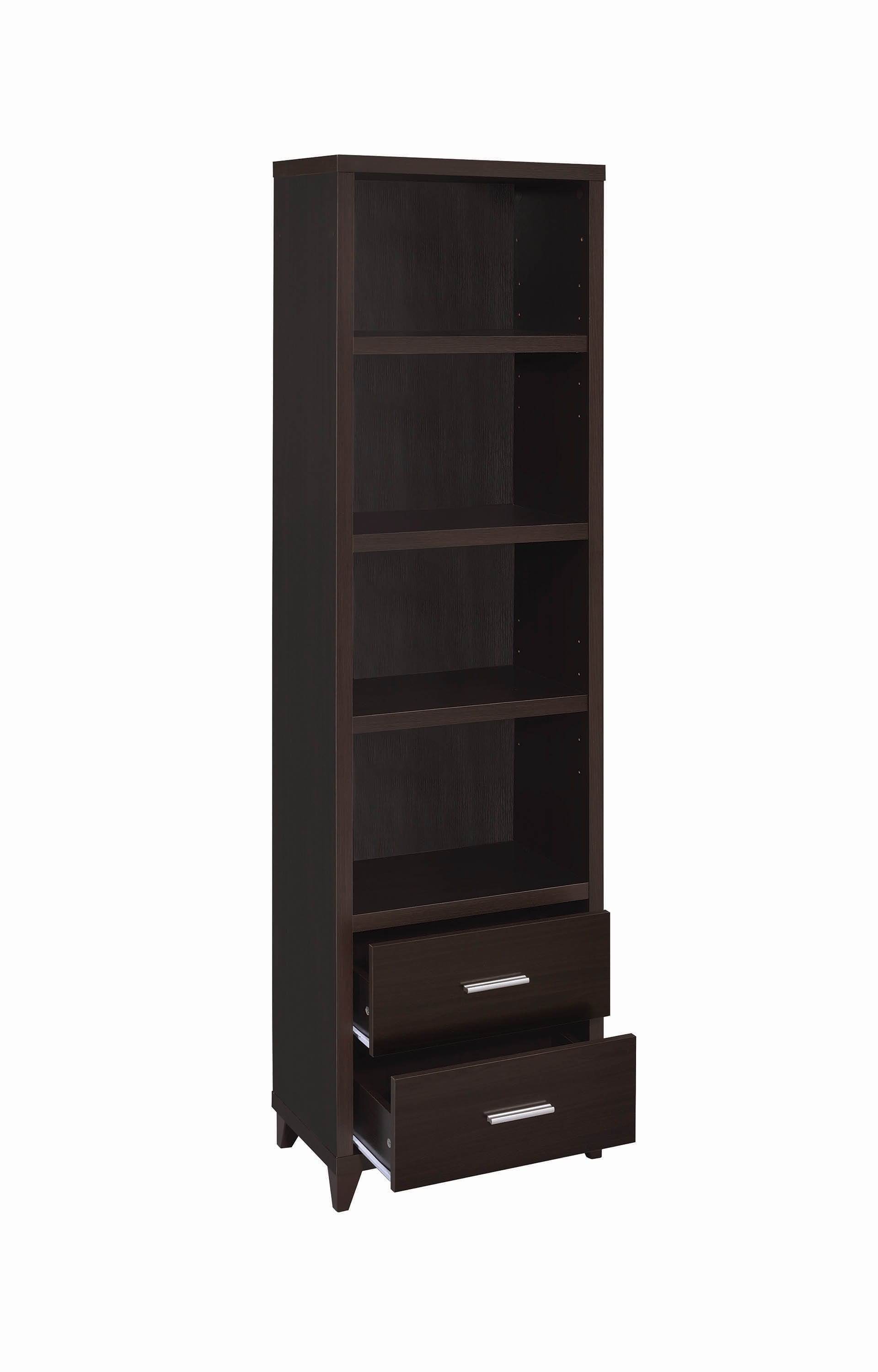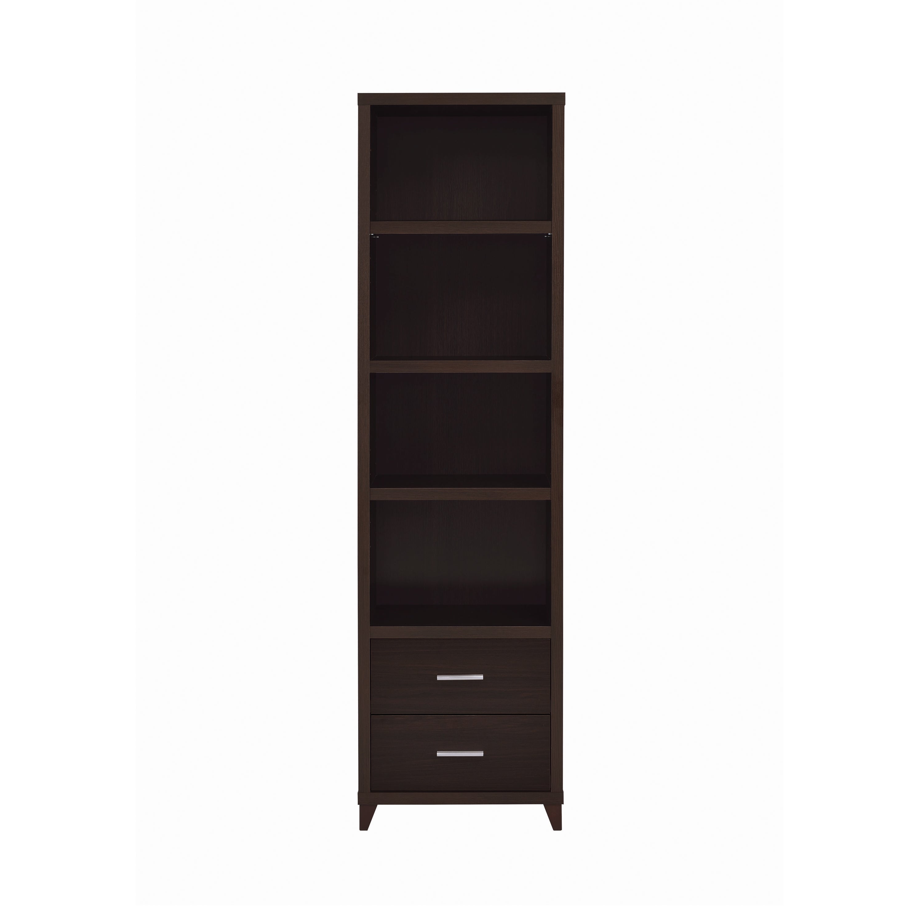 Enhance your living space with contemporary elegance. Smooth, sleek lines and brushed silver hardware enhance the accentuate the style of this stunning media tower. Four large open compartments provide ample shelf space to display books, art, photos, or games. Its sturdy shelves are conveniently adjustable for extra versatility. Complete with two spacious lower drawers, this unit offers plenty of storage space for all your home entertainment essentials.