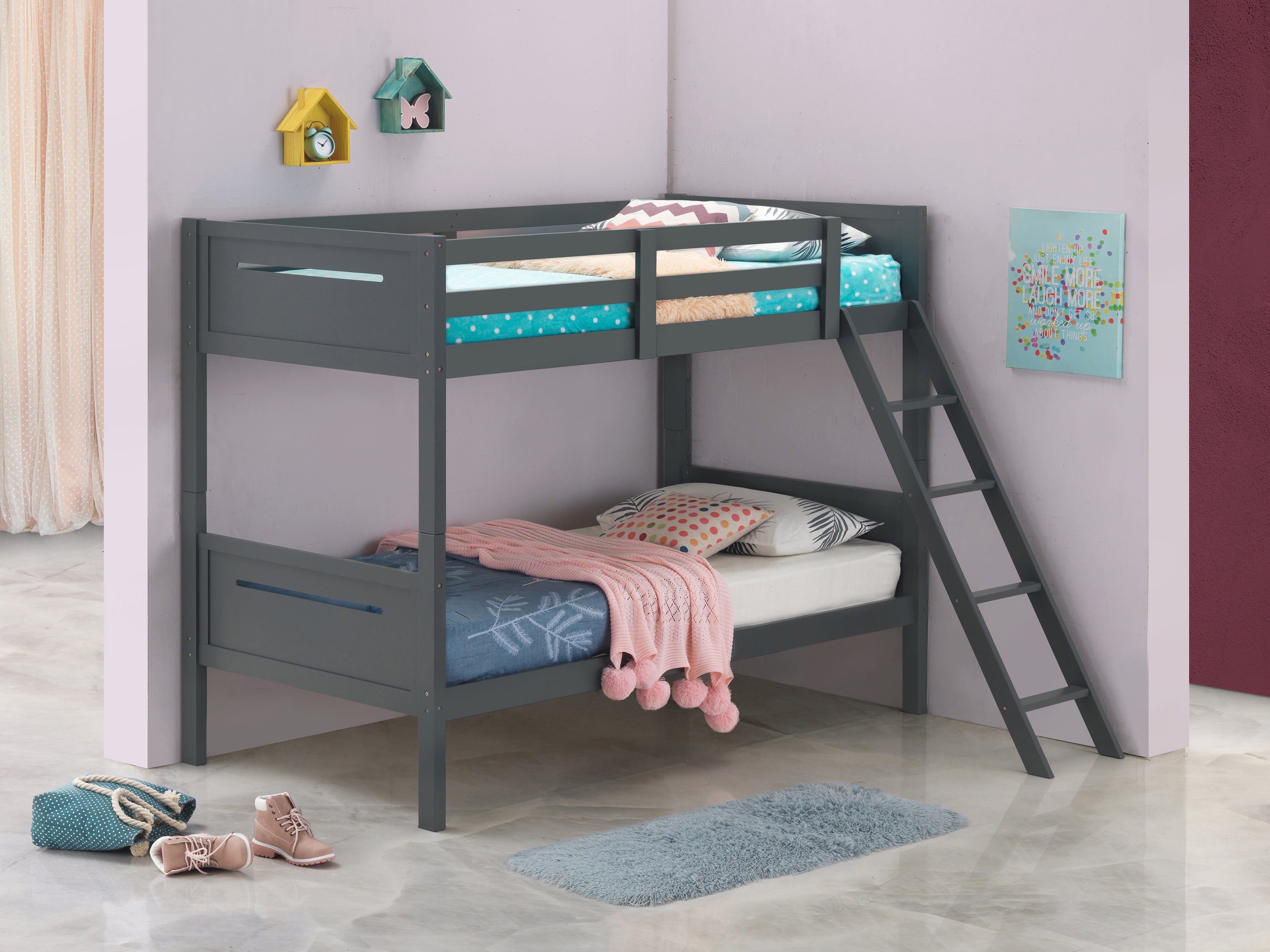 Space-saving with a clean and minimalist aesthetic, this youth bunk bed features a modern style frame that lends a masculine vibe.Perfect for making more floor space, this bunk bed offers a square design with a straight headboard and footboard, each with a slim notched out space.Available in several colors, this bunk bed complements any room's current color palette.An angled ladder allows kids to get to the top bunk, which also offers secure guardrails on each side.The bunk bed can be separated into two to create side by side beds as well.