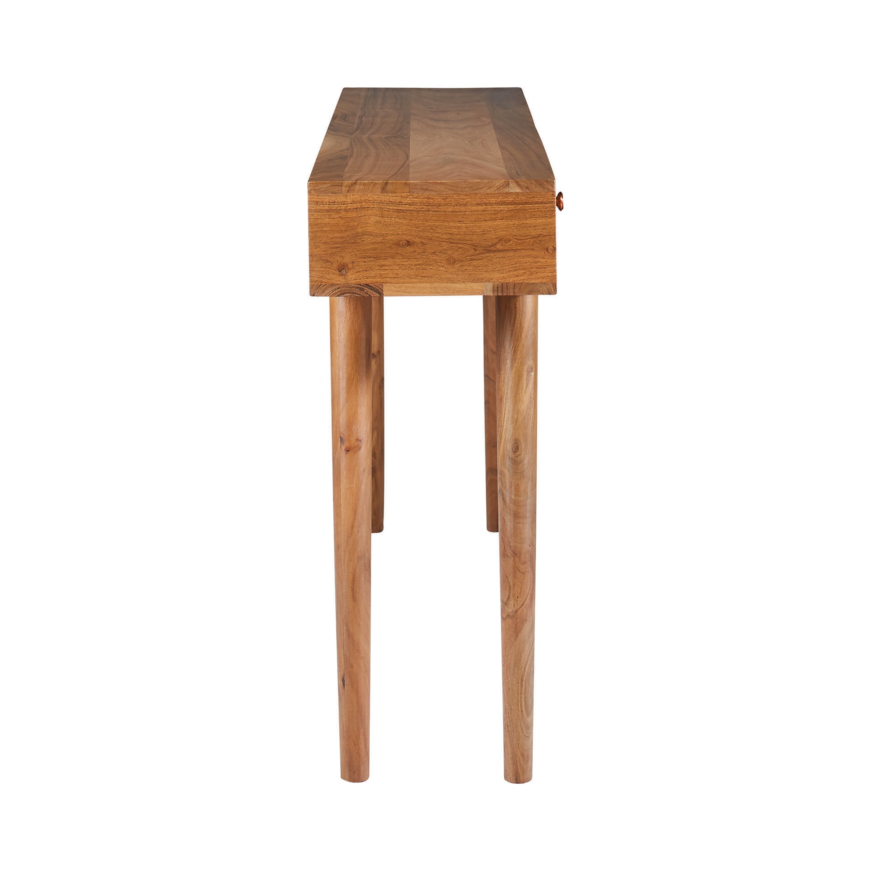 The uses are many for this console table. The angled tapered legs make it a stylish fit as a coffee table. The rich, natural brown wood finish means that integration into any space is practically seamless. The overall body style is a nod to iconic mid-century modern design. To find the perfect use, it has to come to your unique space.