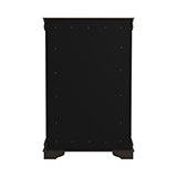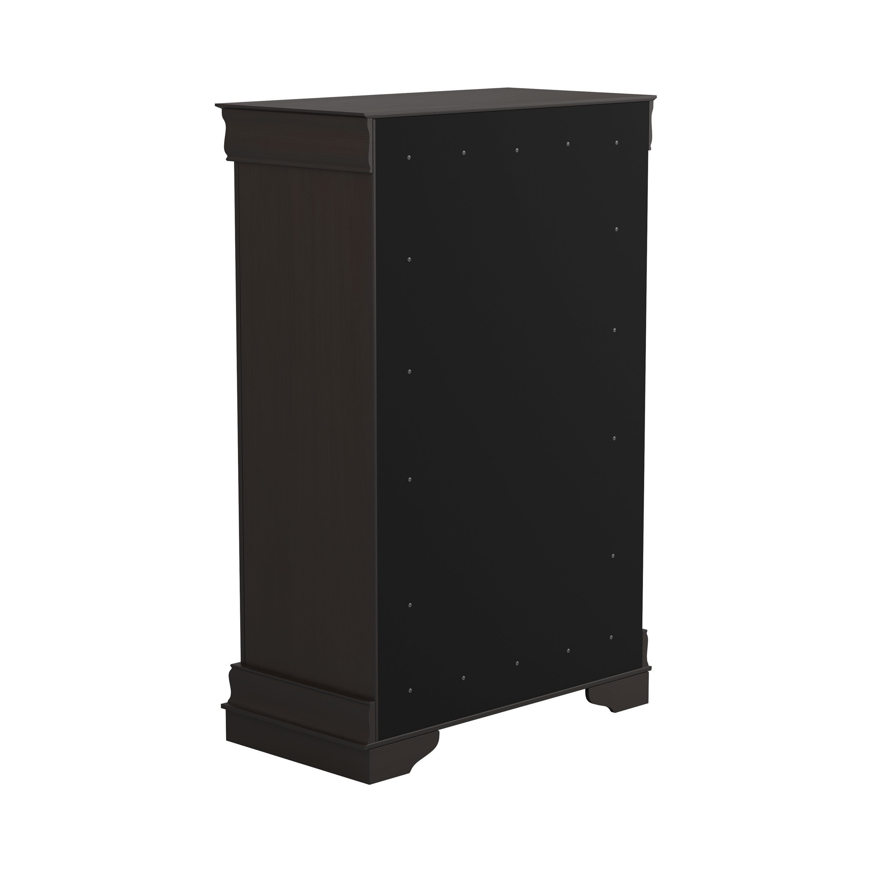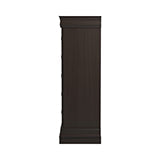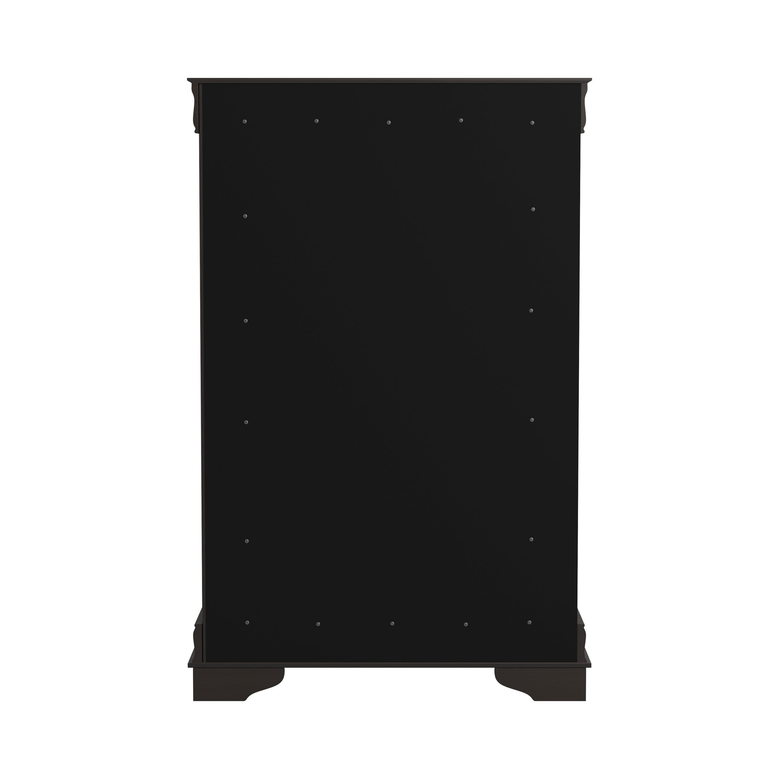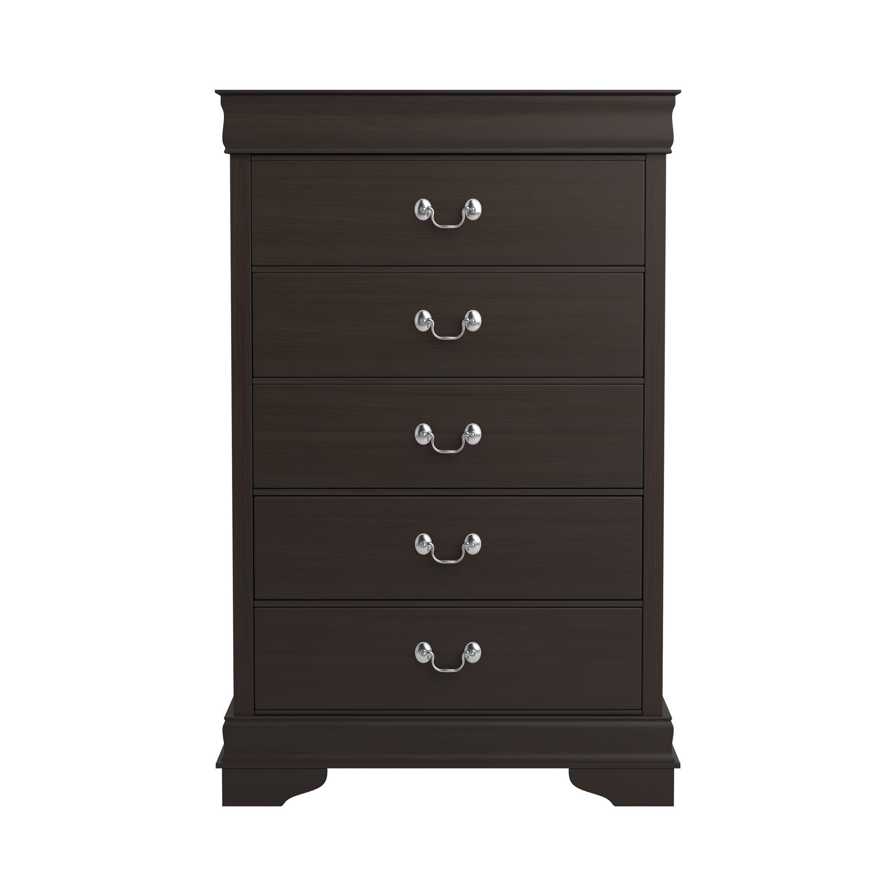Add depth to a traditional decor scheme with this five-drawer chest. Simple and elongated, the silhouette features wood veneer and select hardwoods. Radiate classic style and sophistication with a warm cappuccino finish. Contrasting nickel bail drawer handles are a modern upgrade. The English dovetail construction provides structure that is perfect for storing linens and extra clothing.