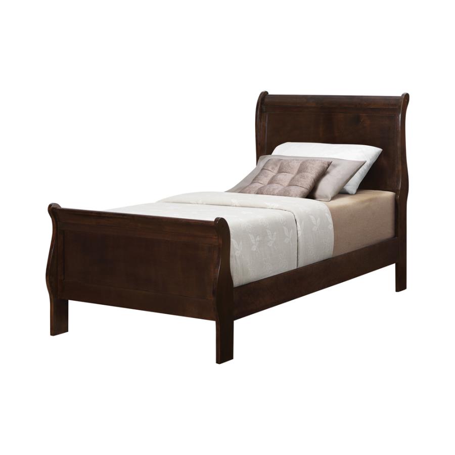 Update the classic style of a guest room or child's room with this stylish twin sleigh bed. Elegantly designed with a curved headboard and footboard, its sleek silhouette exudes charm and appeal. Its cappuccino finish lends a subtle hint of shine that's thoroughly pleasing to the eye. Expertly crafted from high quality materials, its sturdy frame provides luxurious support for a mattress. This bed is sure to transform a spare bedroom into a soothing retreat for relaxation.