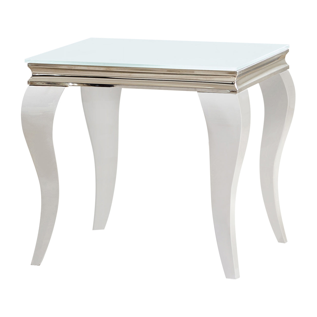 Shining finishes and curvy legs make this contemporary end table a truly chic furniture piece. Timeless by design, this square end table offers a spacious tabletop made with a tempered white glass rounded off with a soft beveled edge. Supported by slender and elegant Queen Anne legs in a stainless steel with a high-polished chrome finish, this end table exudes a glamorous flair all around. Place this contemporary end table beside an accent chair or flank a pair on each side of a sofa or sectional for table lamps, reading material and more. Complete your entire seating ensemble with an available matching coffee table.