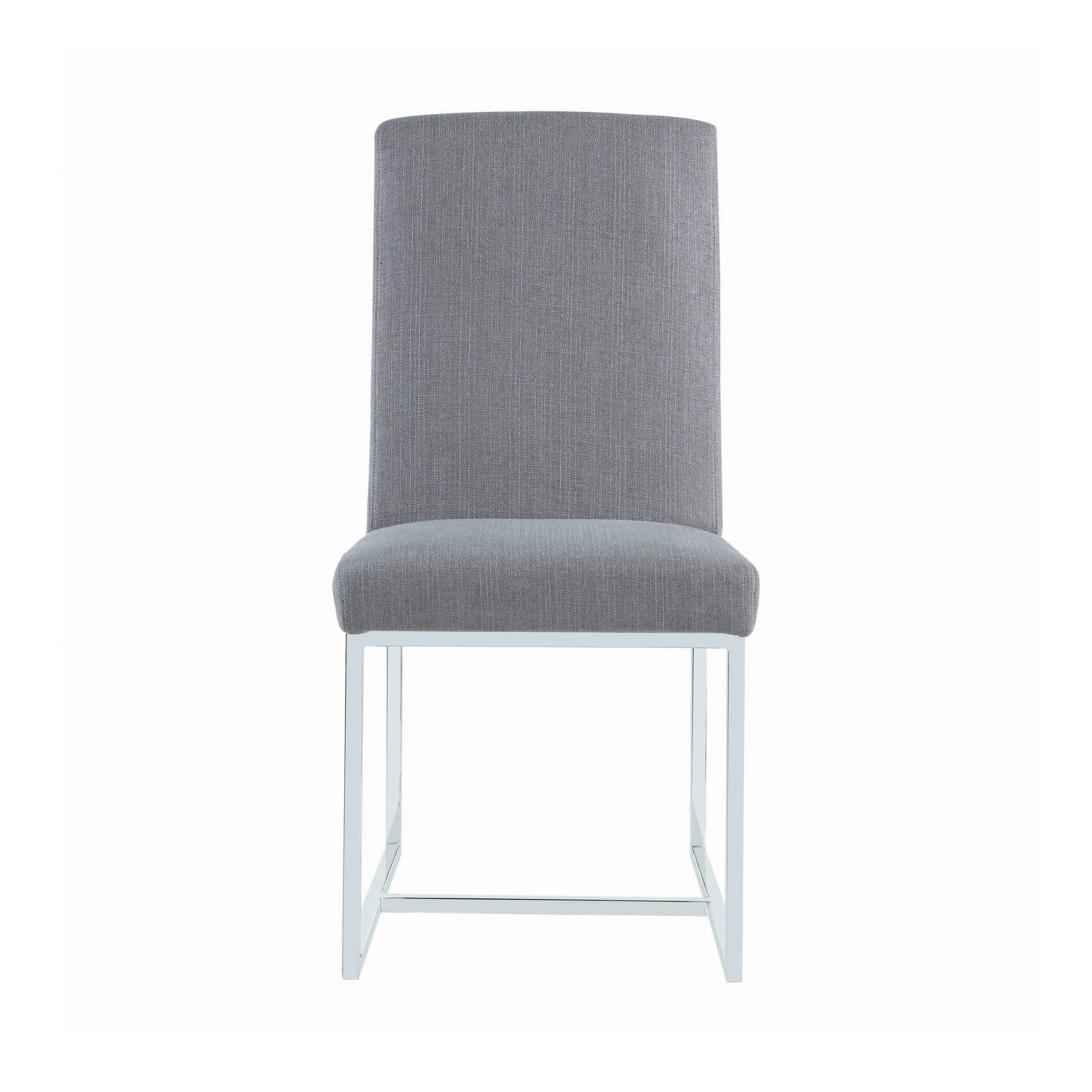 Assembly required: YesFresh grey upholstery highlights the design-forward look of this dining chair. Bring comfort and classic styling to a glass or wood table. A high back with linear design elements offers minimalist, elegant aesthetics. Creating balance, its open-concept geometric frame and leg base wrap up a fashionable design package. Make this exceptional chair part of a tasteful dining ensemble.