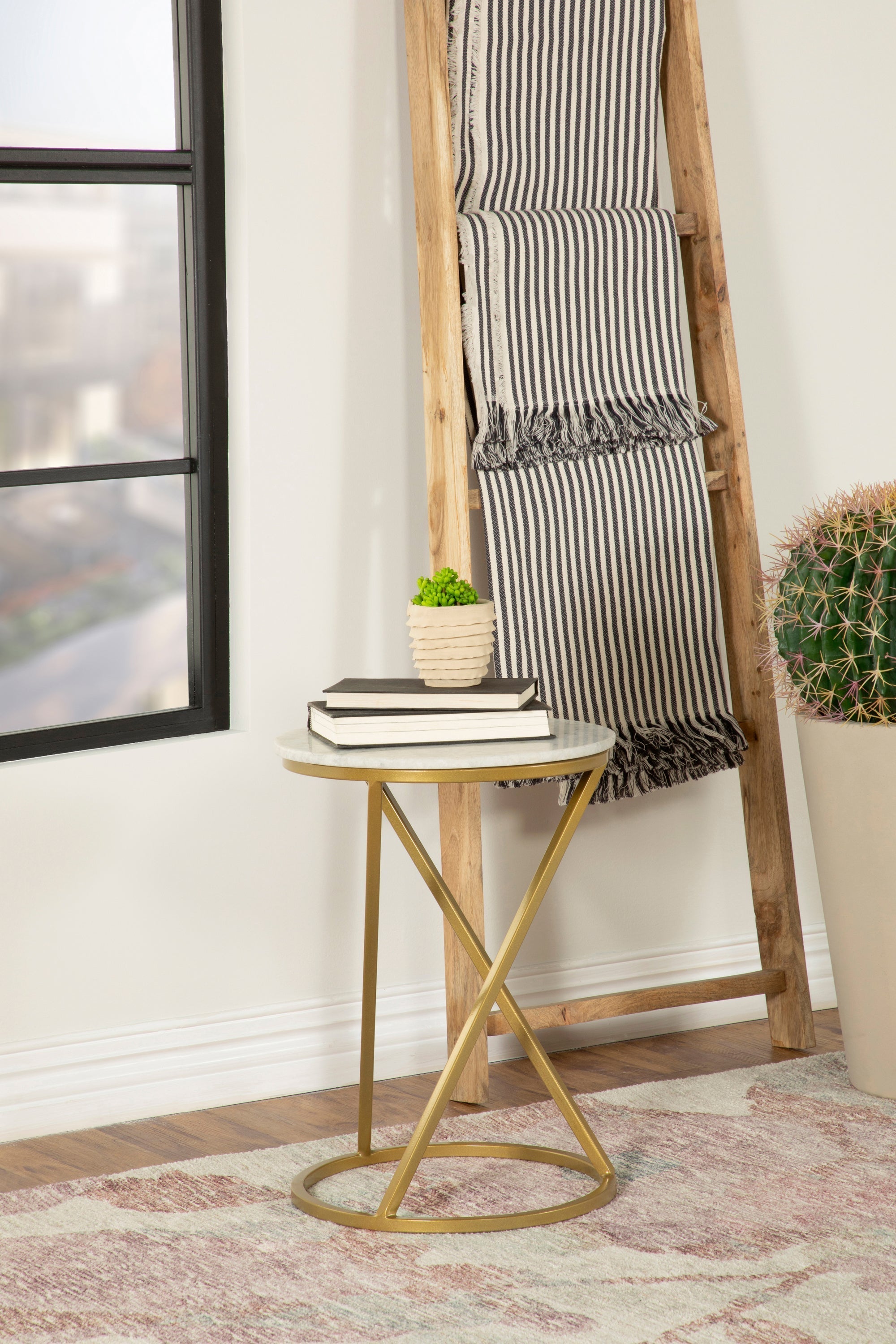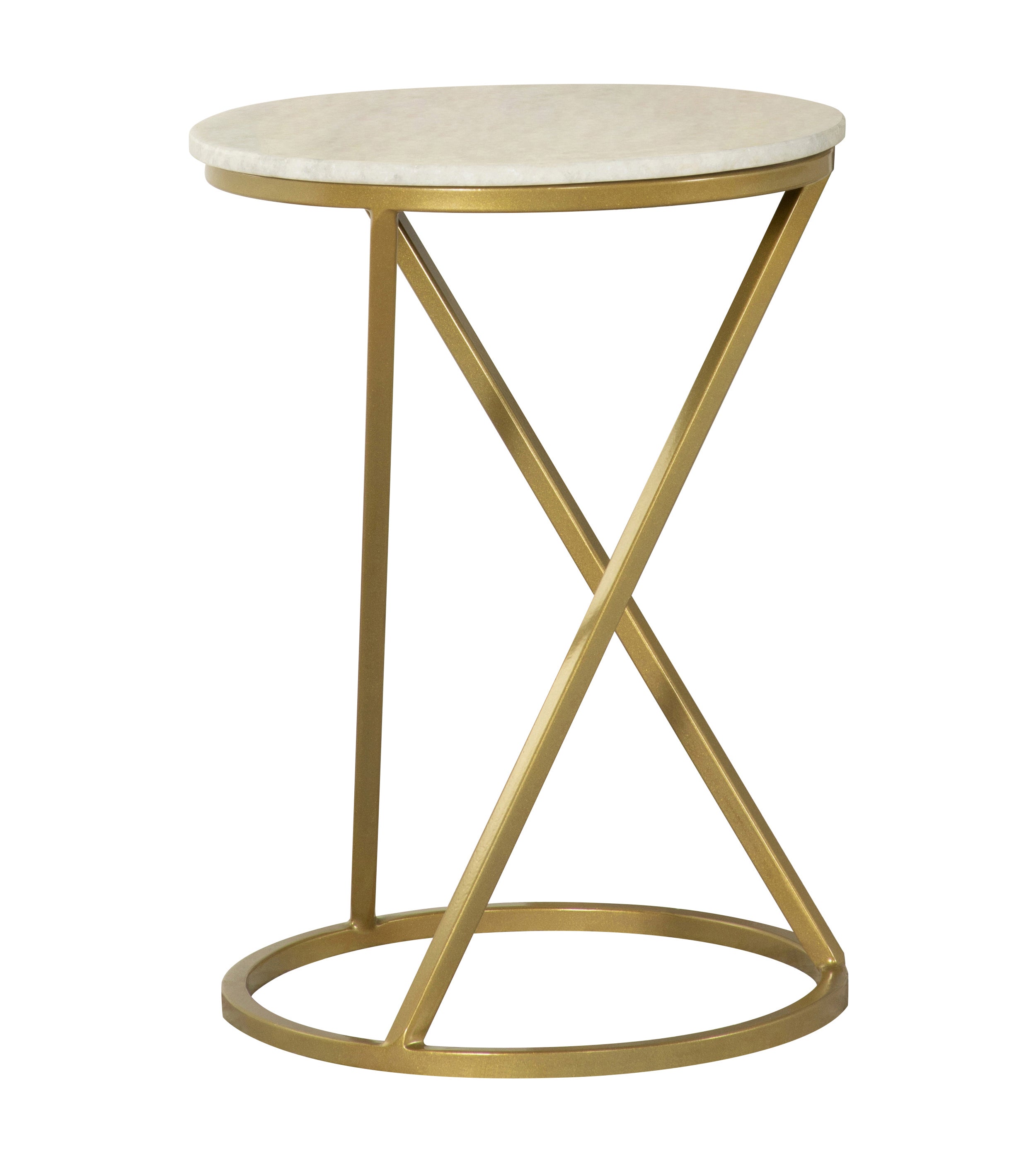 Topped with a solid white marble, this contemporary accent table offers up classical elements with modern silhouettes and shapes. situated on a flush ringlet base is a frame with an angled and straight metal support structure. The elegant, eye-catching base also features a warm, antique gold finish that lends a traditional flair. Perfectly suited nestled beside an accent chair or doubling as a nightstand in a compact bedroom space, this accent table can support books, refreshments or a potted plant for a hint of greenery. Versatile as it is stylish, this round accent table offers soft lines and an effortlessly understated timeless look.