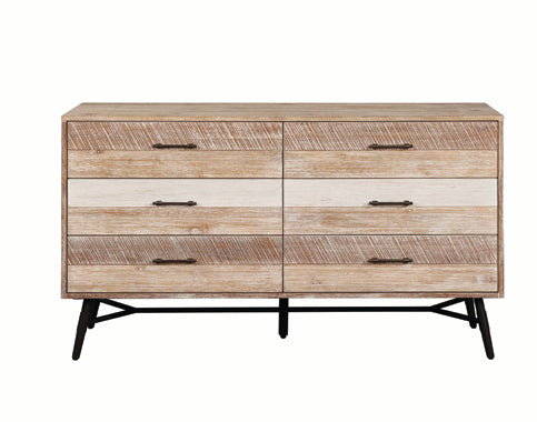Organize a master bedroom in style with this classic wooden dresser. Six spacious drawers provide plenty of space to store clothing, accessories, and more. Brown felt lining in each of the drawers lends a gentle touch of softness, helping to preserve delicate fabrics. Its planked drawer fronts are beautifully enhanced by multiple finishing techniques for a touch of rustic appeal. Matte black metal hardware completes its design with a striking, industrial edge.
