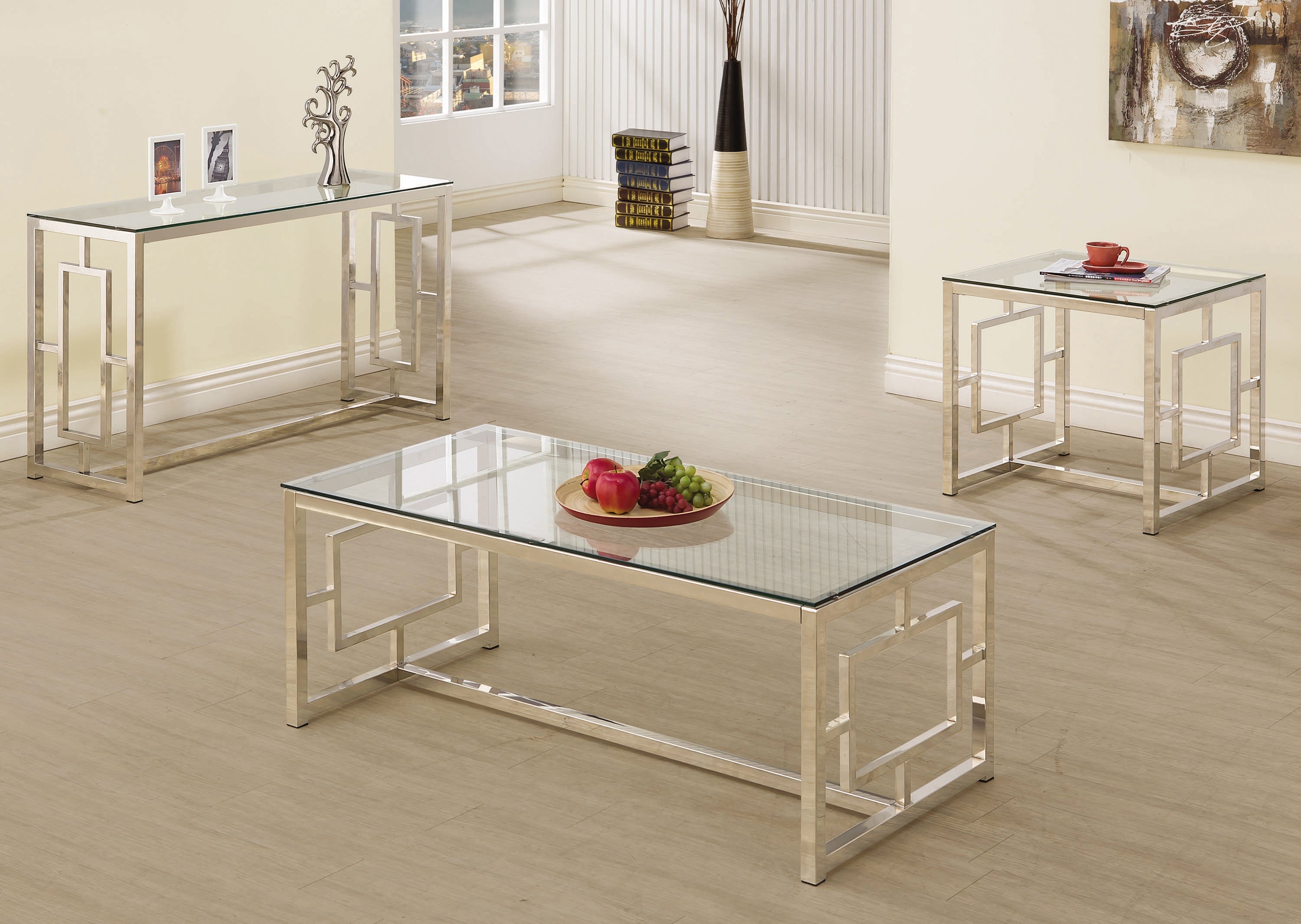 With sleek lines and an elegant design, this coffee table shines with stunning sophistication. Its eye-catching frame features bold, geometric designs, giving it a contemporary edge. A beautiful nickel finish adds brilliant shine to its striking silhouette. Topped off with a rectangular, tempered glass surface, this piece is crafted for style and functionality. It pairs beautifully with a matching end table and sofa table to infuse any living room with modern flair.