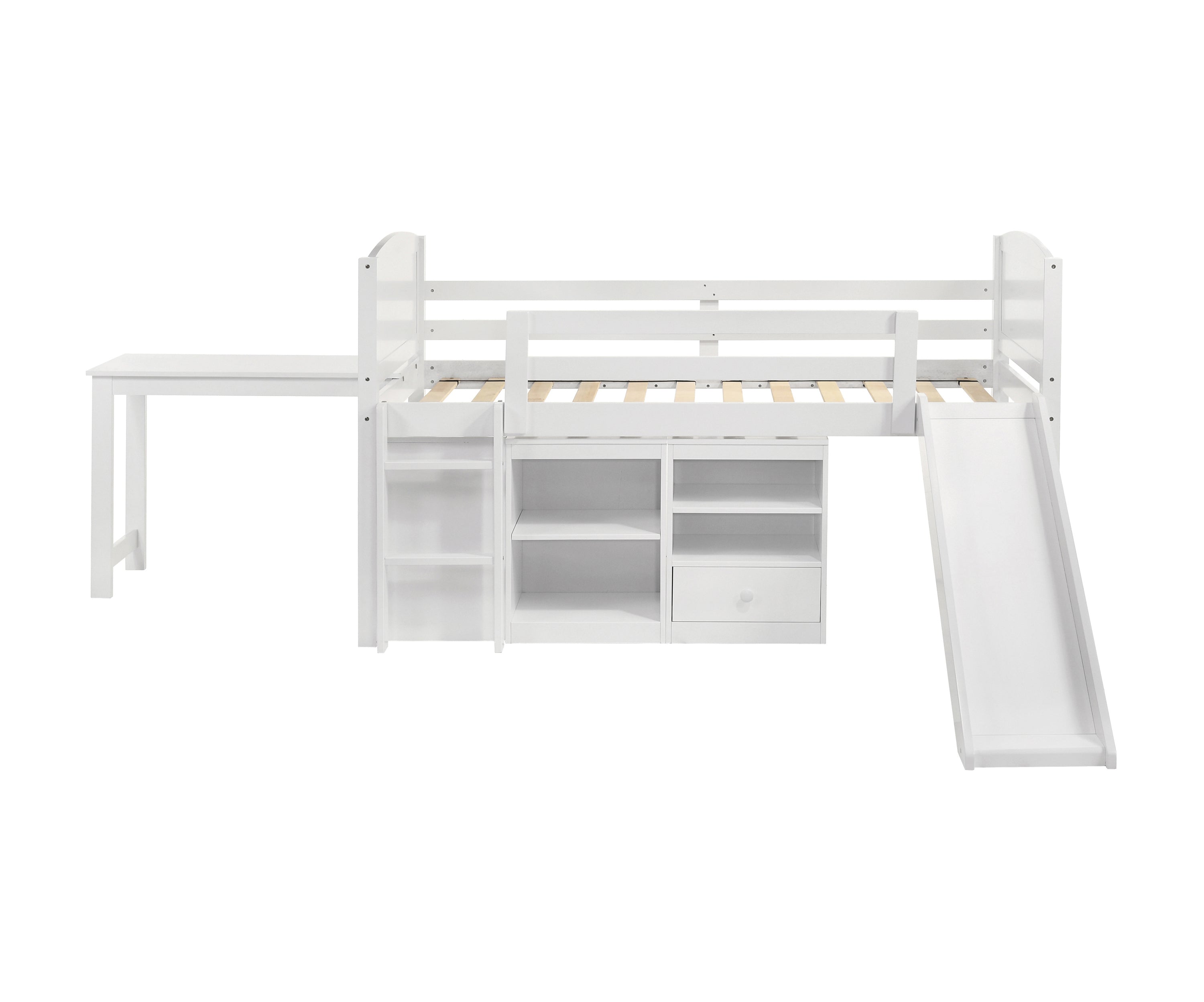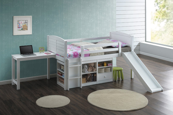 Complete your child's dream bedroom suite with this twin loft bed, complete with a playful slide and a desk for studying. With a crisp white finish throughout, this transitional loft bunk bed welcomes fun, vibrant colors of all shades and palettes. Open shelves support their favorite books and toys on several sides of the bottom portion while a desk offers a studious area for concentration and creativity. Along the headboard is a slat style design that lends a traditional touch to this charming bed frame. Adding a safety feature is side guardrails on each side of the top bunk, keeping your little one secure as they soundly sleep.