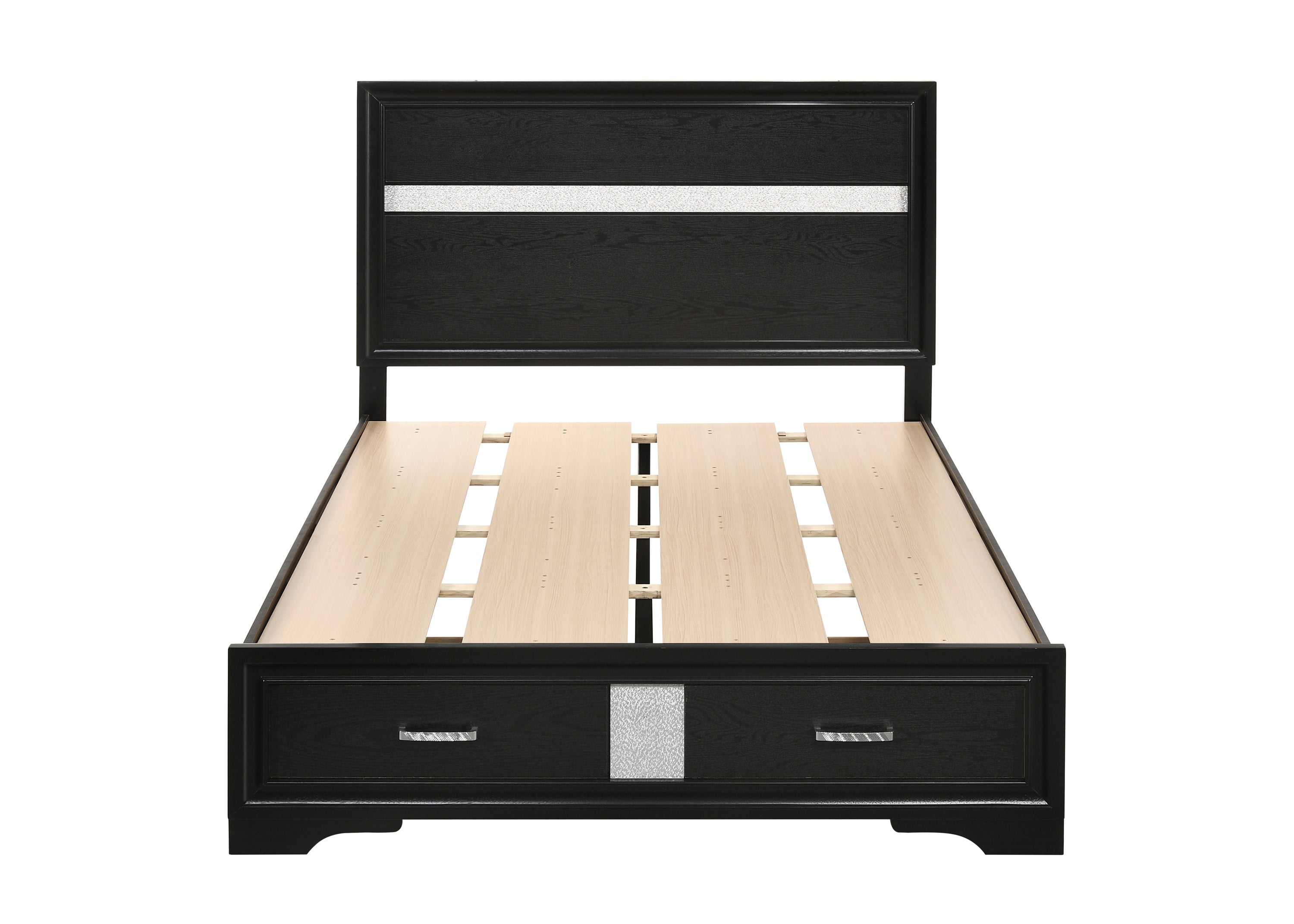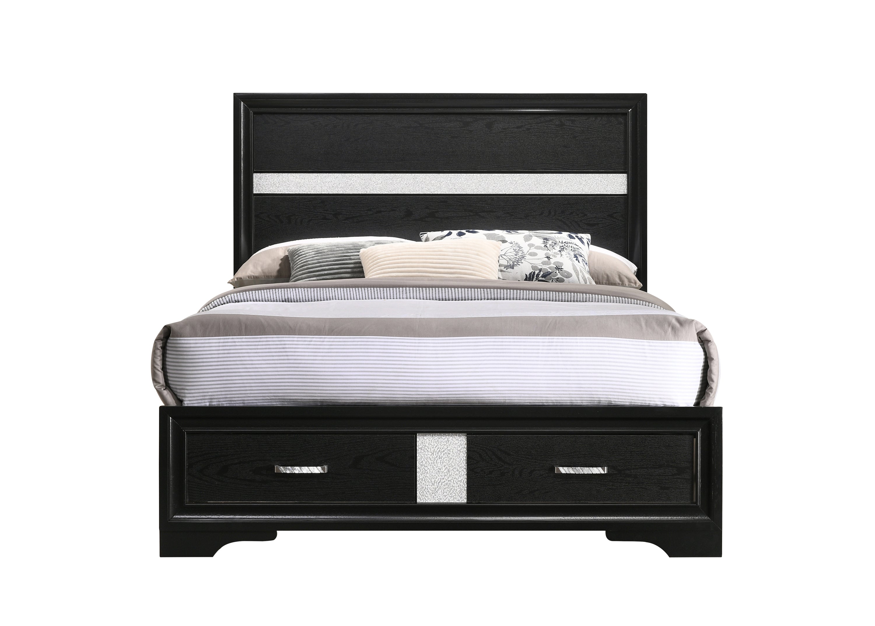 Give your bedroom a glamorous update with this gorgeous storage bed. The headboard and footboard are decorated with acrylic glitter panels for a dazzling touch of shine. Two slide-out drawers are built into the footboard to maximize storage space. The drawers are topped with rhinestone handles for even more beautiful bling. This platform bed is mattress ready for added convenience.
