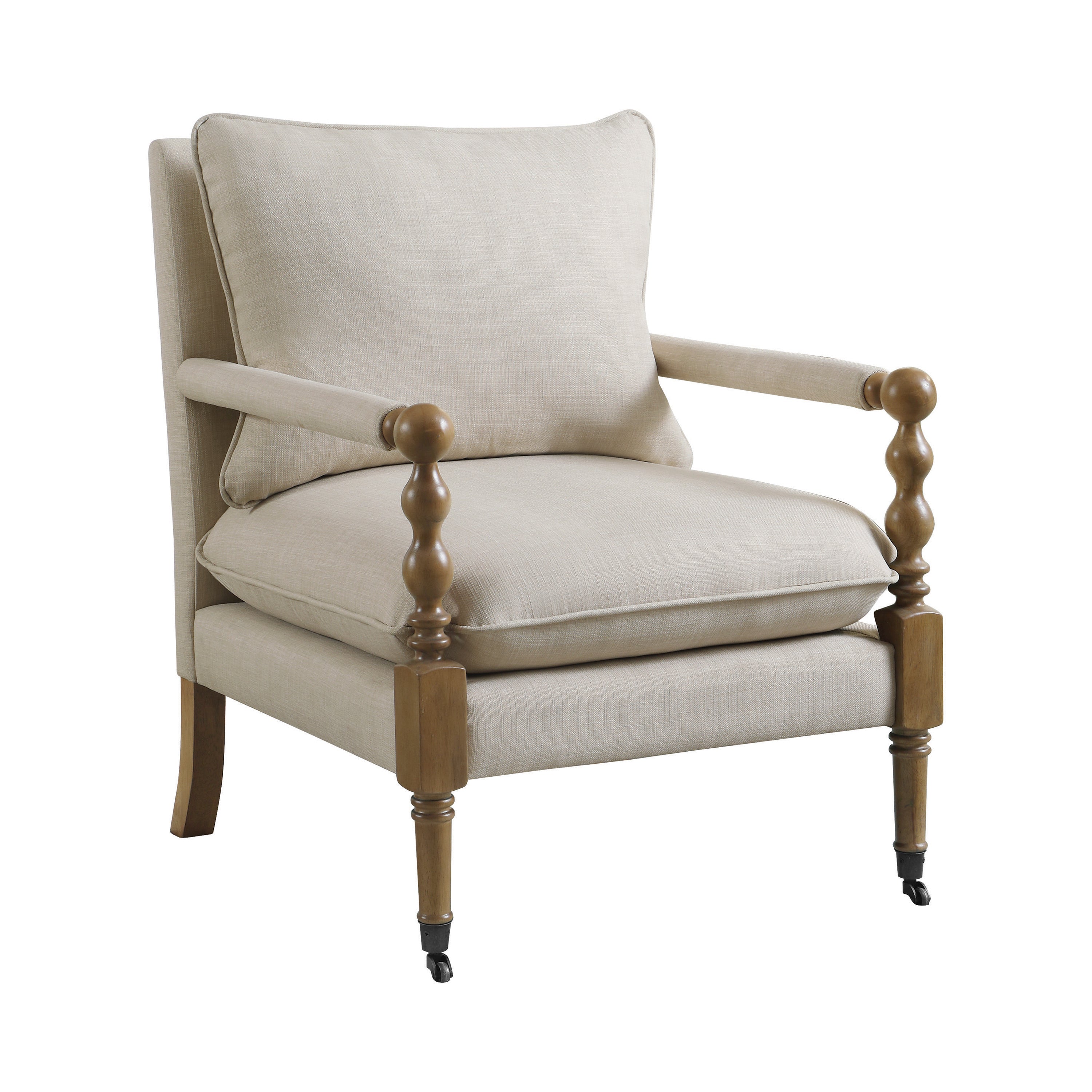 Introduce stylish comfort to a master suite or living room seating area. This upholstered accent chair features wonderful linen-line fabric that elevates its inviting style to new heights. Exposed wood framing in a dark oak finish draws the eye and offers a touch of contrast. The chair features a plush seat and back pillow, with covered arms that add comfort. Curl up with a book or catch up with a friend.
