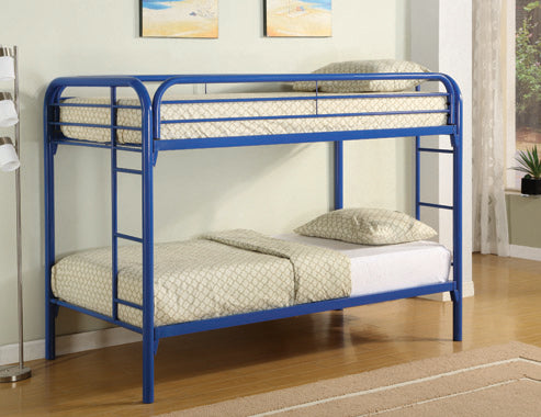Open up a shared room with the smooth lines in this twin bunk bed. The open, supportive frame creates a modern look with an elongated and balanced silhouette. Constructed of metal, the frame offers a playful blue hue for a youthful take on clean, contemporary design. Built-in ladders on both sides add support. Featuring a full-length guard rail, this twin over twin bed simplifies with sleek features and a fun pop of color.