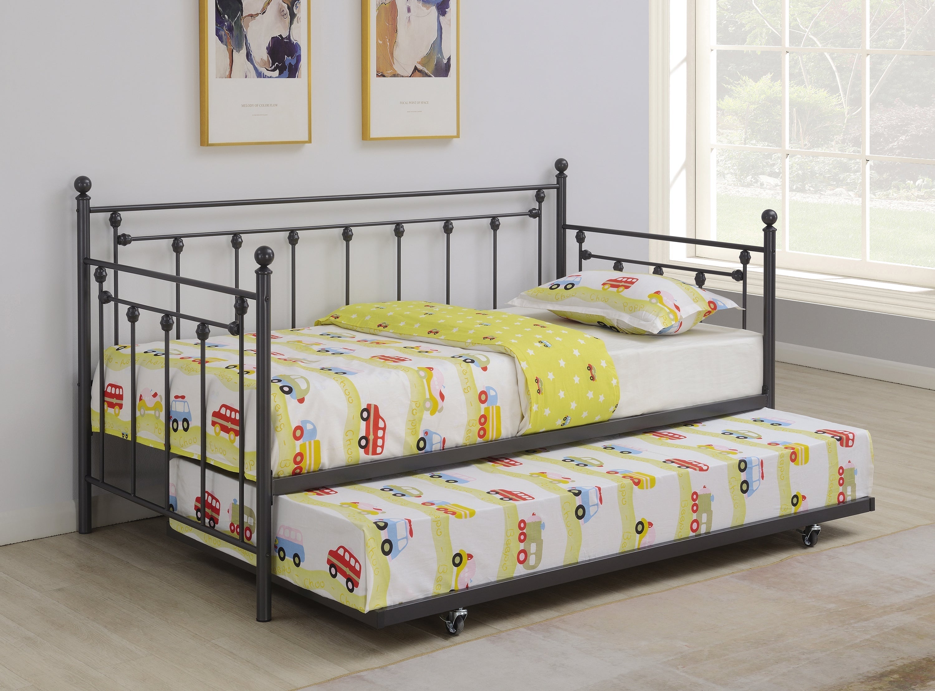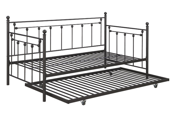 This twin size daybed offers a compact furniture piece for smaller bedrooms. Designed in a classic farmhouse style, it offers a charming classic spindle style with modern touches like a powder coated finish. Each spindle is adorned with a round metal finial accent, which adds a lovely traditional touch. Convenient and versatile, this twin daybed also comes with a rolling underbed trundle that can pulled out for overnight company and sleepovers. Smooth gliding casters make it super easy and this bed is available in two finishes so you can choose the color that best matches your existing color palette and style.