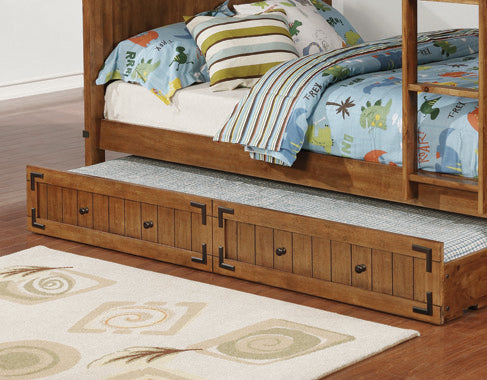 Complete a daybed ensemble with a convenient way to increase space. This storage trundle offers handy underbed storage that keeps clothing and linens hidden away. With a farmhouse and mission blend of styles, its rustic honey finish is both versatile and inviting. Subtle metal hardware completes a stylish package. Made from solid rubberwood and includes a 13-piece slat kit.