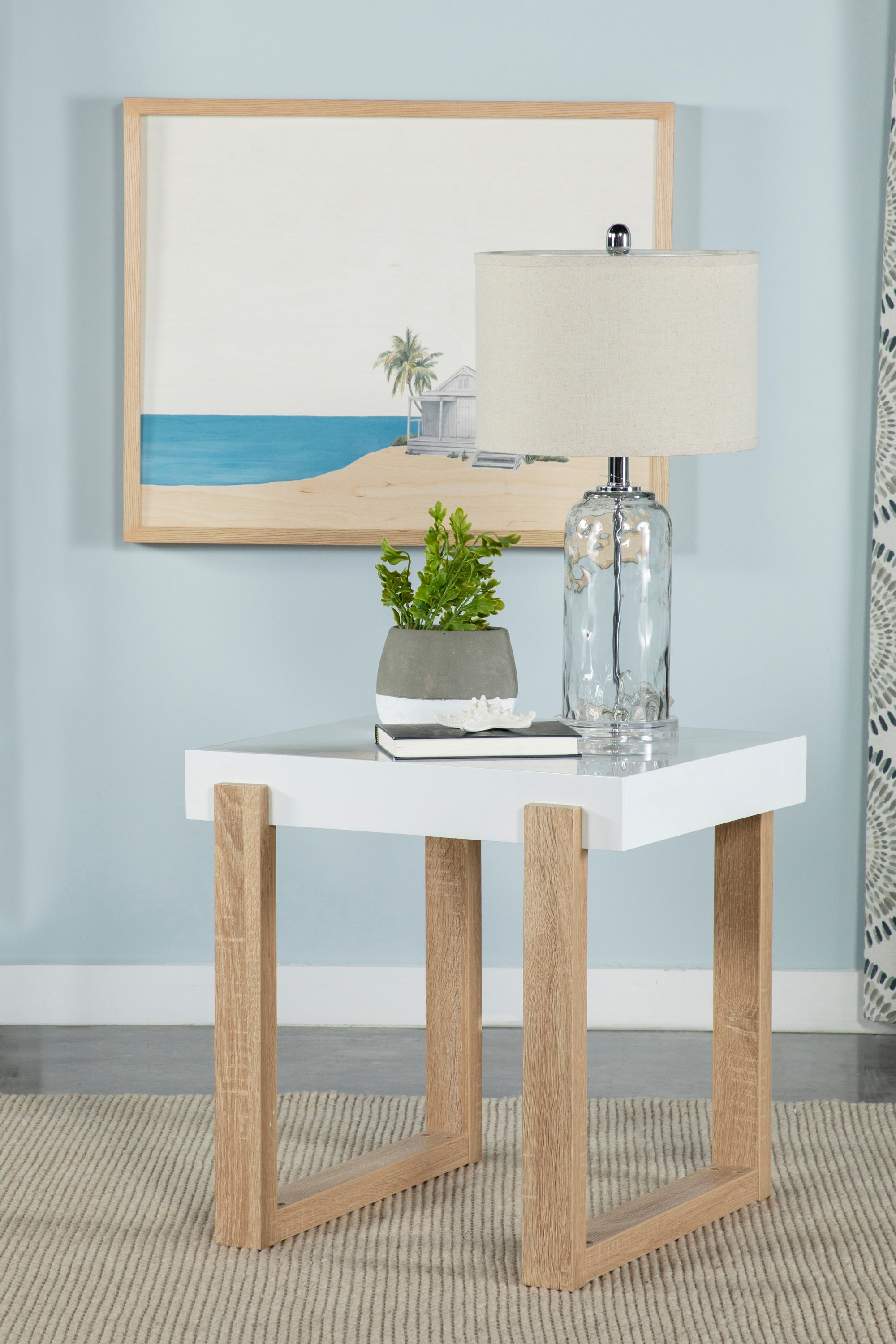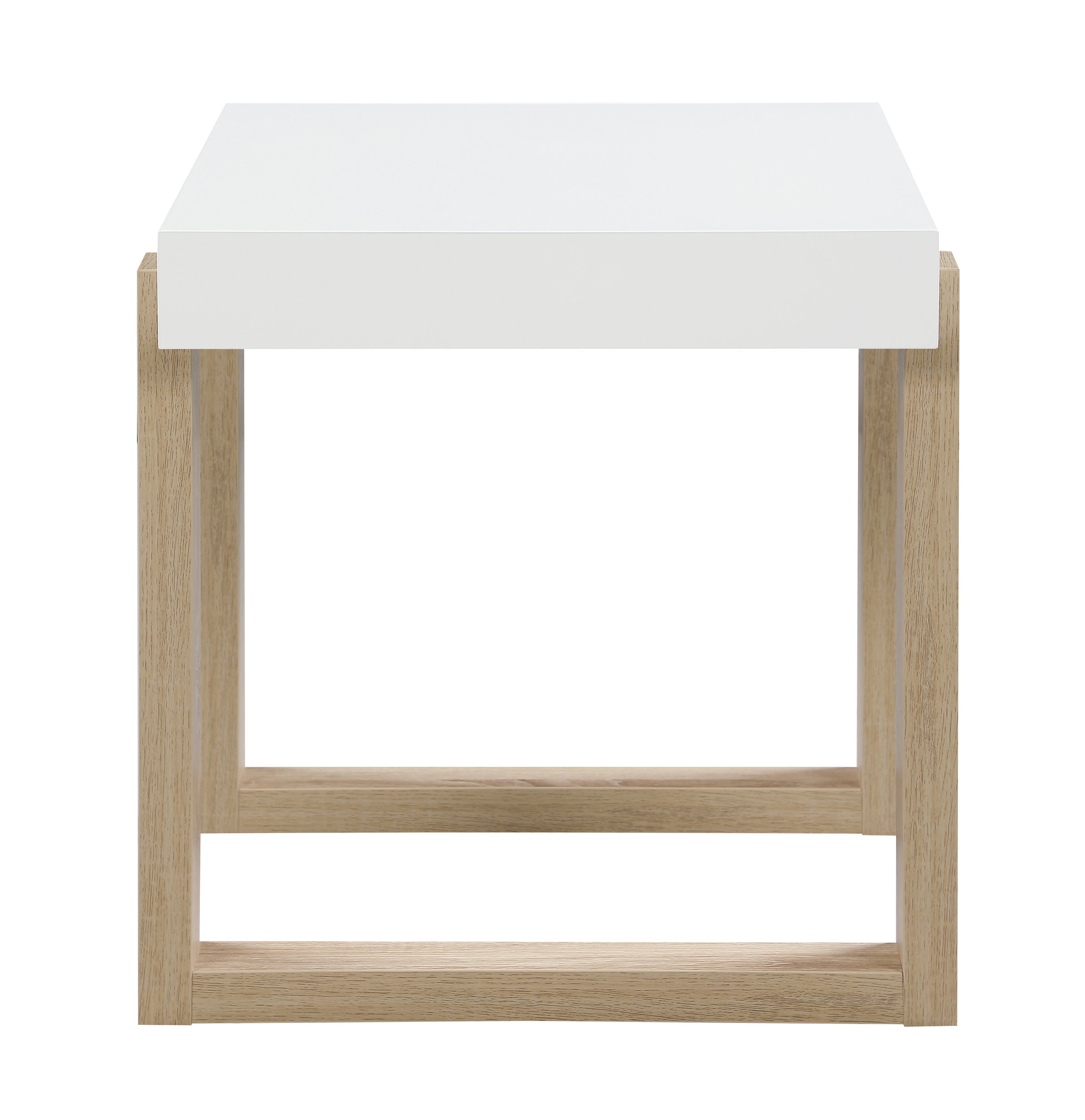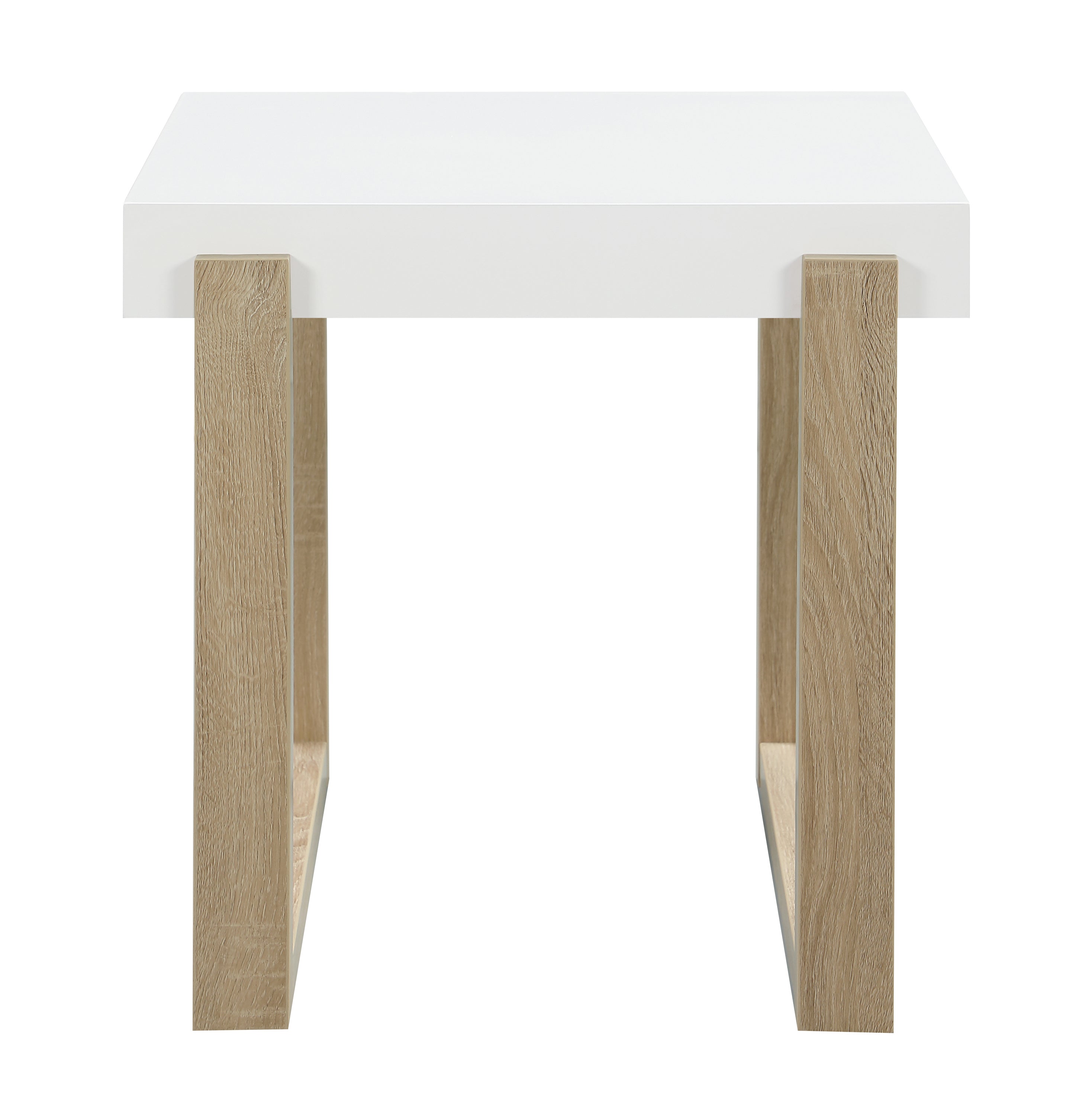 This modern end table offers a playful, whimsical shape and cheerfully bright hues. A white high gloss surface covers a thick square tabletop, which rests casually in a double U-shape design base. The sled style base lends a light natural hue that offers a subtle contrast with its variegated wood grain patterns and hues. Place this end table next to an accent chair for a minimalist element. Or keep it beside a sofa and rest a table lamp for extra illumination.