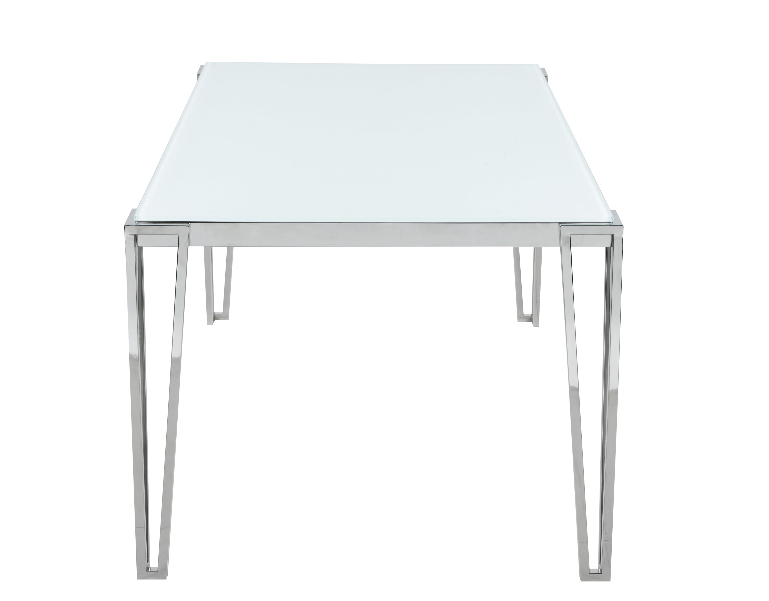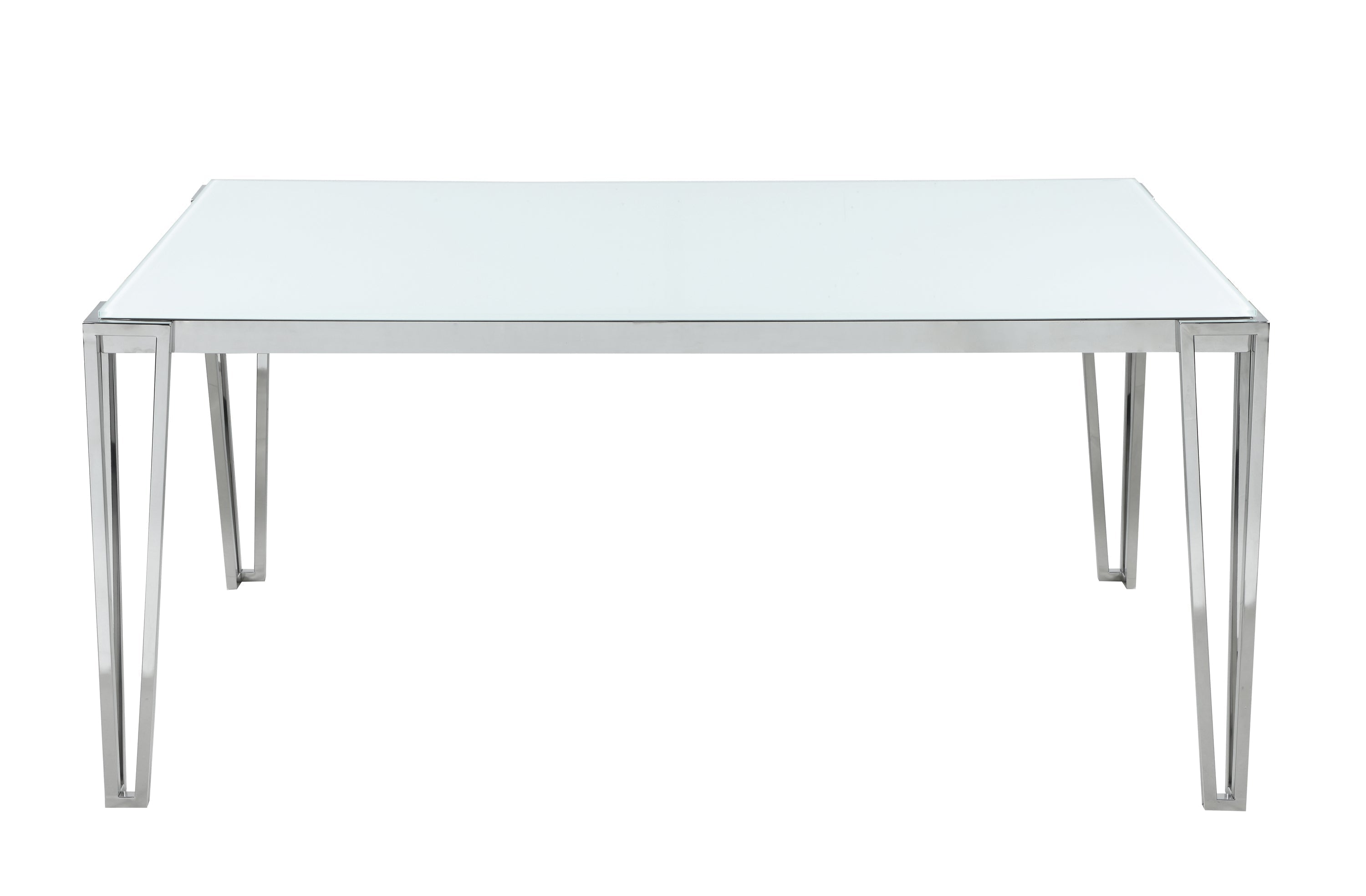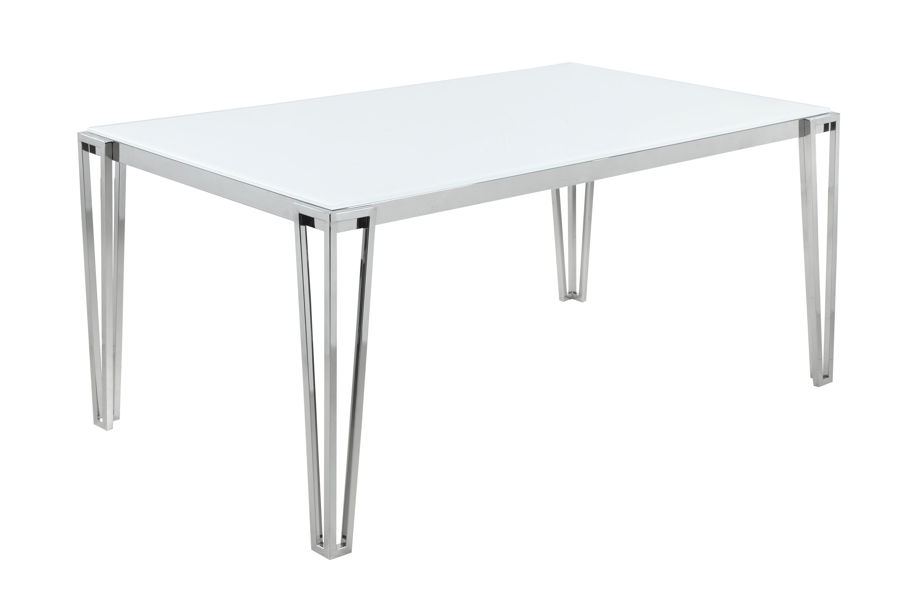 Perfect for contemporary dining rooms, this rectangle dining table offers seating for up to six guests. Designed with clean lines and a minimal silhouette, this table can be used a more casual modern piece or elevated into a formal dining table. Built of sturdy stainless steel metal with a polished chrome finish, it's easy to maintain and made to last for many years in the home. Each hairpin-inspired leg is made modern with slim corner brackets. Rested on top of a white frosted tempered glass tabletop surface that can complement your home's already existing colors.