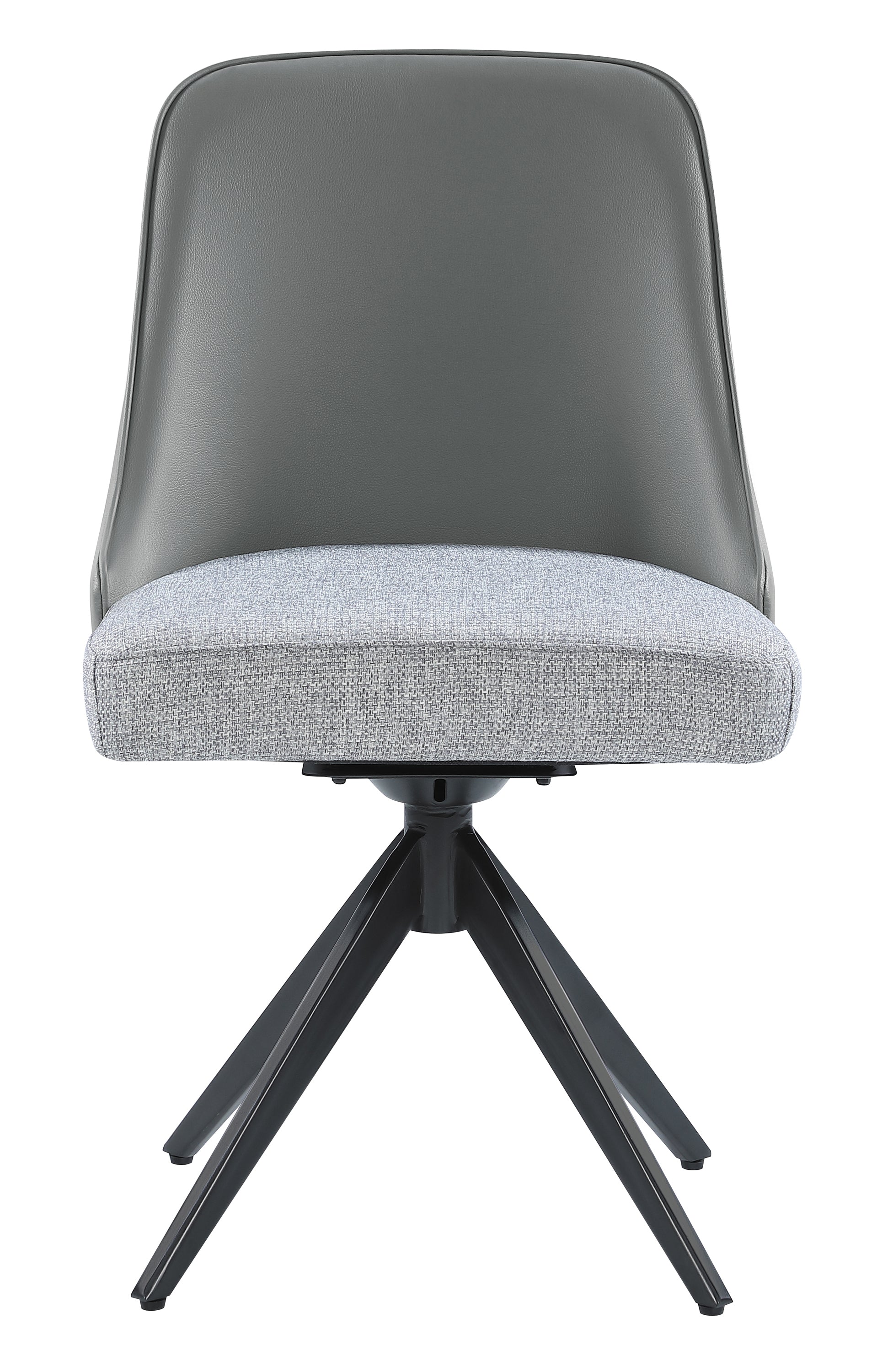 Retro-inspired influences elevate this modern dining chair into a playful seat at the table. Designed as a swivel chair, adults and kids alike will appreciate this conversational furniture piece, rotating to refill beverages and chat with guests. With a bucket-like seat, this upholstered chair is upholstered in a smooth gray leatherette across the backrest and a light gray textured fabric on the seat for a two-tone effect. The swivel base extends and flares outward dramatically with black gunmetal finish legs. Slide this chair up to a dining table or even an office desk for a chic, almost vintage vibe.