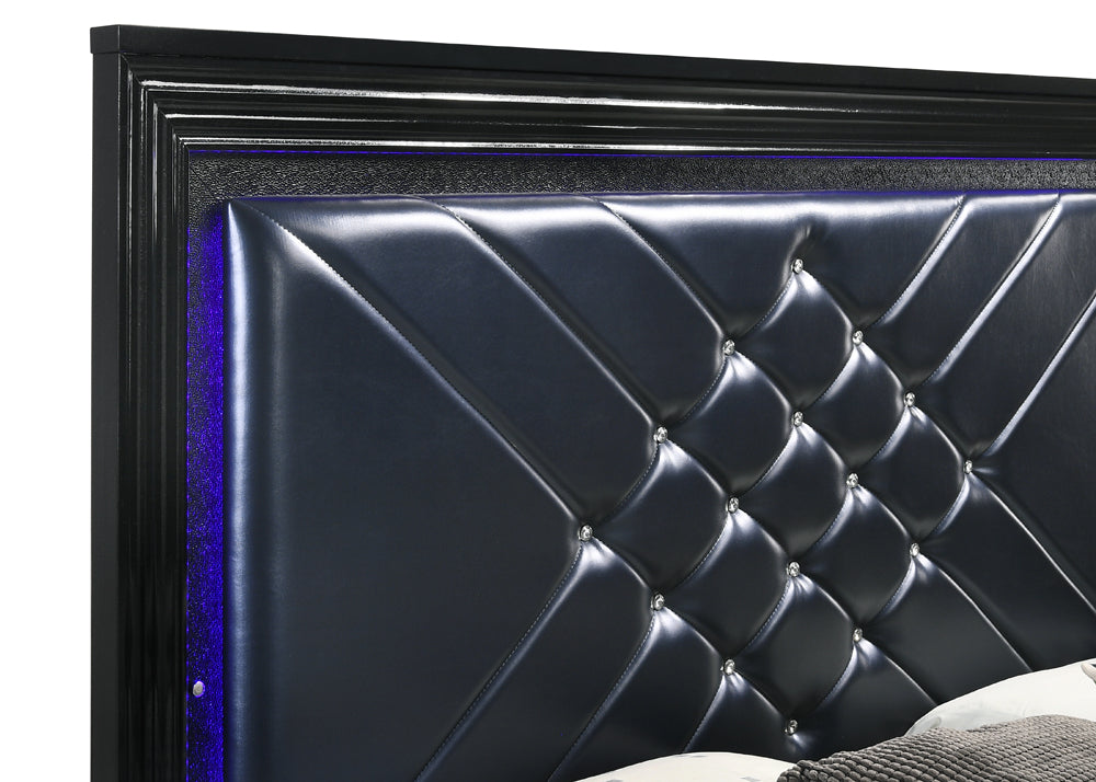 Every bedroom instantly becomes more alluring with this LED light-up bed. A faux leather argyle panel headboard is adorned with crystal-like tufting and lighting around the frame. Molding accents surround the frame and a deep black with midnight star finish makes this panel bed an eye-popping display. The single panel footboard is enveloped in a molded frame for stylish appeal. This piece is supported on bracket style feet and made from quality Asian hardwood.