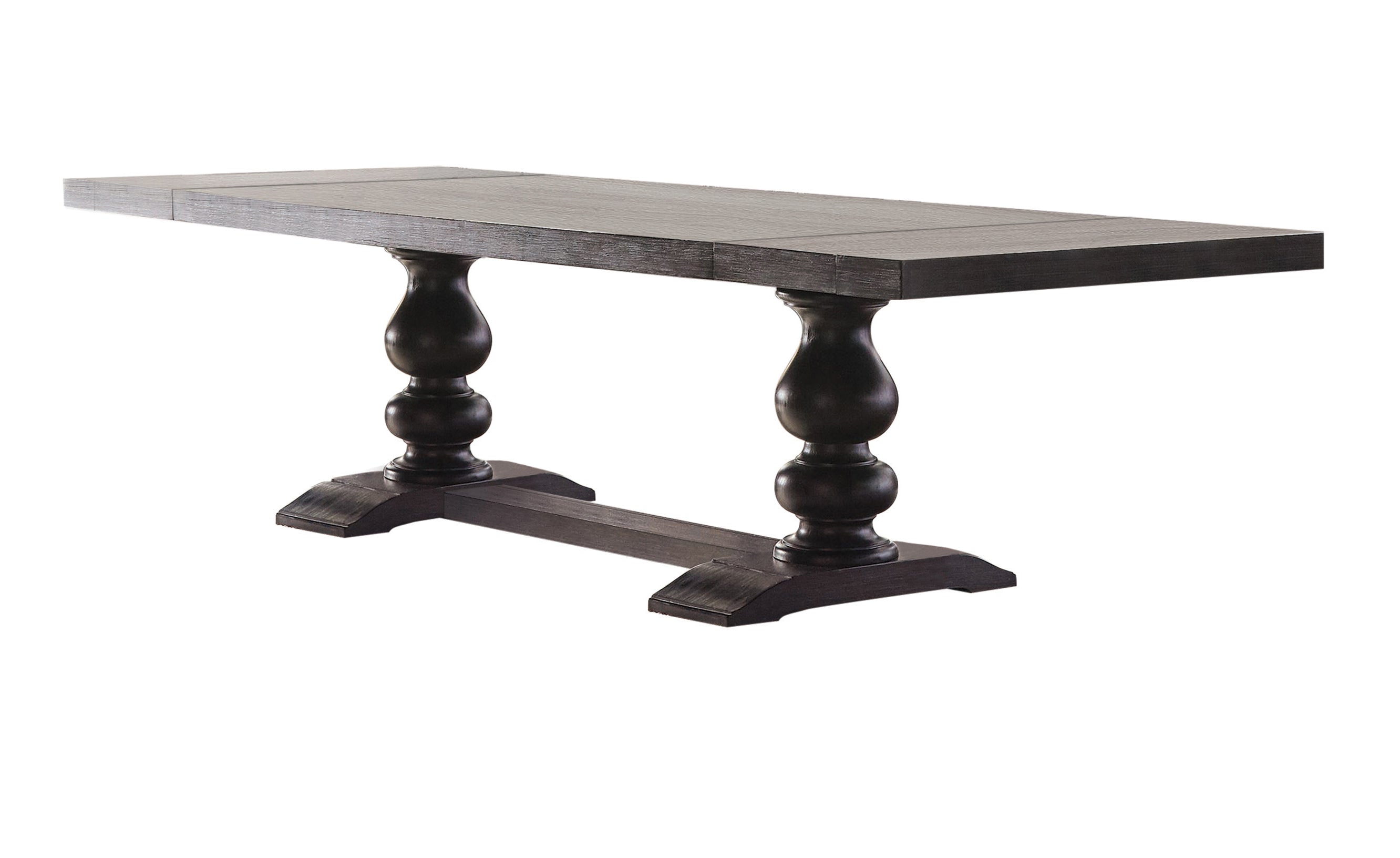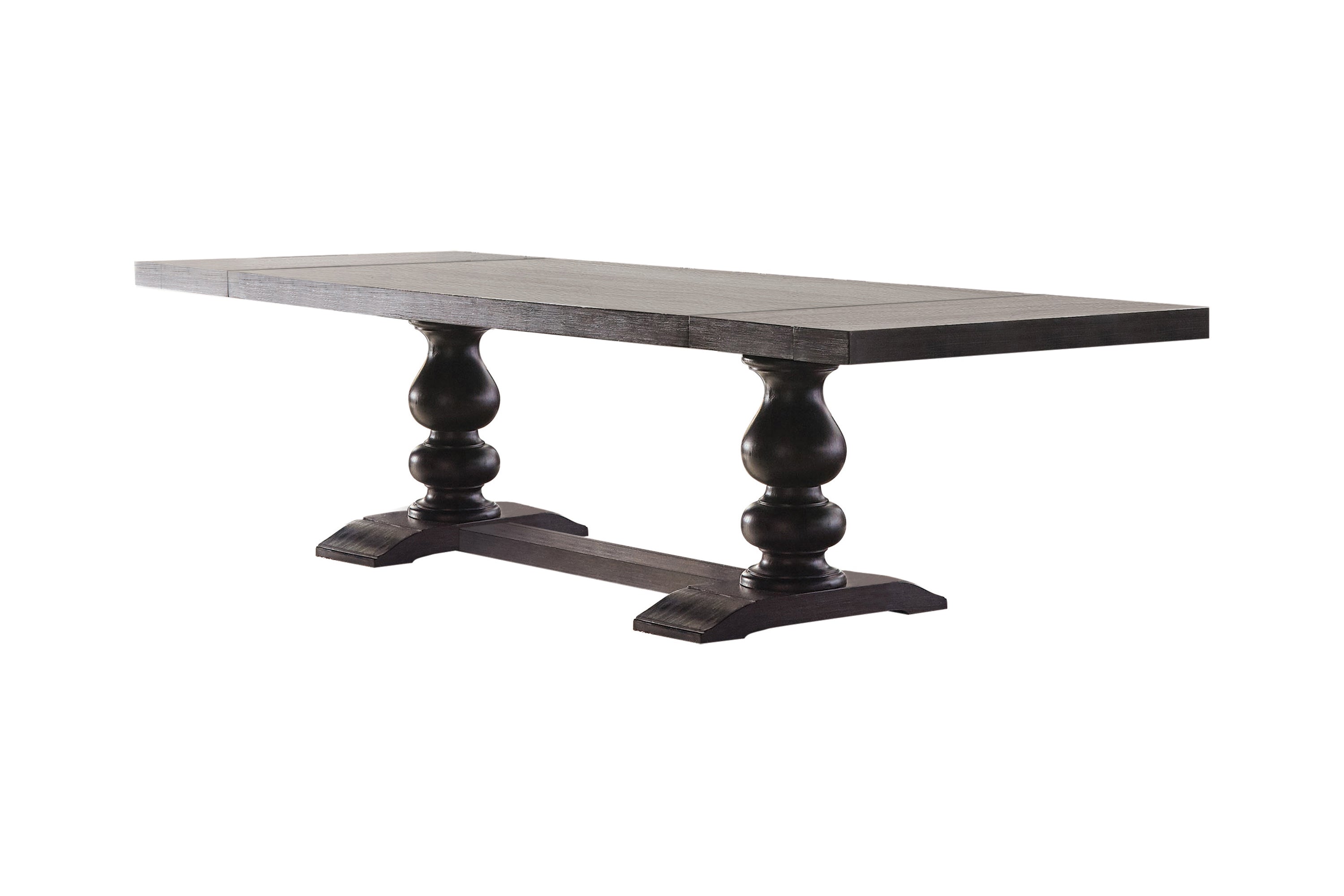 Celebrate a curvy, dramatic silhouette that adds an artful elegance to a formal space. This formal dining table offers a lush antique noir finish wood construction with a polished aesthetic. Its trestle-style base reflects sensual tapering and supports beautifully turned legs. Embrace a chunky profile that offers a solid look and feel. This elegant table is extra-long and ideal for a formal dining room.