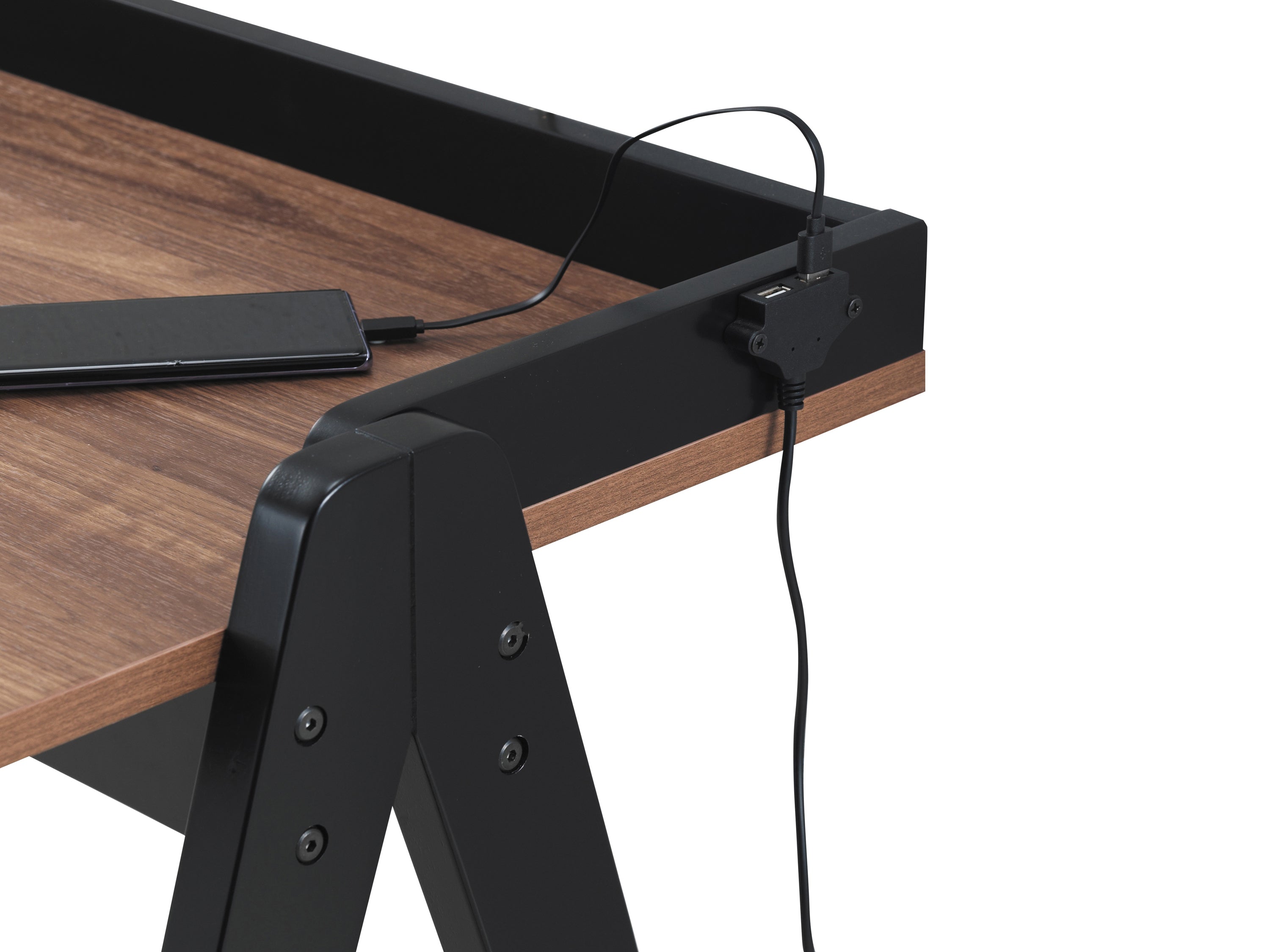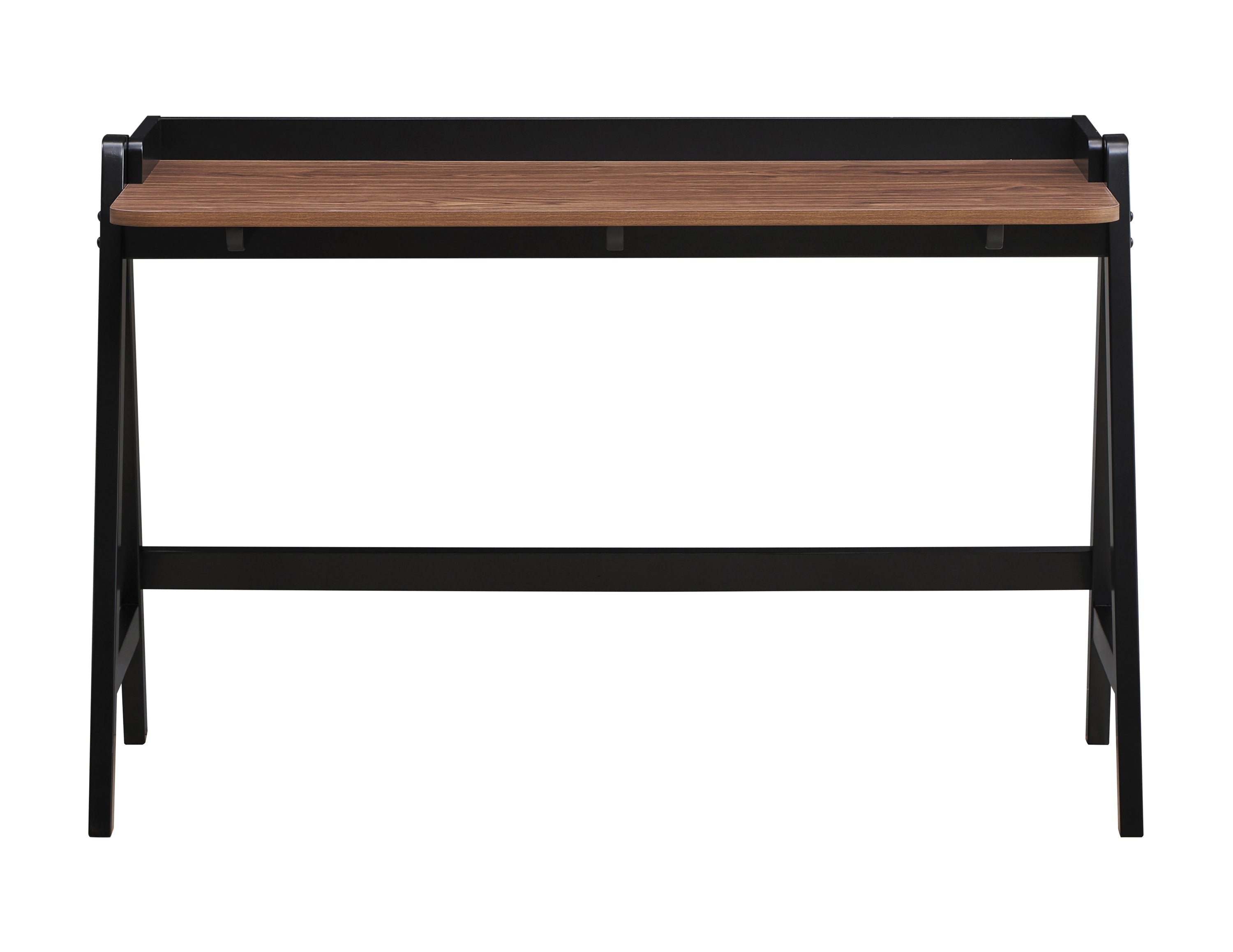 A modern take on a trestle-style drafting table, this industrial style writing desk offers a minimal aesthetic to a home office space. A black trestle base in an A-frame design supports a clean tabletop surface in a rich walnut finish, lending a colorful contrast to the piece. Raised ledges provide a flush wall contact, keeping everything in place. Thoughtful modern touches like dual USB ports invite you to charge electronic devices as you work too. With a compact design, this industrial style desk is a perfect space-saving solution for smaller teen bedrooms and remote home office setups.