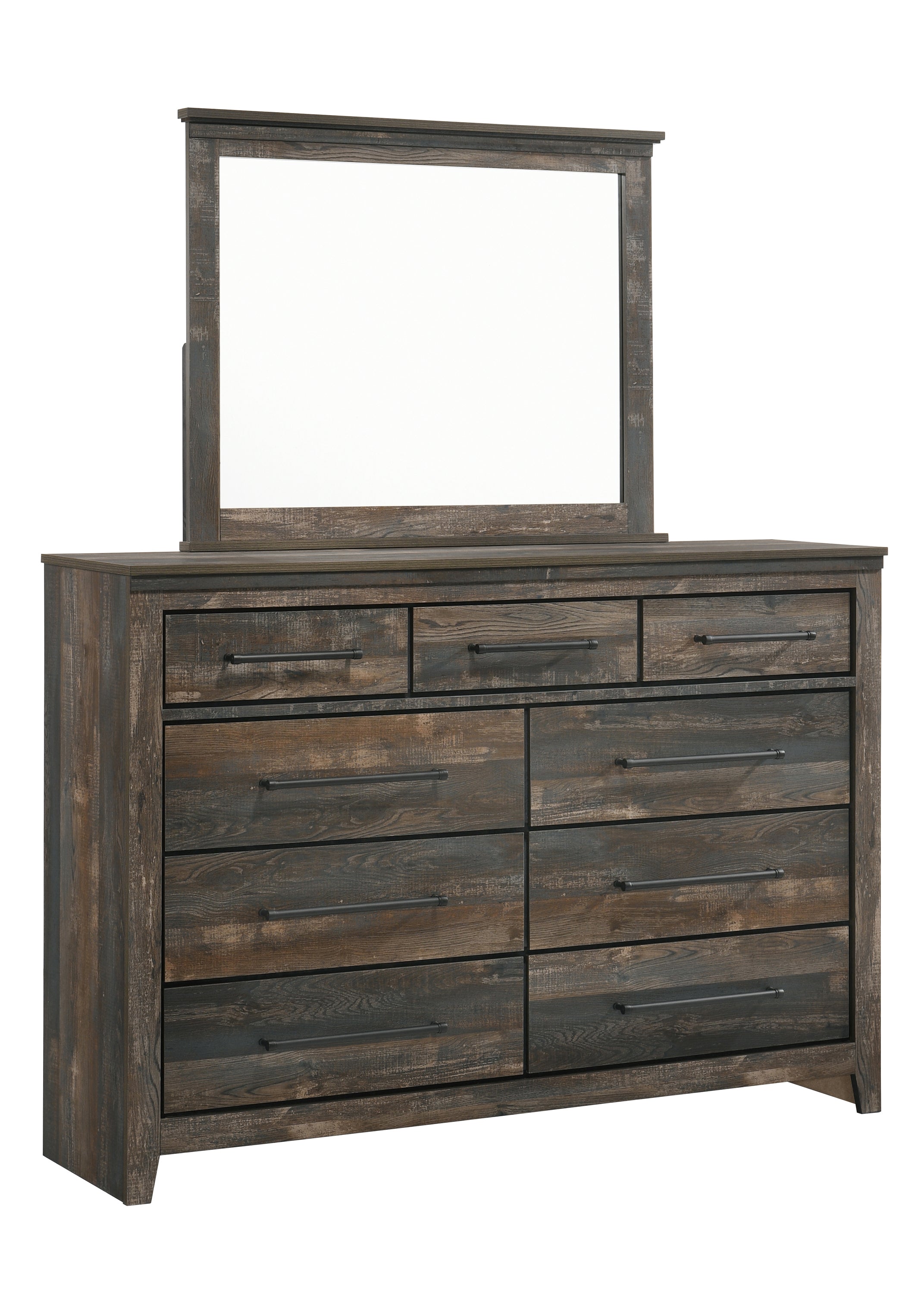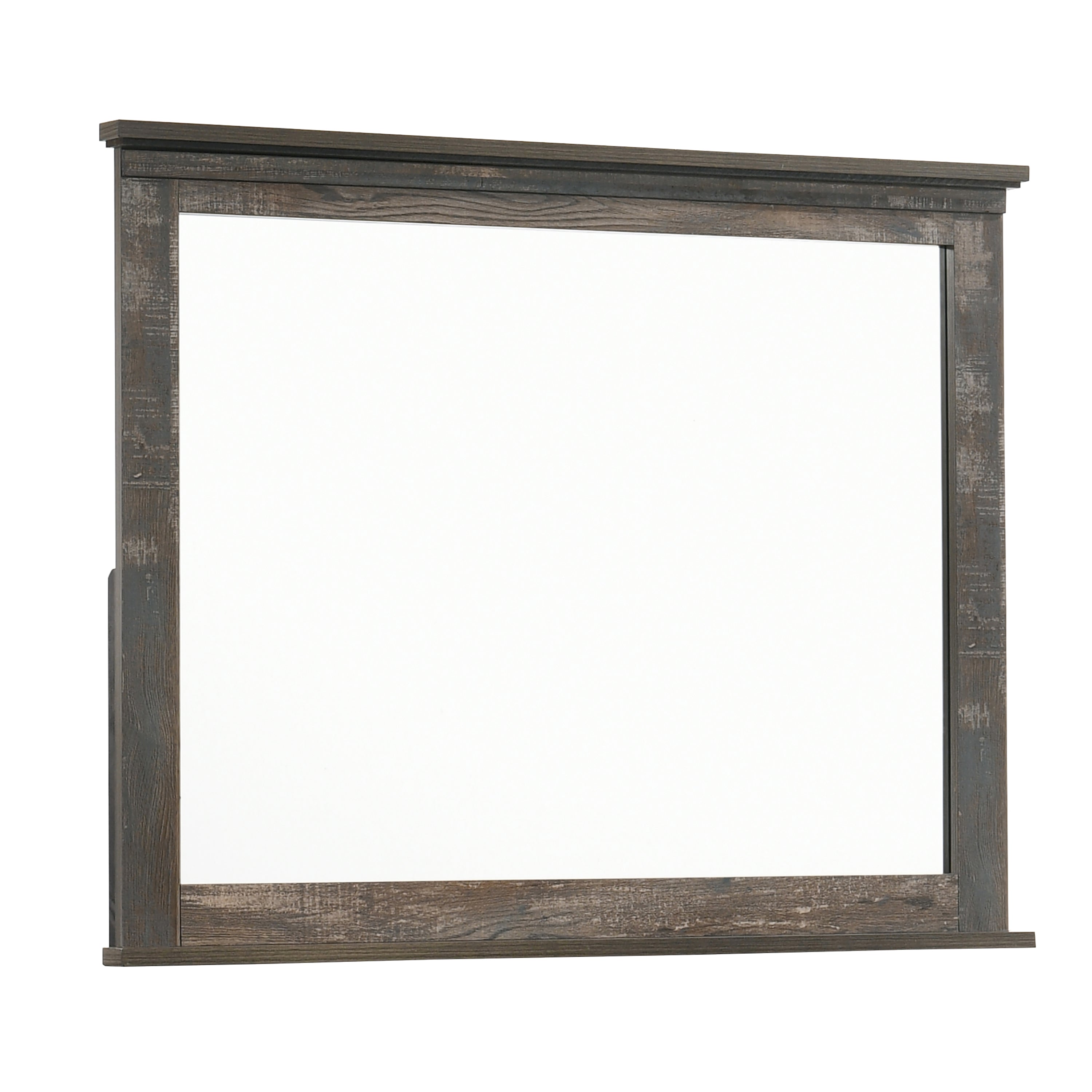 Understated and rustic, this simple mirror brings plenty of cabin-esque vibes to your sleeping space. Its crafted from quality 3D paper veneer for a lasting design. The warm weathered brown finish enhances the incredible rustic vibe of this piece. Its rectangular shape makes it a versatile piece, while a simple crown molding accent at the top of the frame brings additional aesthetic flair. Place this piece upon the matching dresser for an entire look you can't resist.