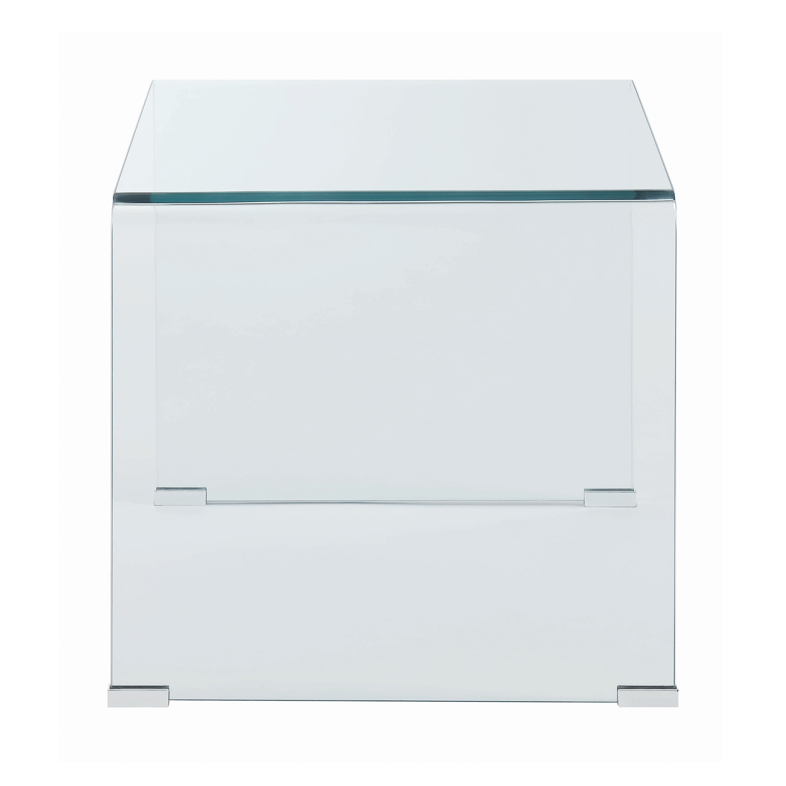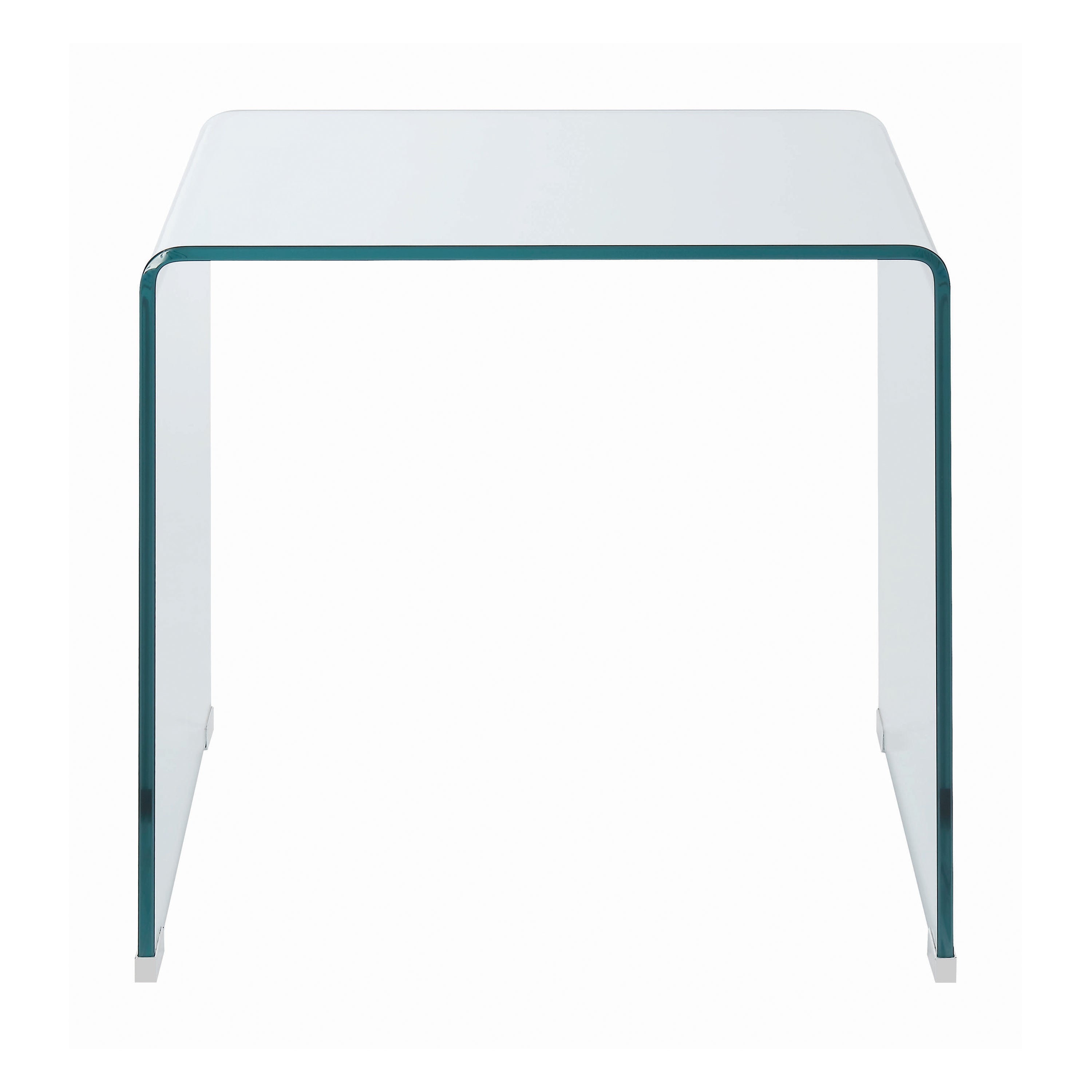 This splendid end table has a contemporary design that's also enduring. This single-piece table features a clear glass-like material that adds a unique look to the home. Square table top is roomy enough for a decorative modern lamp and a handsome vase or small sculpture. It has an open space design instead of a base so you can put a small potted plant directly on the floor beneath the table top. Can be put beside a contemporary sofa or against a wall as a standalone piece.