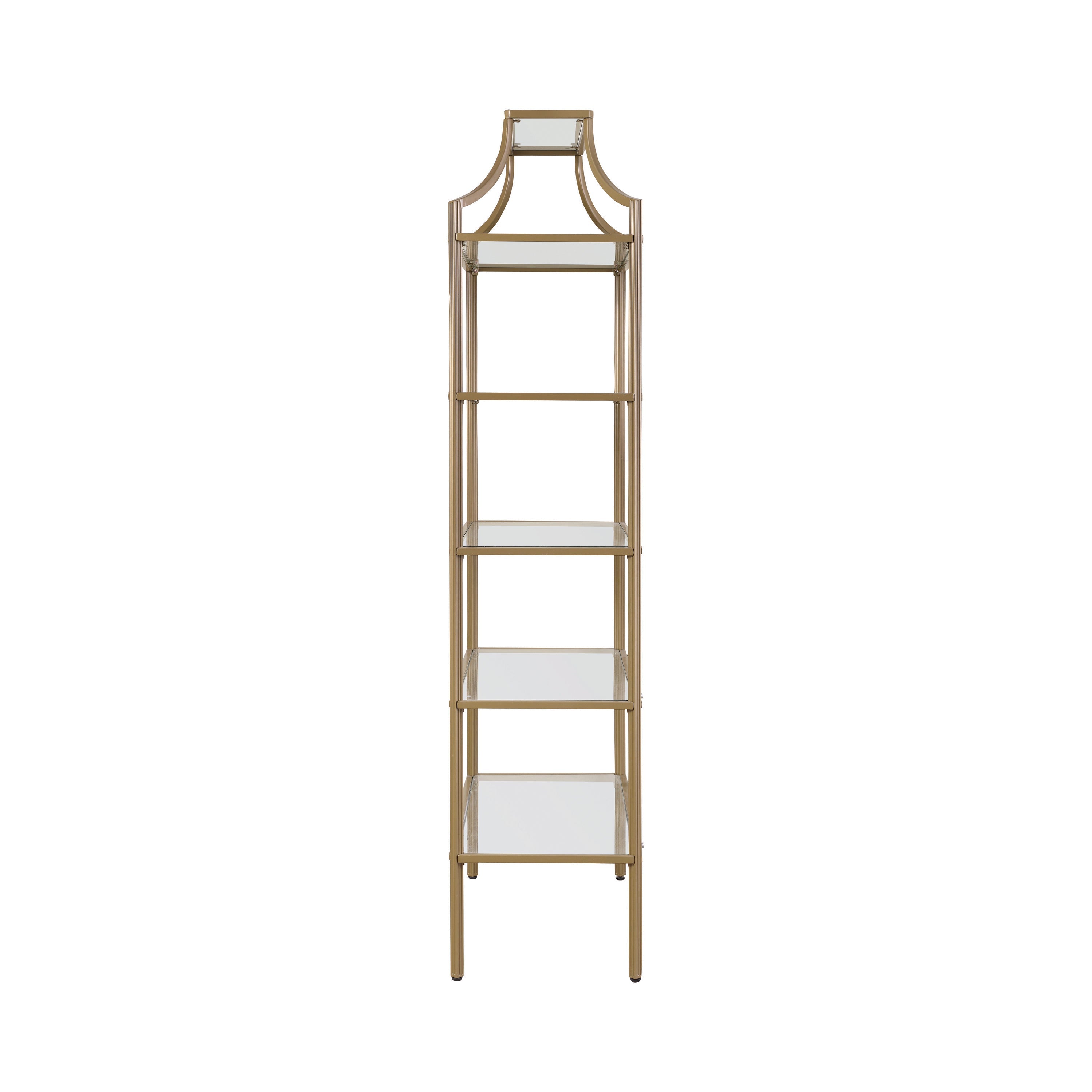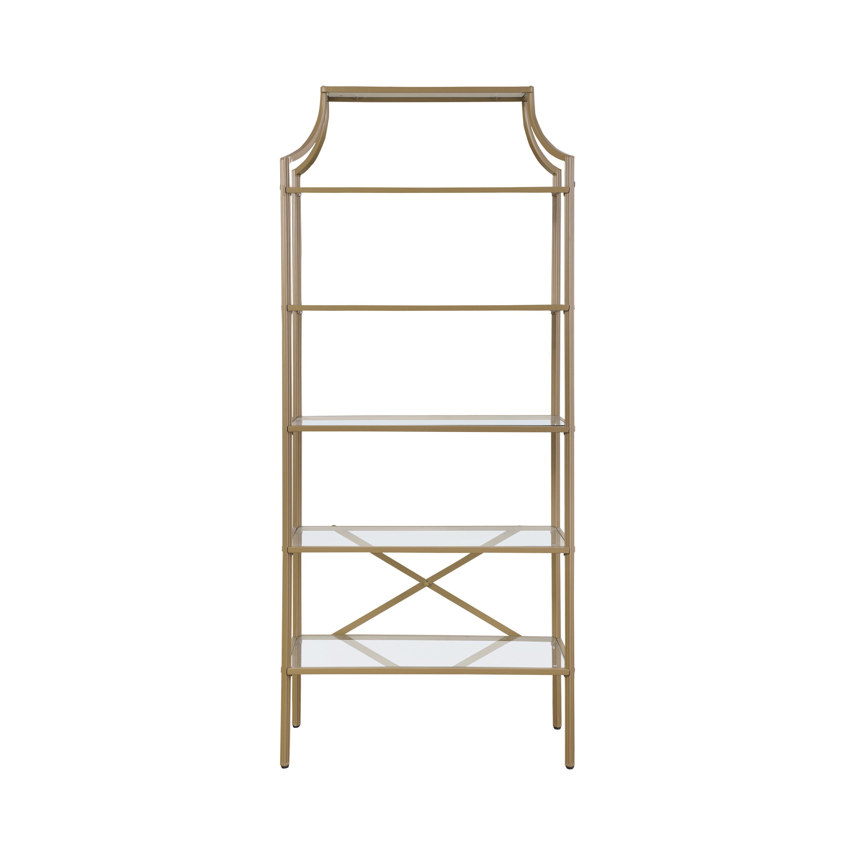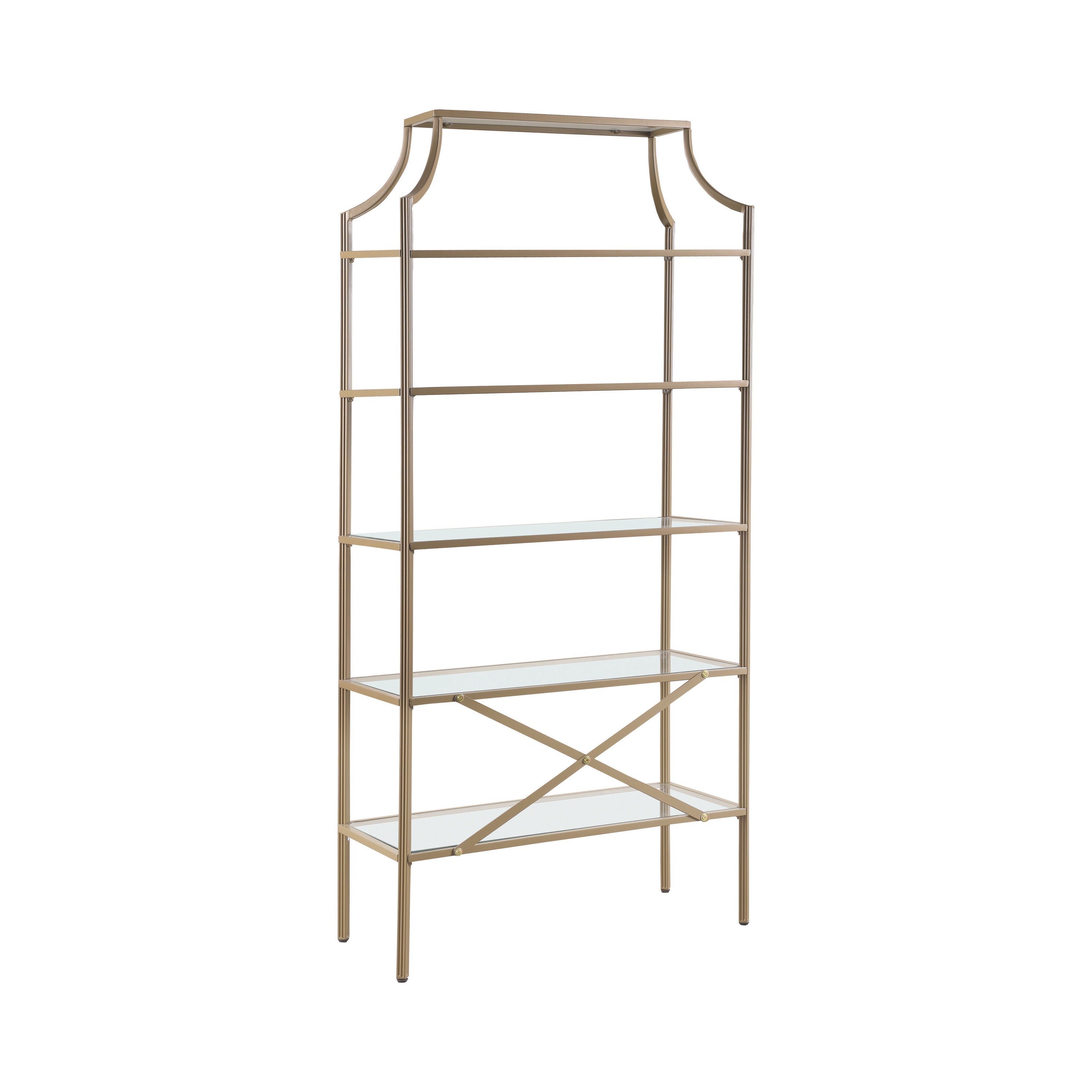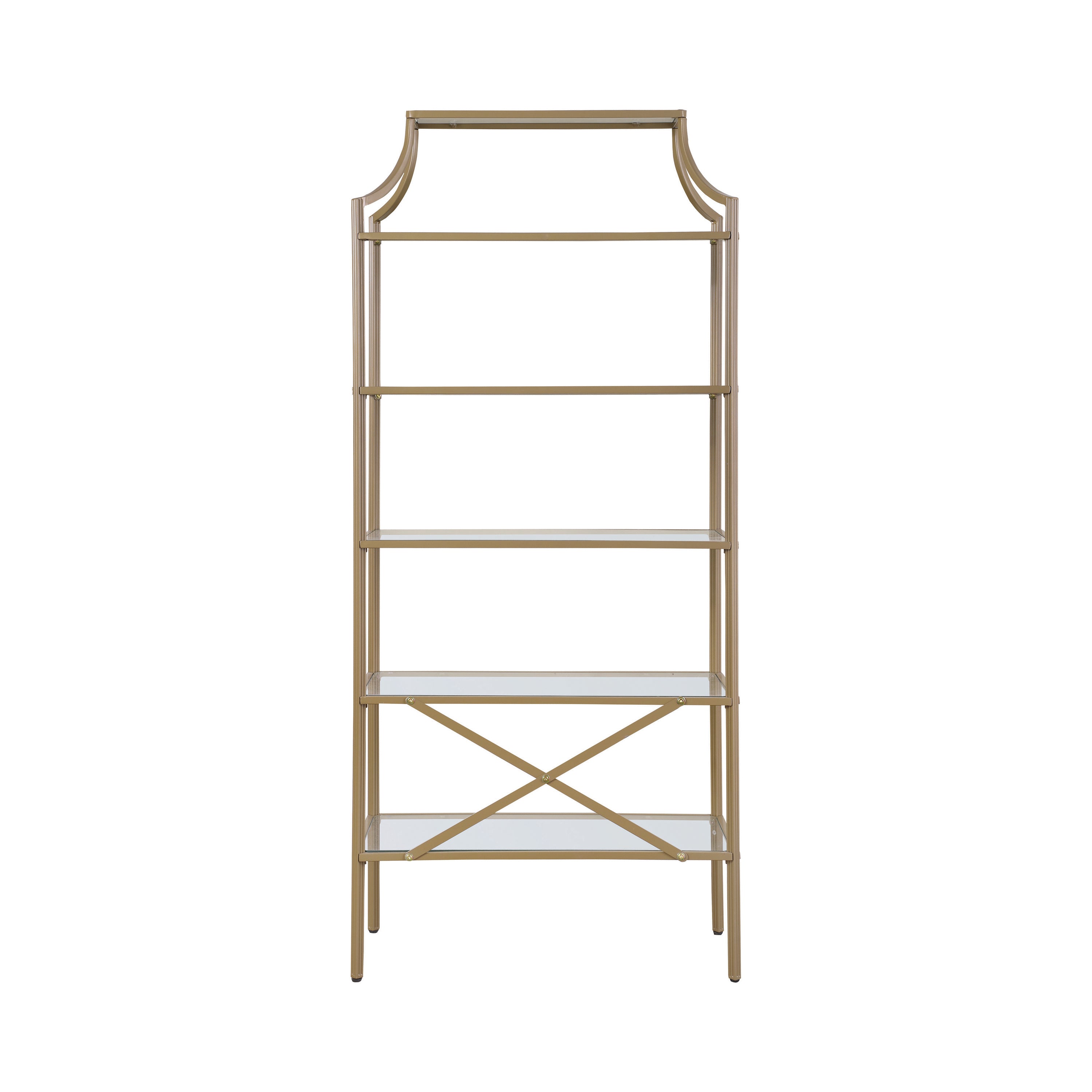 A call for strength and style gets answered by this bookcase. Contemporary style allows for easy placement within your space. The stylish metal frame in gold creates conversation. Enjoy durability as all glass elements are tempered. Updated unit boasts five (5) open shelves for use as storage or display.