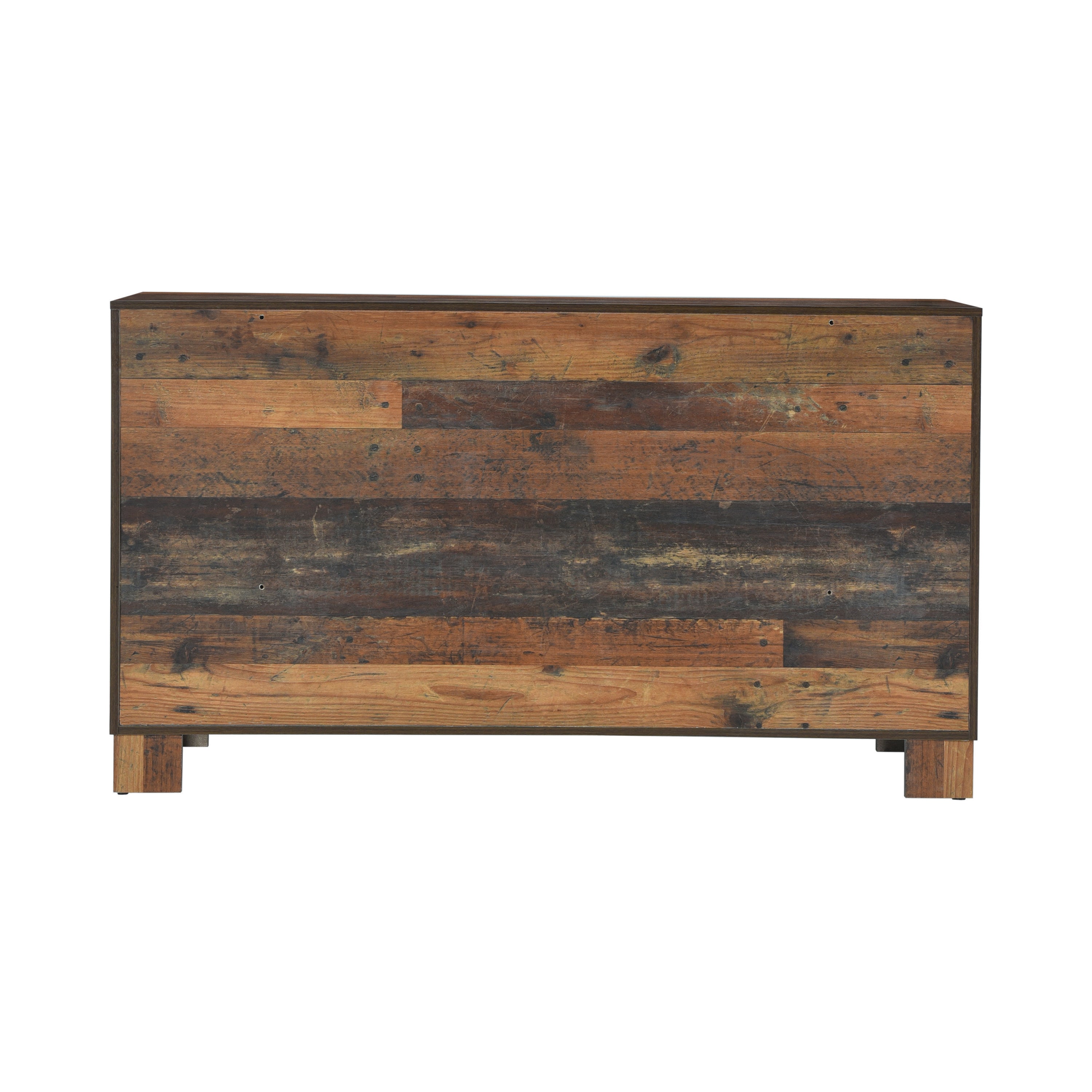 Create a forested retreat in a contemporary master or guest suite. Notable gradations stand out in the rustic pine finish of this six-drawer dresser. Strive for a cabin motif in this contemporary dresser with dark bronze matte metal hardware and linear styling. Finished drawer boxes with front and rear English dovetail construction and center drawer glides ensure smooth operation, as drawer space is plentiful in creating room for essentials. This inspiring dresser transforms a conventional space into a woodsy cabin setting.