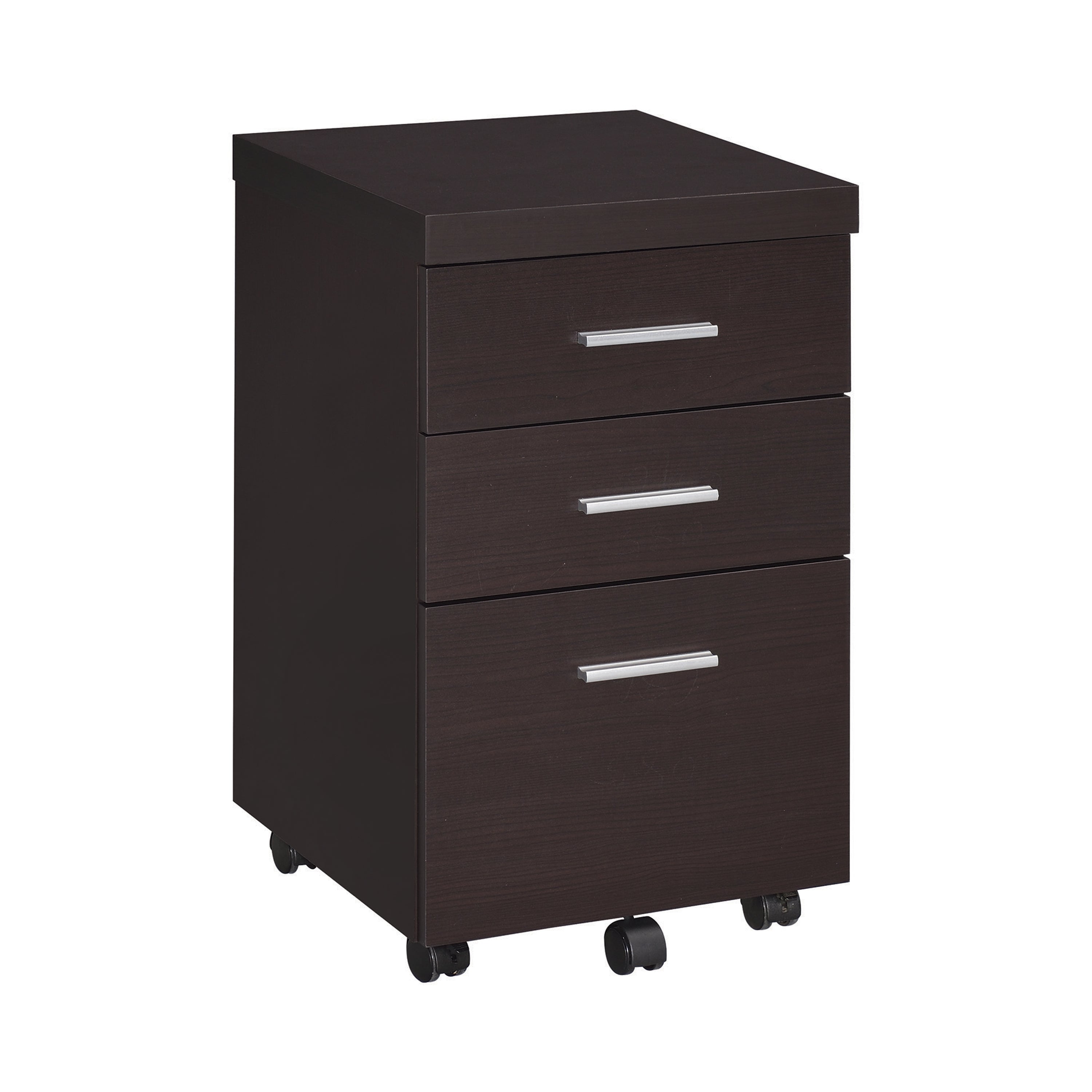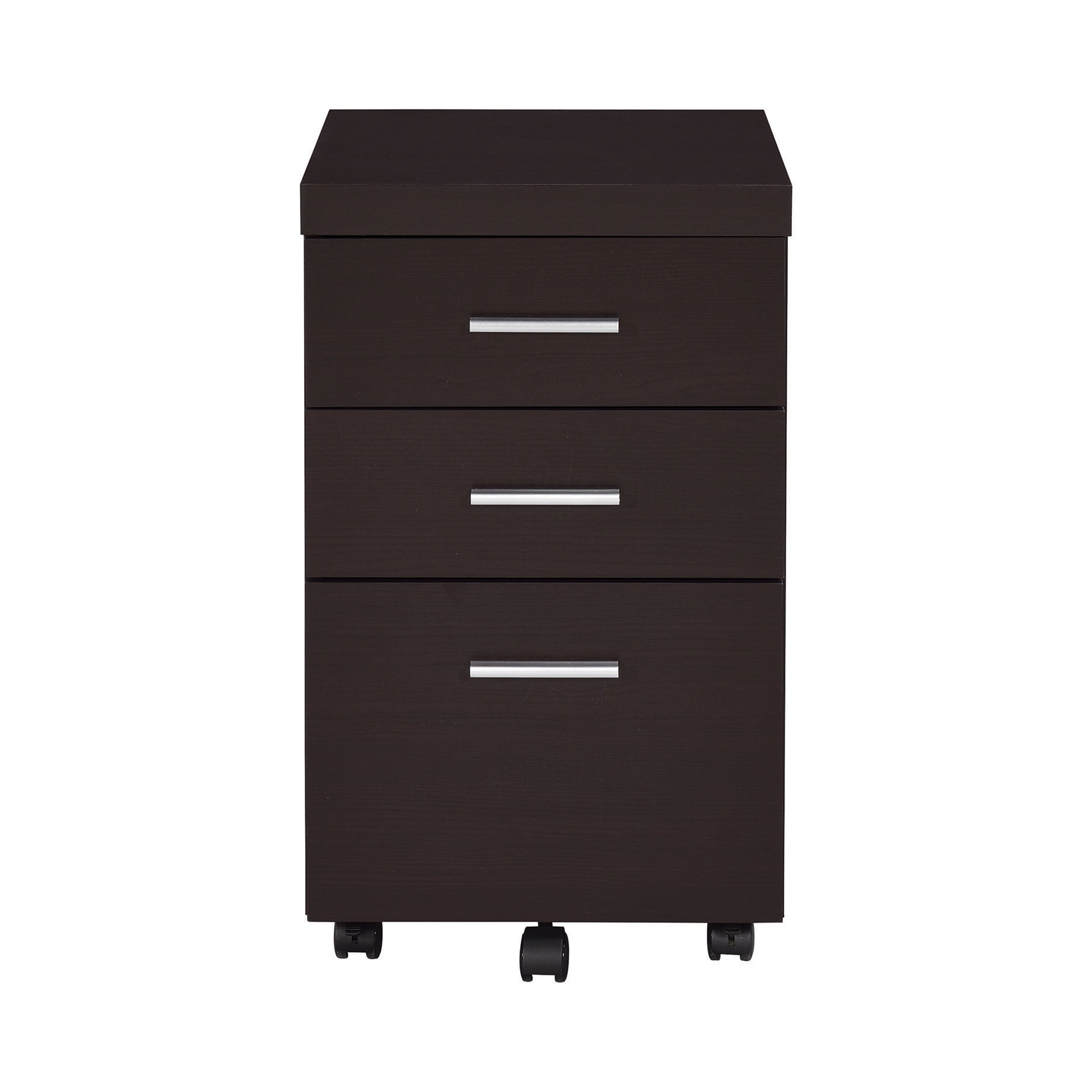Add no-nonsense glamour and functionality to a den, office, or even a bedroom. With casters built in, this file cabinet can be easily transported from room to room. Its cappuccino finish blends elegantly with silver handles, adding attractive appeal. Crafted from top quality materials, this cabinet is as sturdy as it is stylish. It combines perfectly with a desk to create a convenient workstation.