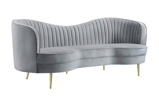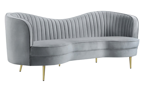 Adding a chic, mid-century inspired vibe, this elegant sofa delivers the magic of a fashionable interior design period while lending a sophisticated anchor piece to an upscale living space. Embrace the iconic kidney silhouette known for its era, making the most of alluring curves. This sofa is fully encased in solid wood and covered in soft, supple gray velvet. Dressed up with tailored, vertical channels on its interior back, dimensionality becomes a key feature. Gold finish stainless steel tapered legs round out the list of charming attributes, making this a go-to piece for a stylish modern or transitional space.
