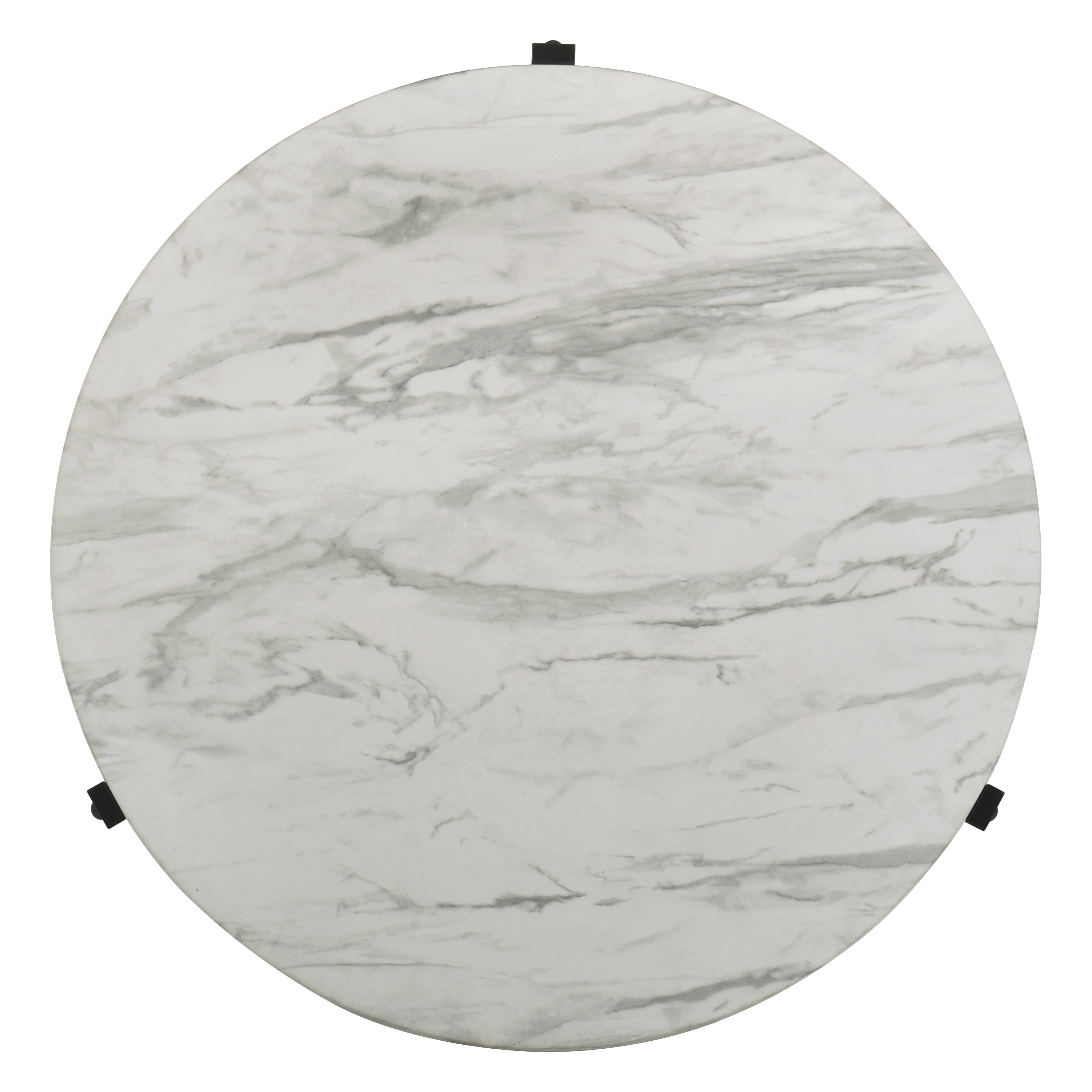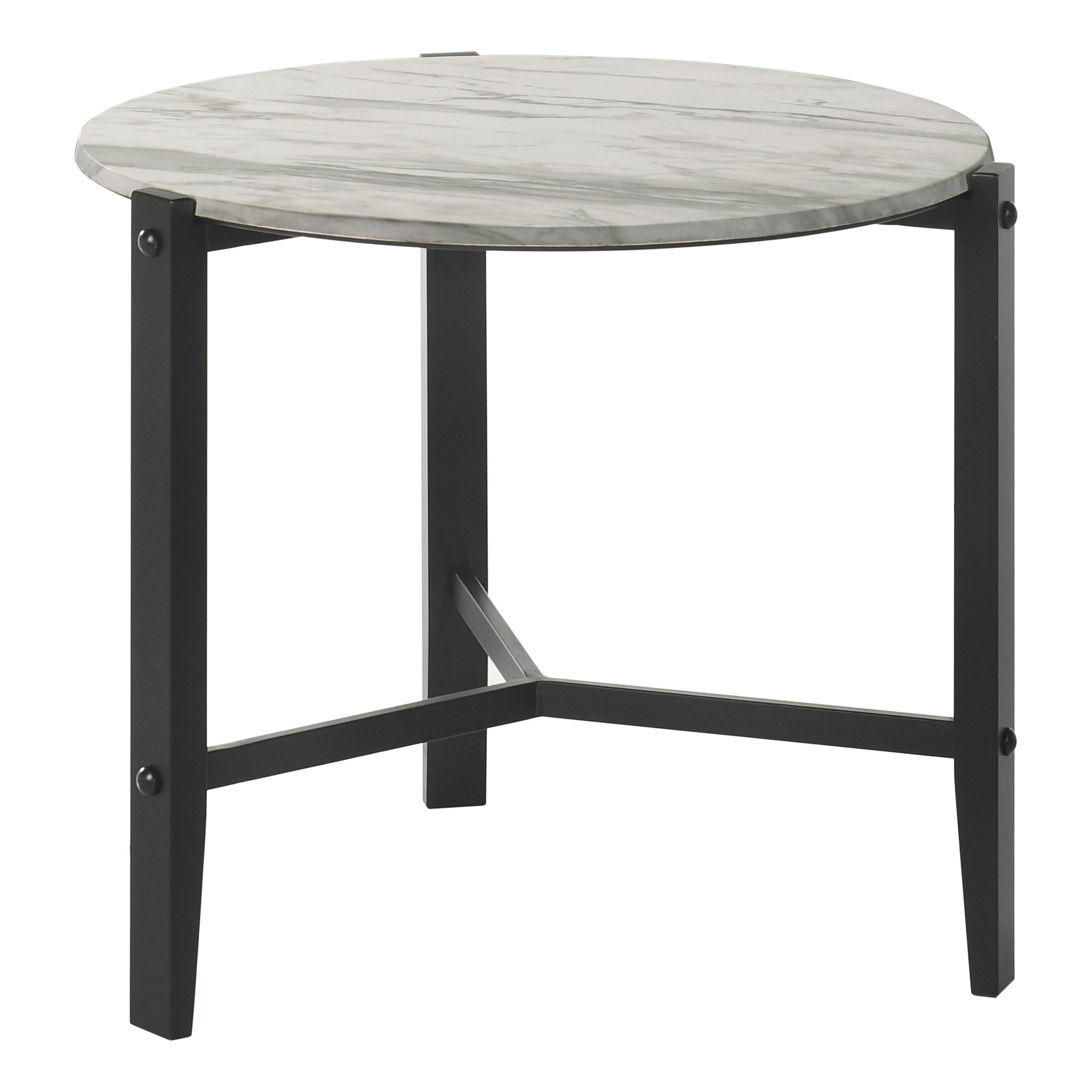 Sleek lines and a minimal aesthetic come together in this modern end table. A tripod-like base with slim black metal legs offers a stand that supports a floating round top for an edgy look. The round top also offers a textured feel and a faux white marble-inspired design, complete with subtle striations that offer a striking visual interest. The tray like top rests gently inside the stand, offering up ample table space for a table lamp to illuminate an accent chair or sofa. The contrasting tones of this end table also offer it up to various color palettes and even existing decor.