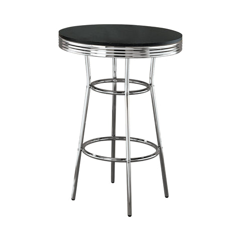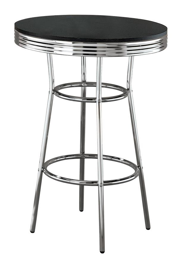 Go way, way back to the 50s with this soda fountain bar table. Black table top is wrapped in retro chrome rim. Chrome legs angle slightly out and come with a round footrest and a decorative ring just under the top. Who knew retro could be so fun? All you need is a server on roller skates to deliver your vanilla ice cream float topped with hot fudge and a bright red cherry.