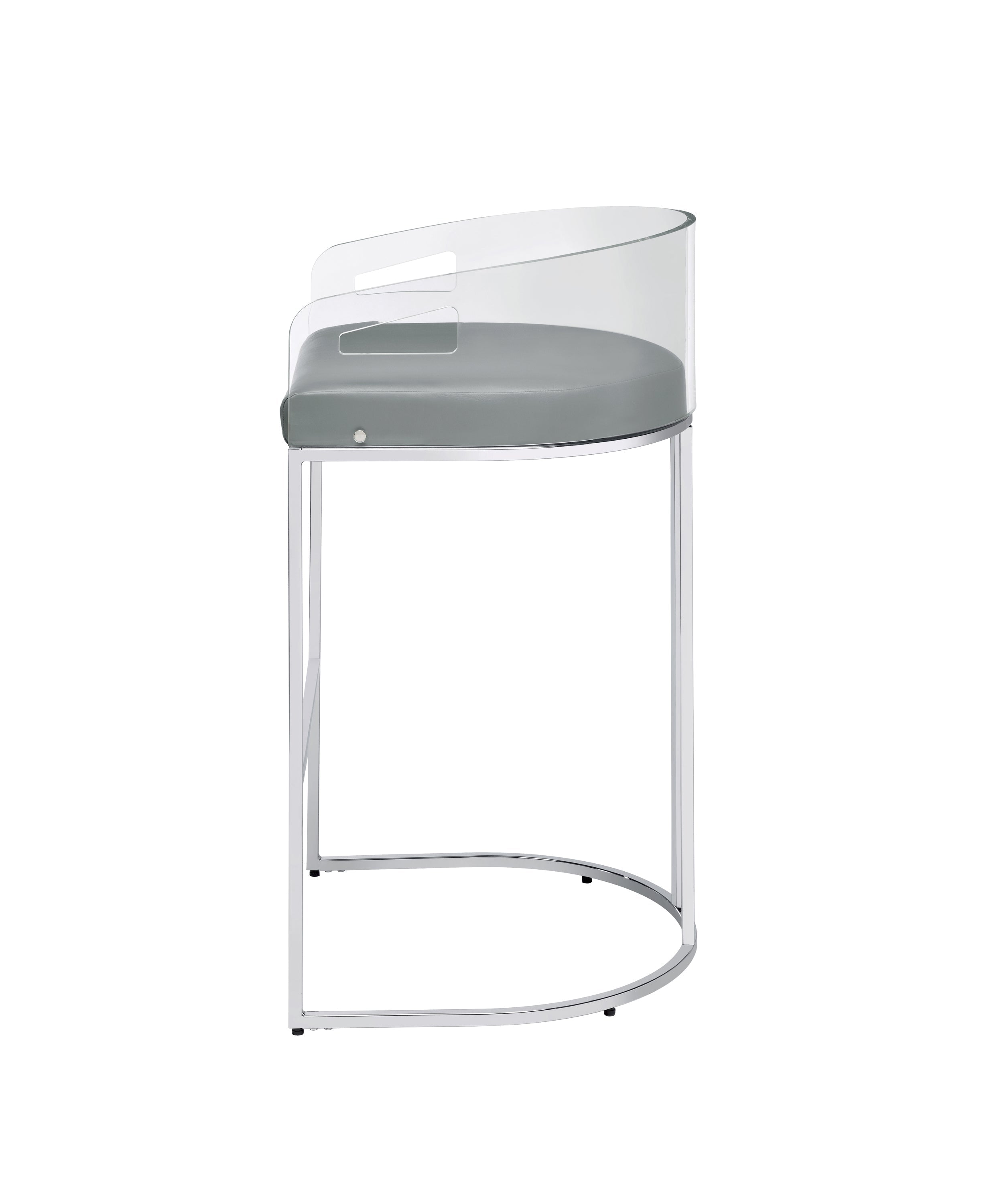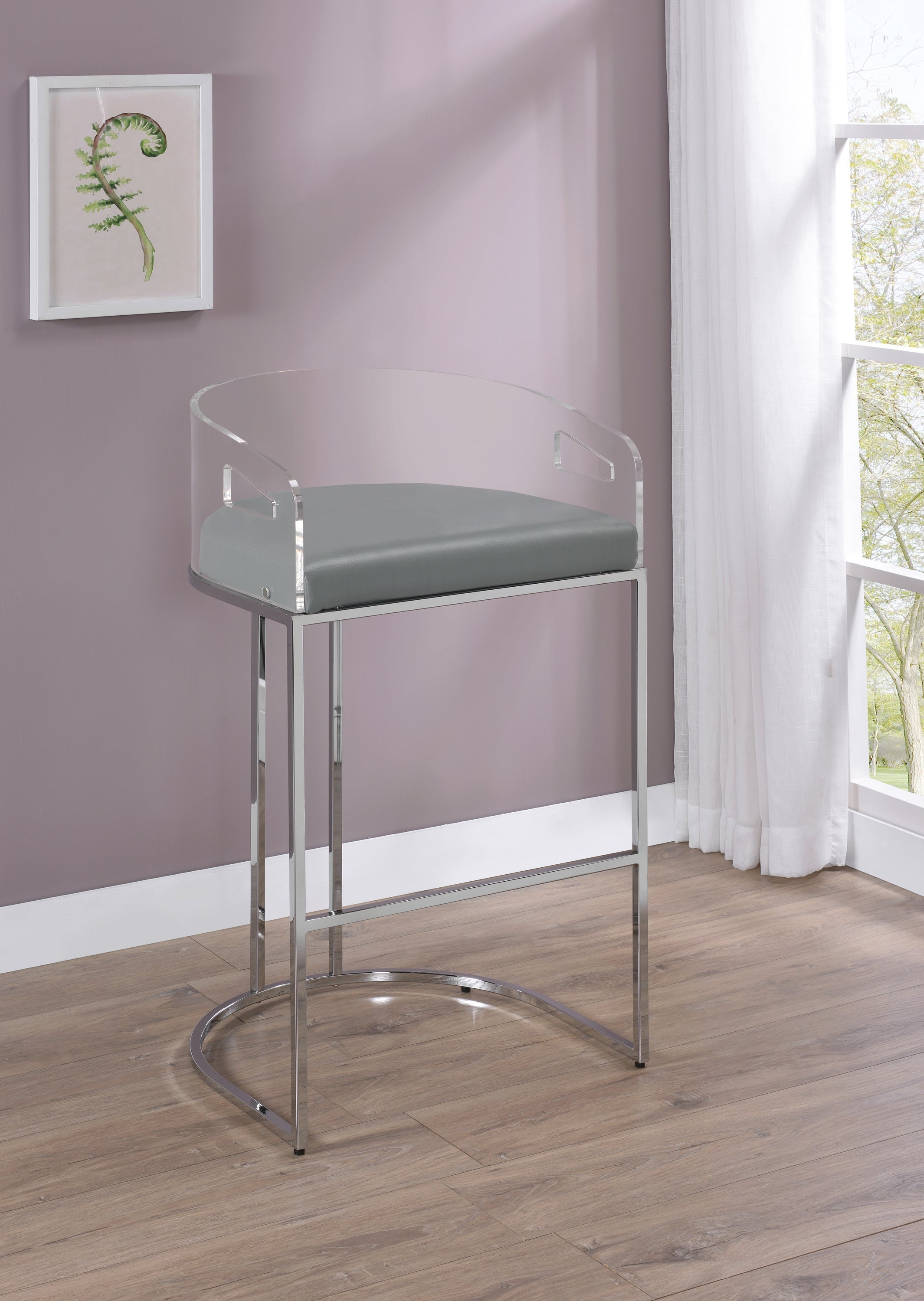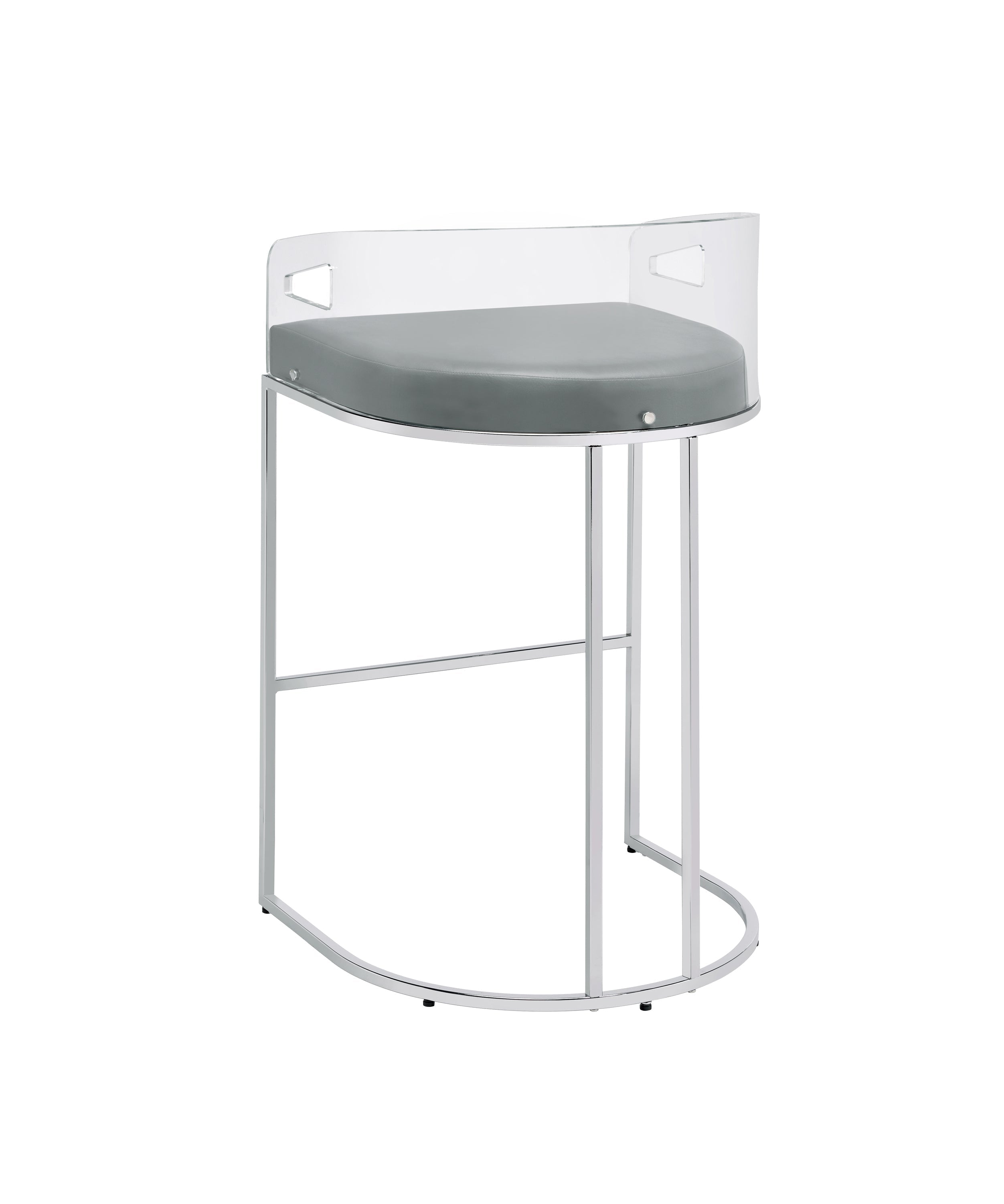 Ultra-modern with a retro-inspired vibe, this pair of stools make a striking piece to a dining room space. With a curved backrest in a clear acrylic material, each stool offers an open and airy design. Rest comfortably on a leatherette cushion as you dine or sip a cocktail. In addition, each stool is supported by a slim metal legs in a lustrous chrome finish and a base shape that mimics the rounded acrylic backrest. Pull up a pair of these stools to a kitchen bar or complete a compact home bar.