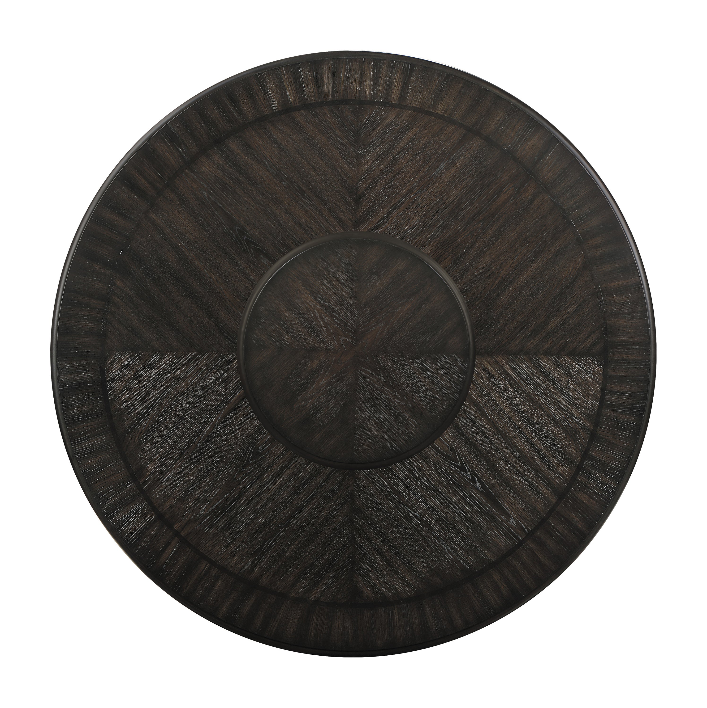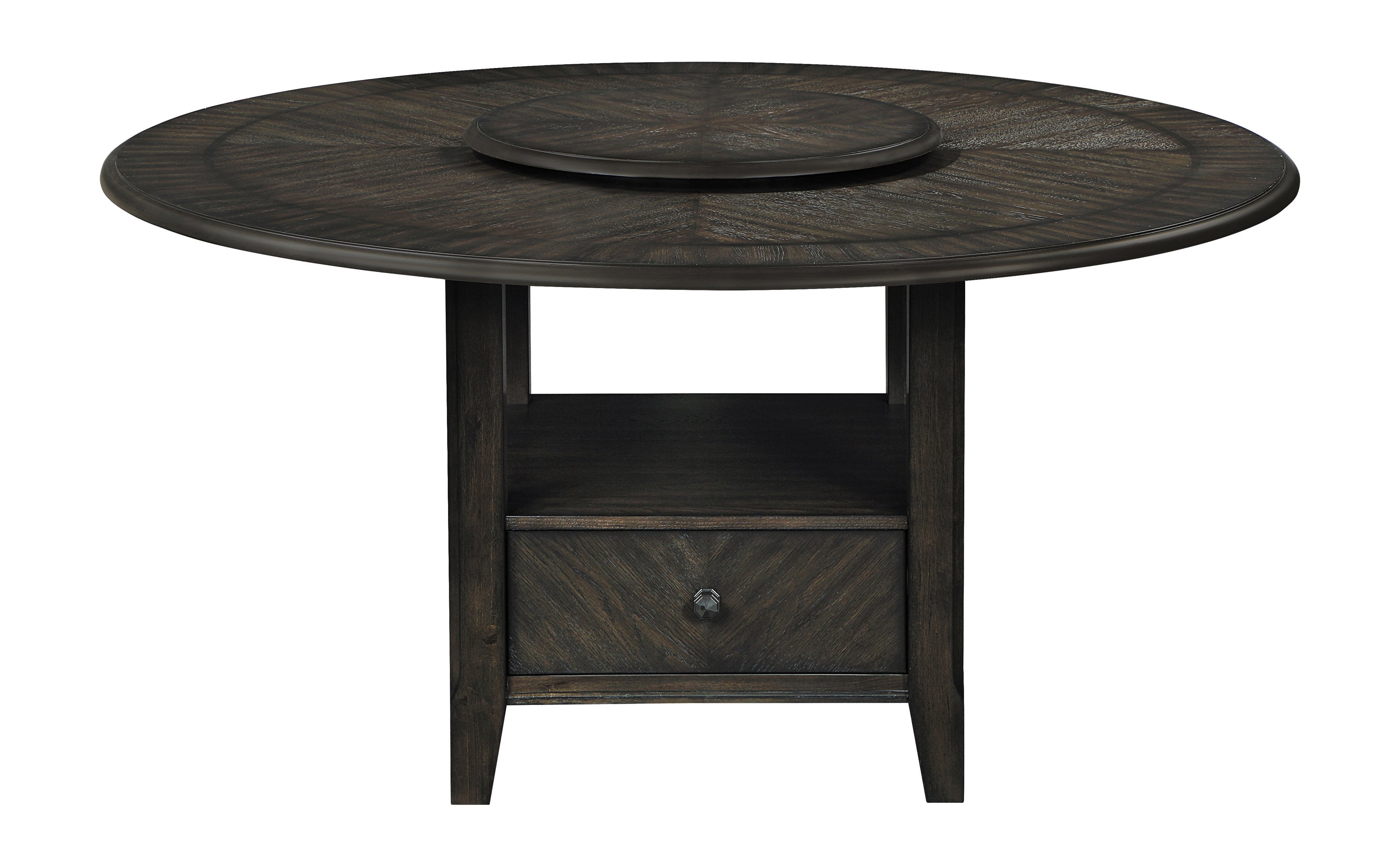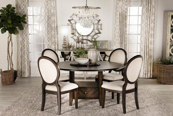 Leg finish: Dark CocoaA beautiful addition to your kitchen or dining room, this five-piece dining set delivers a lovely blend of style and functionality. Crafted from Asian hardwood, the table includes a removable lazy susan at its center and ample storage underneath. The pedestal base includes a drawer and shelf, great for stashing linens and accessories or adding decor for a custom look. Four chair pair elegant, Neoclassical oval backrests with cream-colored upholstery and a rich dark cocoa finish that perfectly matches the table. Inviting, comfortable and convenient without sacrificing even the slightest bit of style, you're going to love this dining room centerpiece.