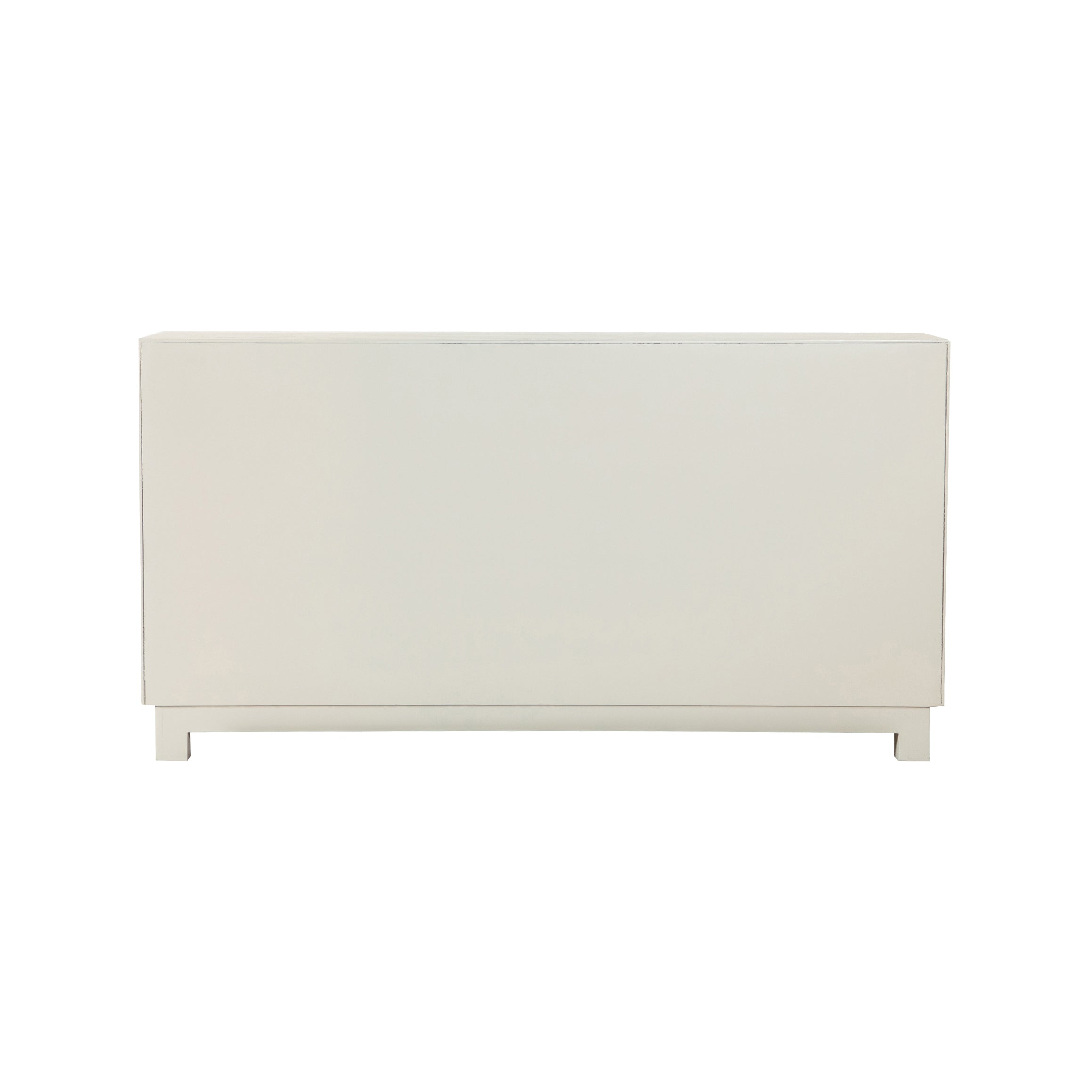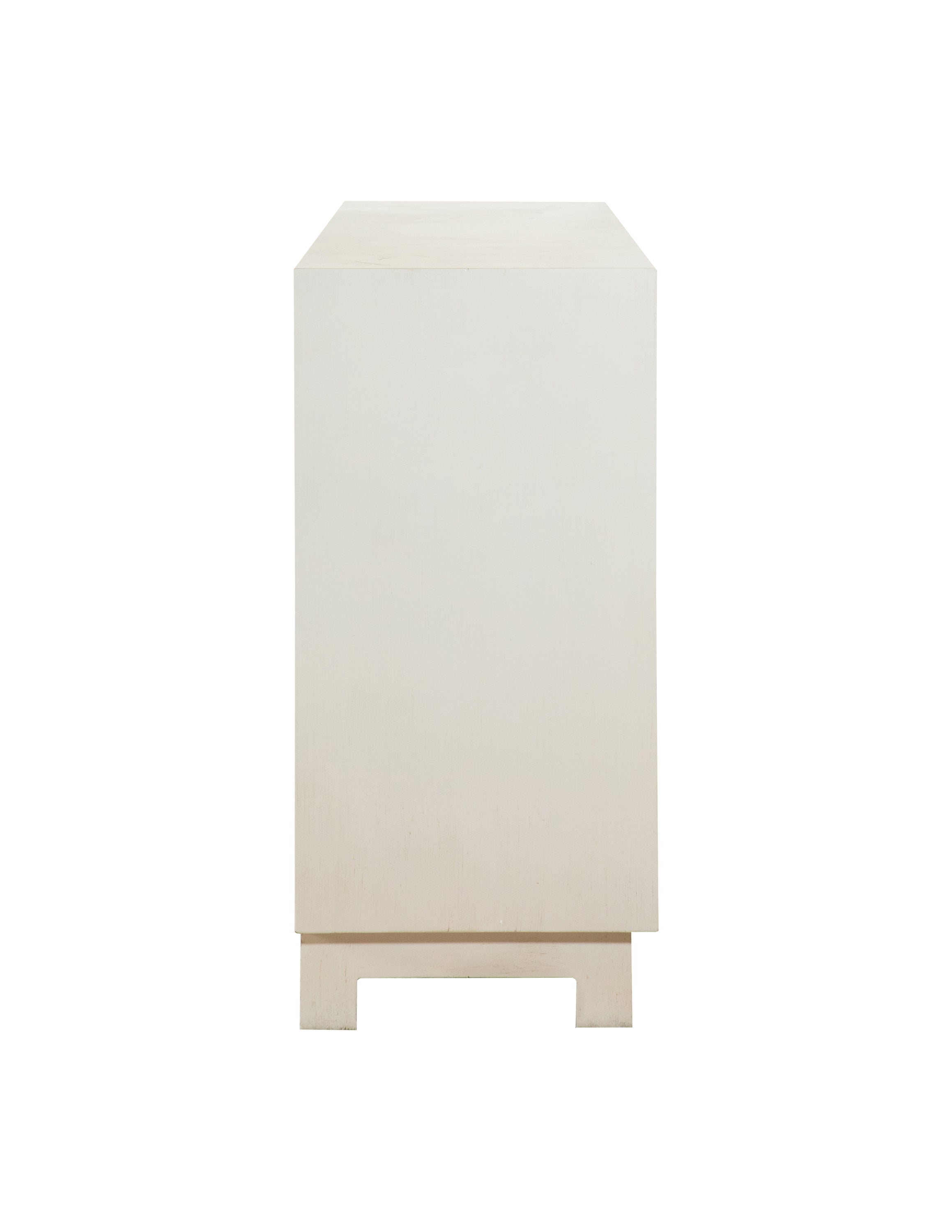 For an accent table that strikes up an instant conversation, you can't go wrong with this piece. A Greek key design on the cabinet door panels add texture and pizzazz. The white, gold, and silver color palette makes an immediate upgrade inside your home. Find plenty of storage space within the four cabinet doors and three interior shelves inside. This accent cabinet is supported on block style legs.