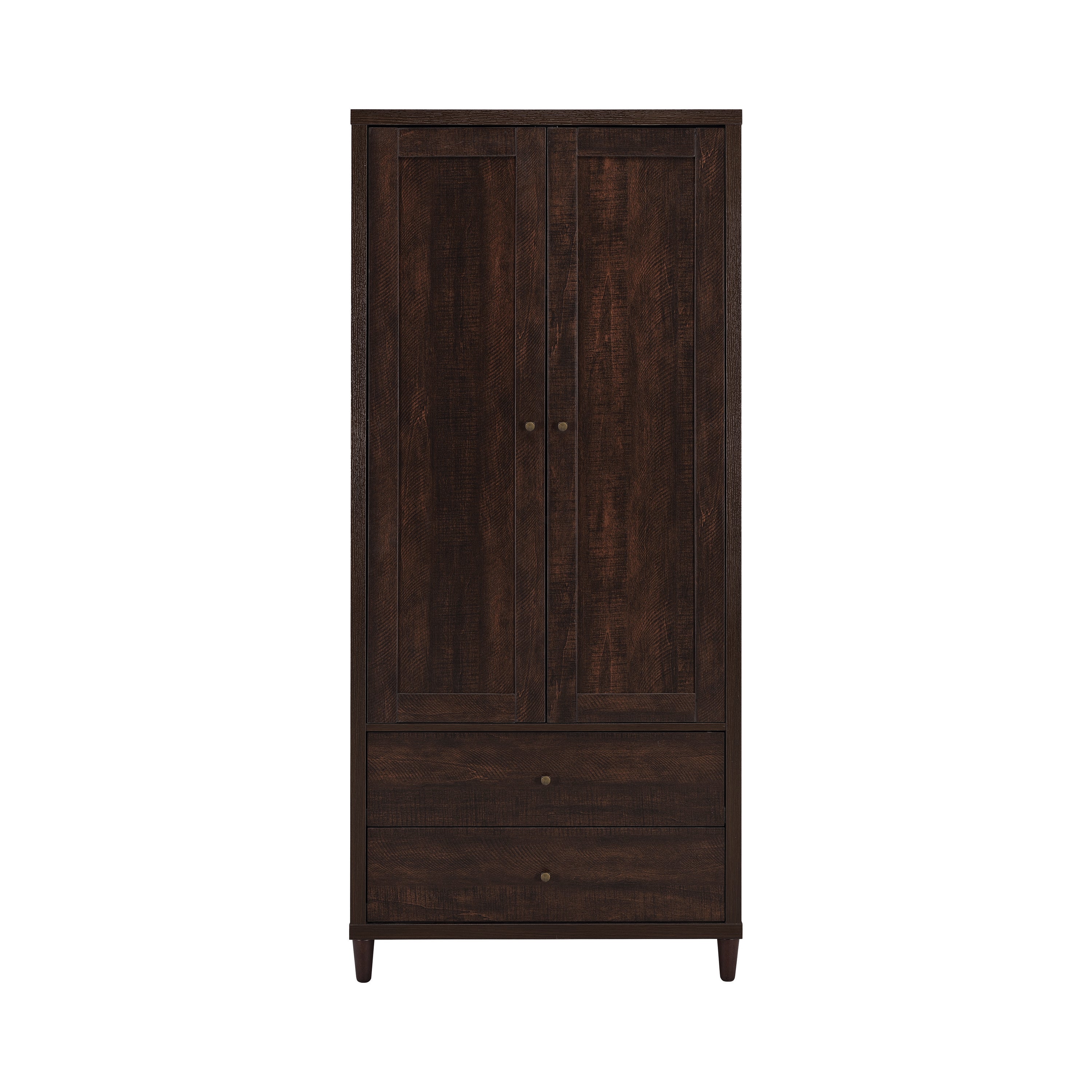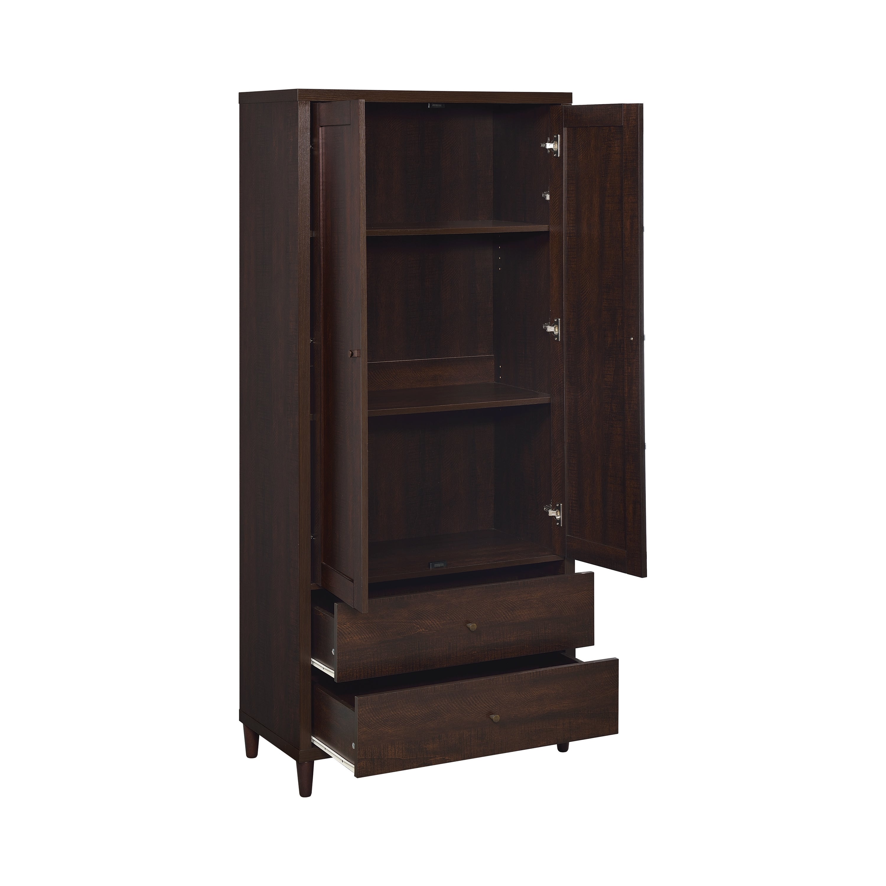 This impressive accent cabinet imparts an imposing presence to the home. At over six feet tall, it has the capacity to take on all storage needs. Two doors open up to ample space. Below are two deep drawers for additional storage of everything from sofa covers to extra plateware. The cabinet is finished in rustic tobacco for a warm, inviting ambiance.