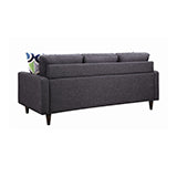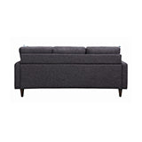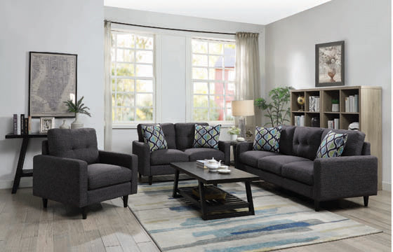 Relax on this stationary sofa that has clean lines and style that's sure to satisfy. Seat cushions are plush for hours of enjoyment watching anything from Netflix to the playoffs. Thick, button-tufted seat backs add timeless style as well as comfort and support. Round tapered legs and wide arm supports impart sturdiness and convenience all in one. Wrapped in dark grey fabric that appeals to even the most discerning homeowner.