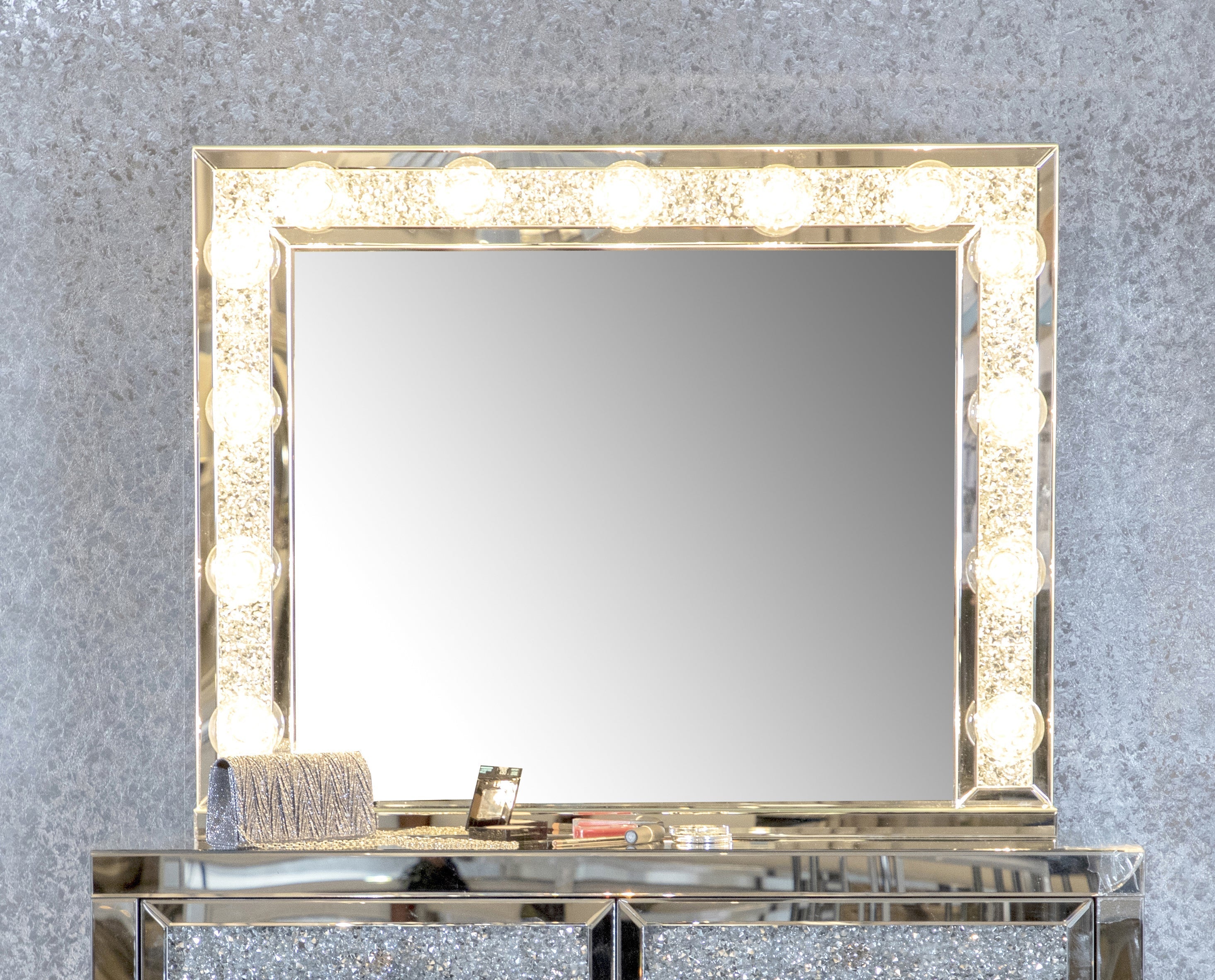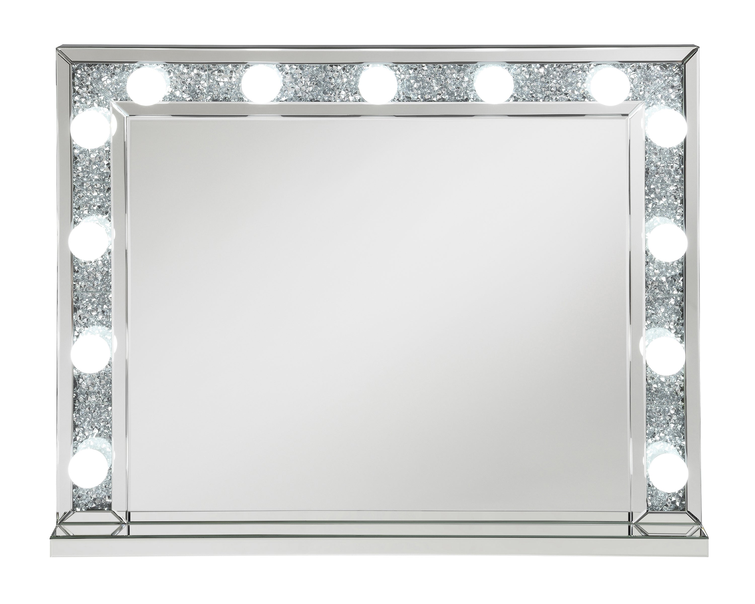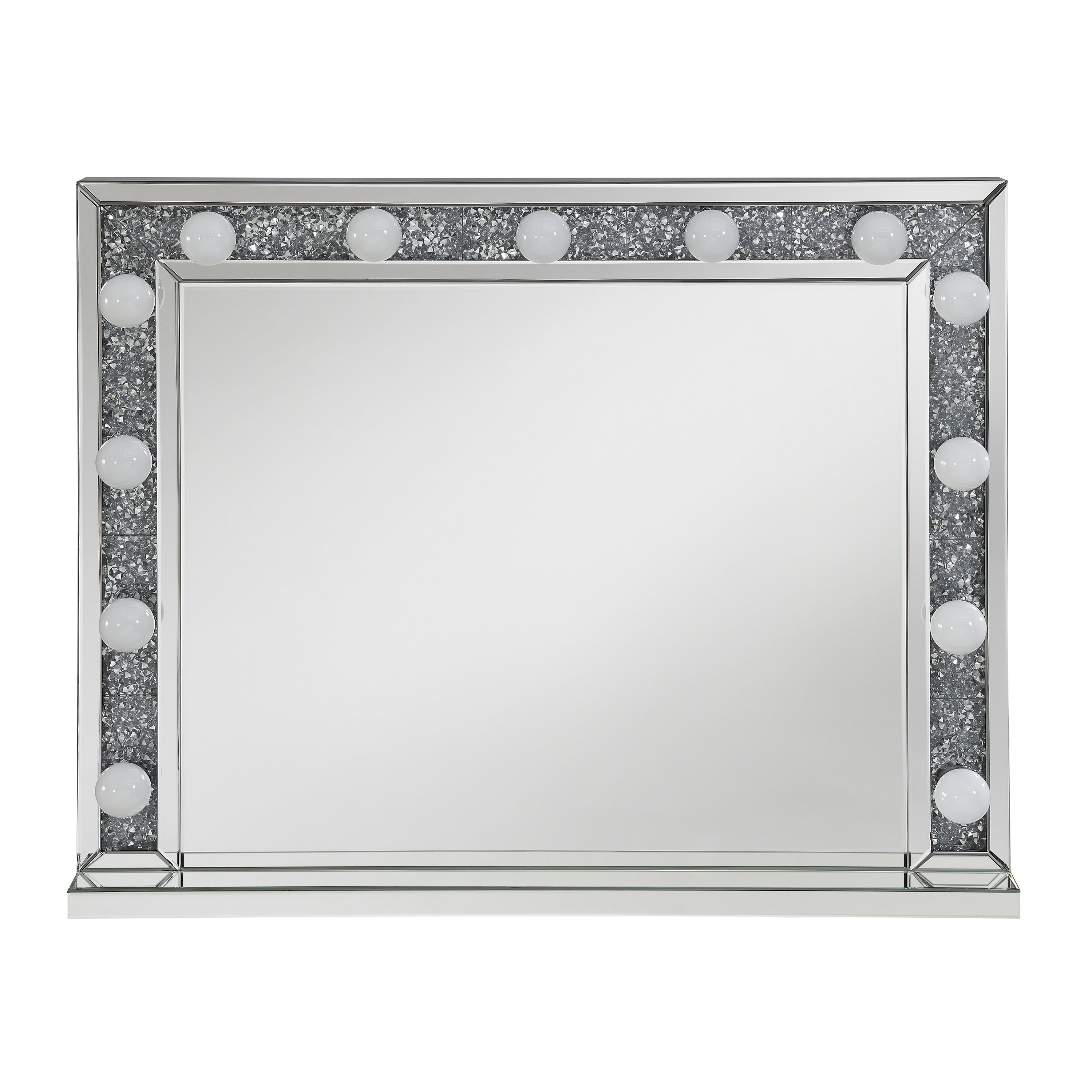 With a Hollywood regency flair, this table mirror is perfectly suited for a vanity tabletop. Place it above a vanity for a place to sit an apply makeup and more. With a rectangular shaped frame, filled with glimmering silver crystals and outlined in mirror paneling, this mirror offers all the luxe glam you need. As practical as it is glamorous, it offers a button switch power cord and over a dozen opaque white globe style bulbs for a retro-inspired look. Place this vanity mirror in a dressing area for a regal flair.