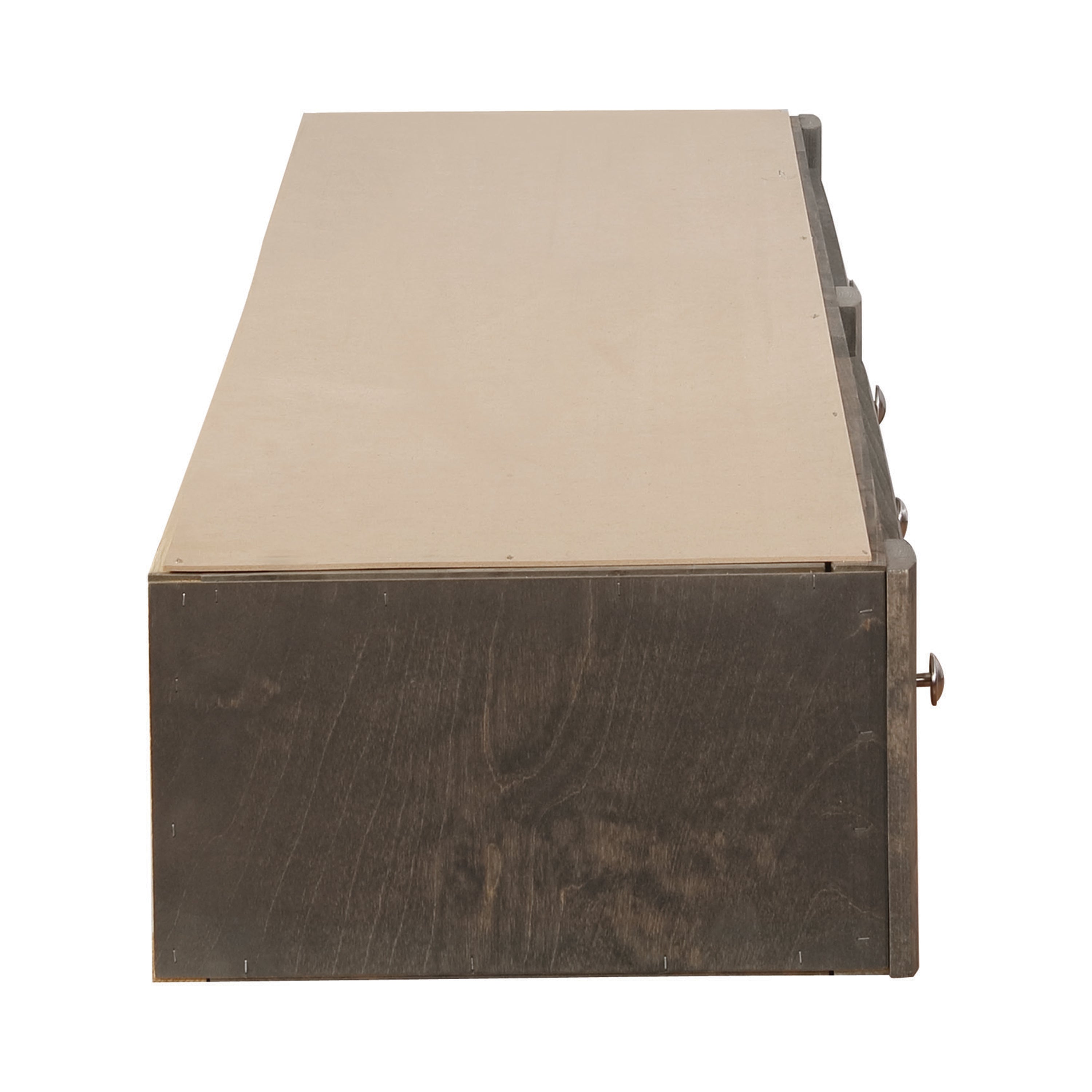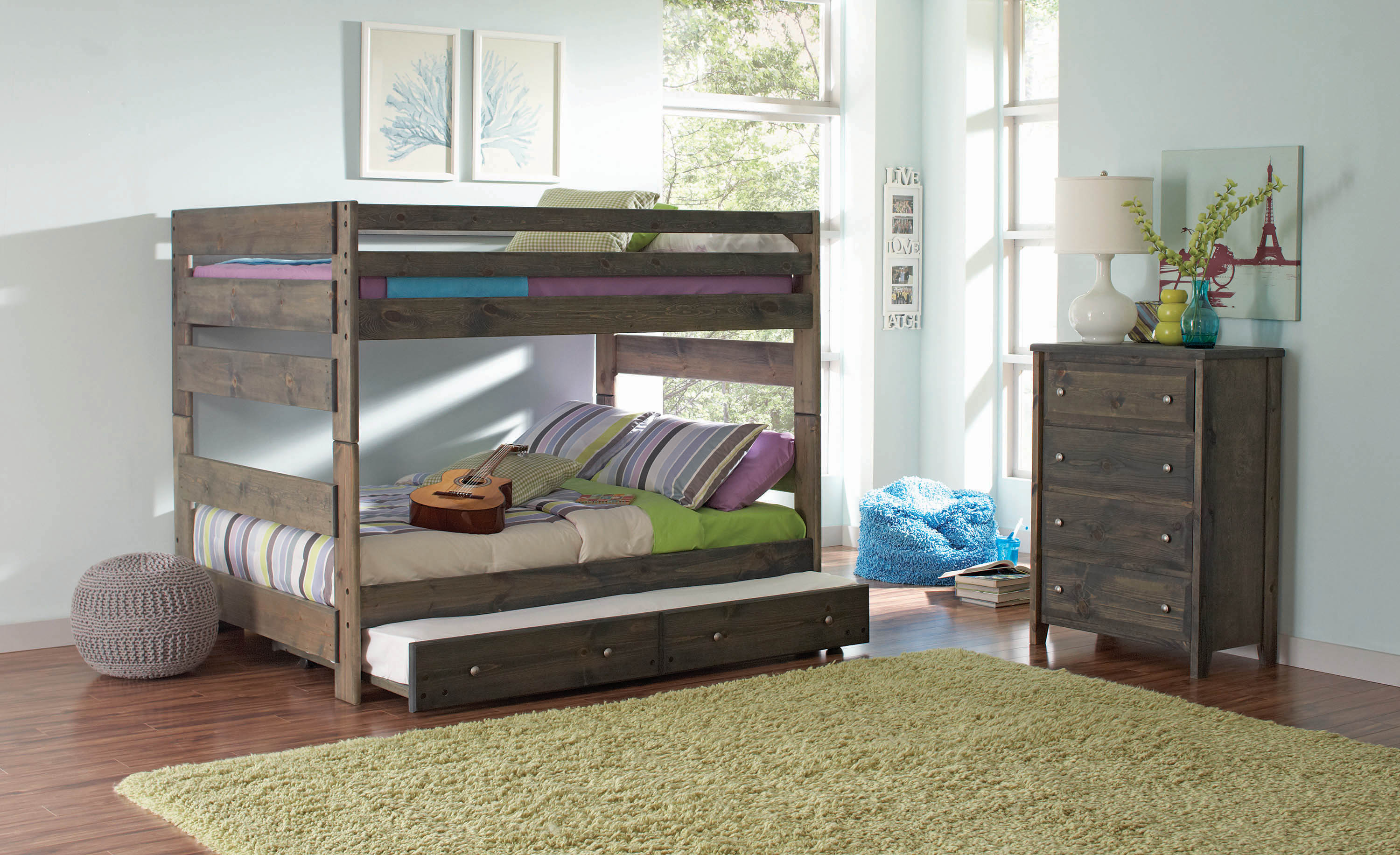 The Wrangle Hill collection is characterized by a rustic appeal, as exemplified by this under bed storage. It is highlighted by two storage drawers convenient for extra linens or nighttime reading materials. Constructed with center metal glides and built for durability. The under bed storage is finished in unique gun smoke for a distinctive bucolic appearance. It is perfectly suited for the bunk bed of the same collection (sold separately).