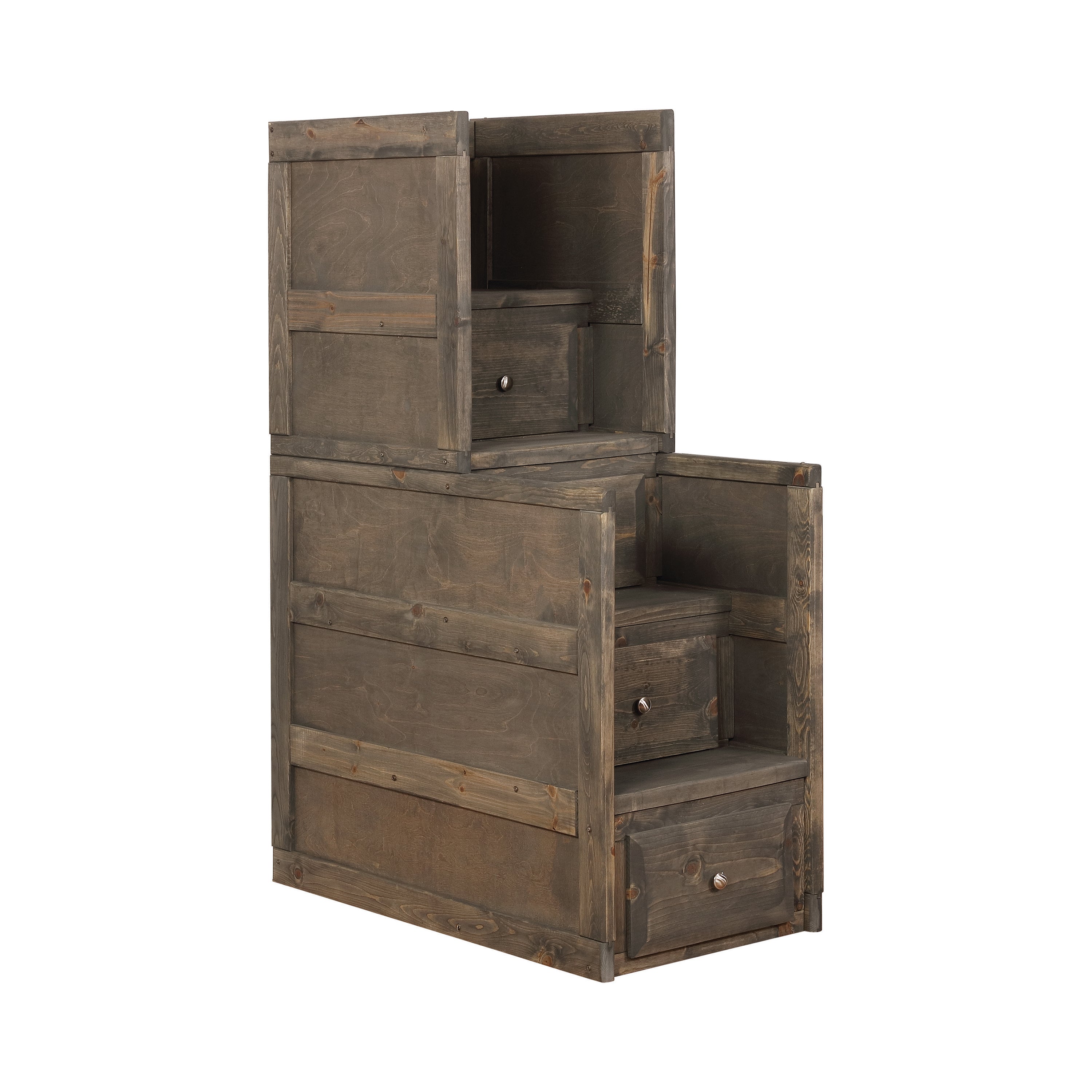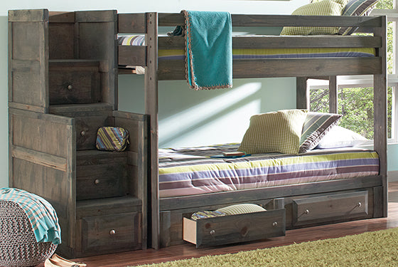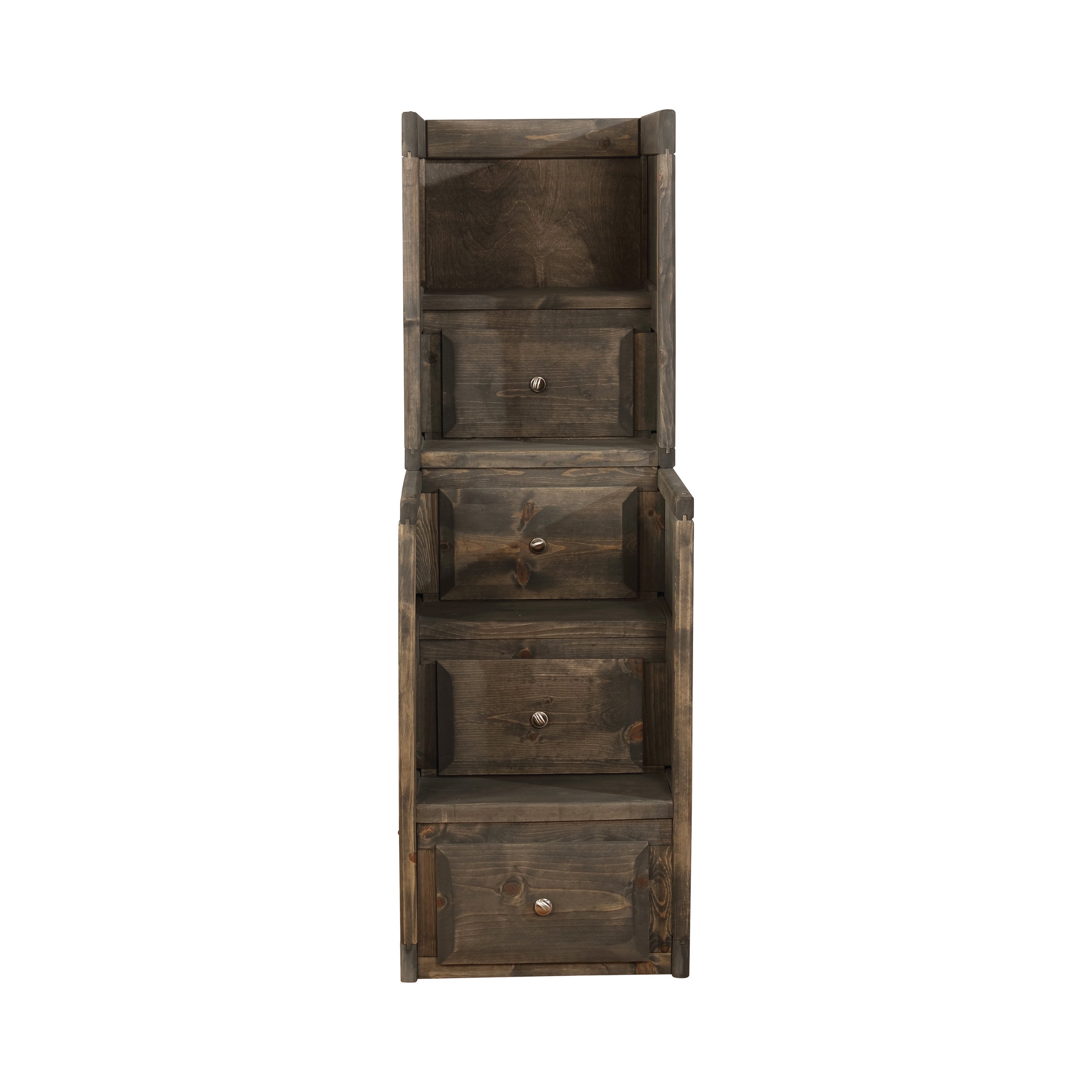 The rustic Wrangle Hill collection showcases style as well as practicality. The stairway chest personifies this with impressive beauty and detail. Each of the four steps in the stairway doubles as a deep, spacious drawer with center metal glides. It is sturdily constructed and is finished in gun smoke. It conveys a pastoral beauty that accompanies the bunk bed in the same collection (sold separately) to absolute perfection.