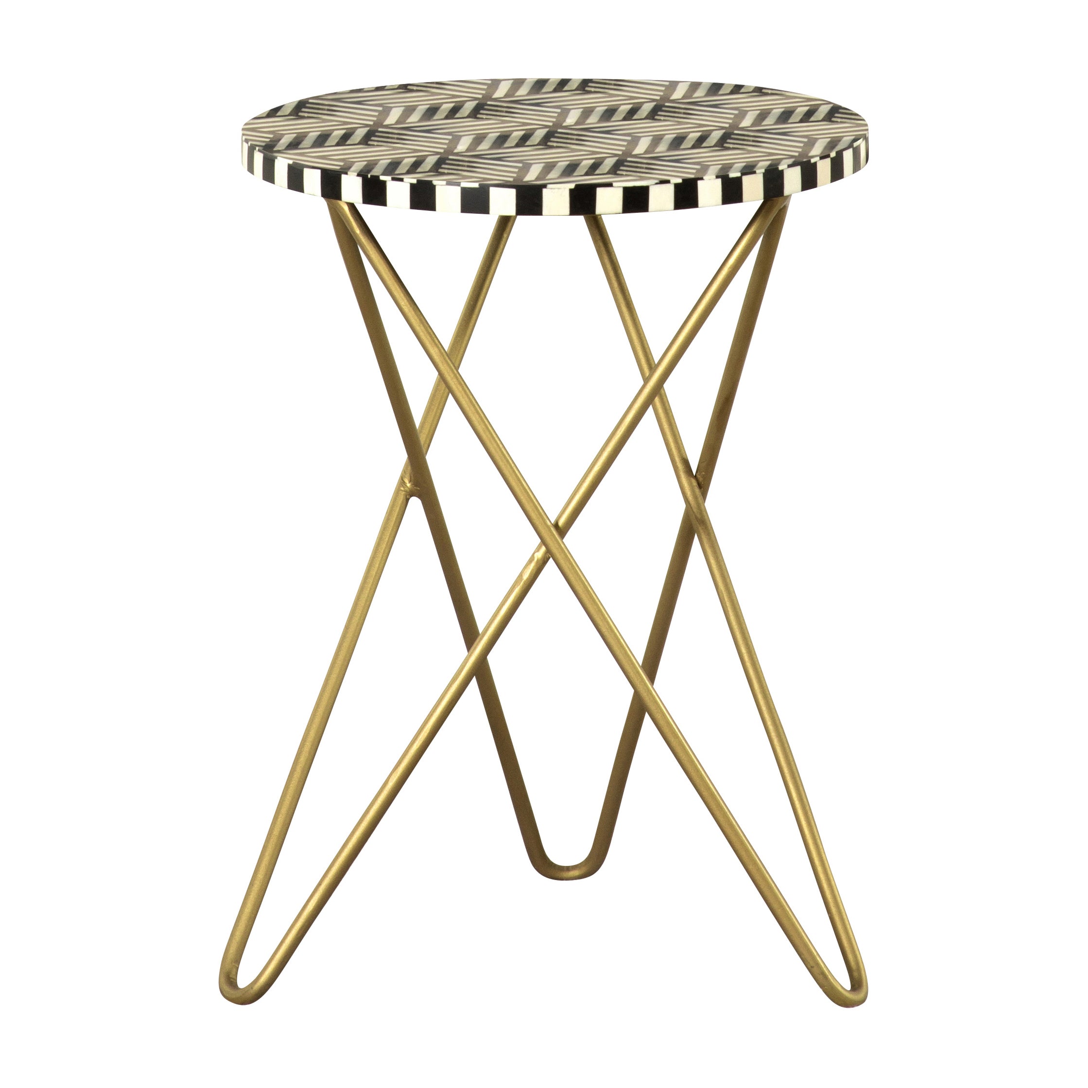 Bold prints and classic designs come together to create this contemporary accent table. Featuring a playful mosaic motif in a contrasting white bone and black resin hand-inlaid design, this stunning side table offers a dramatic focal point to liven up compact spaces. The round tabletop rests gracefully on a butterfly style, hairpin leg tripod base in a lustrous gold finish for a glam touch. Place this charmingly chic accent table beside a chair for place to keep a book or cocktail. Or keep it in an entryway foyer to showcase your favorite plant or vase.