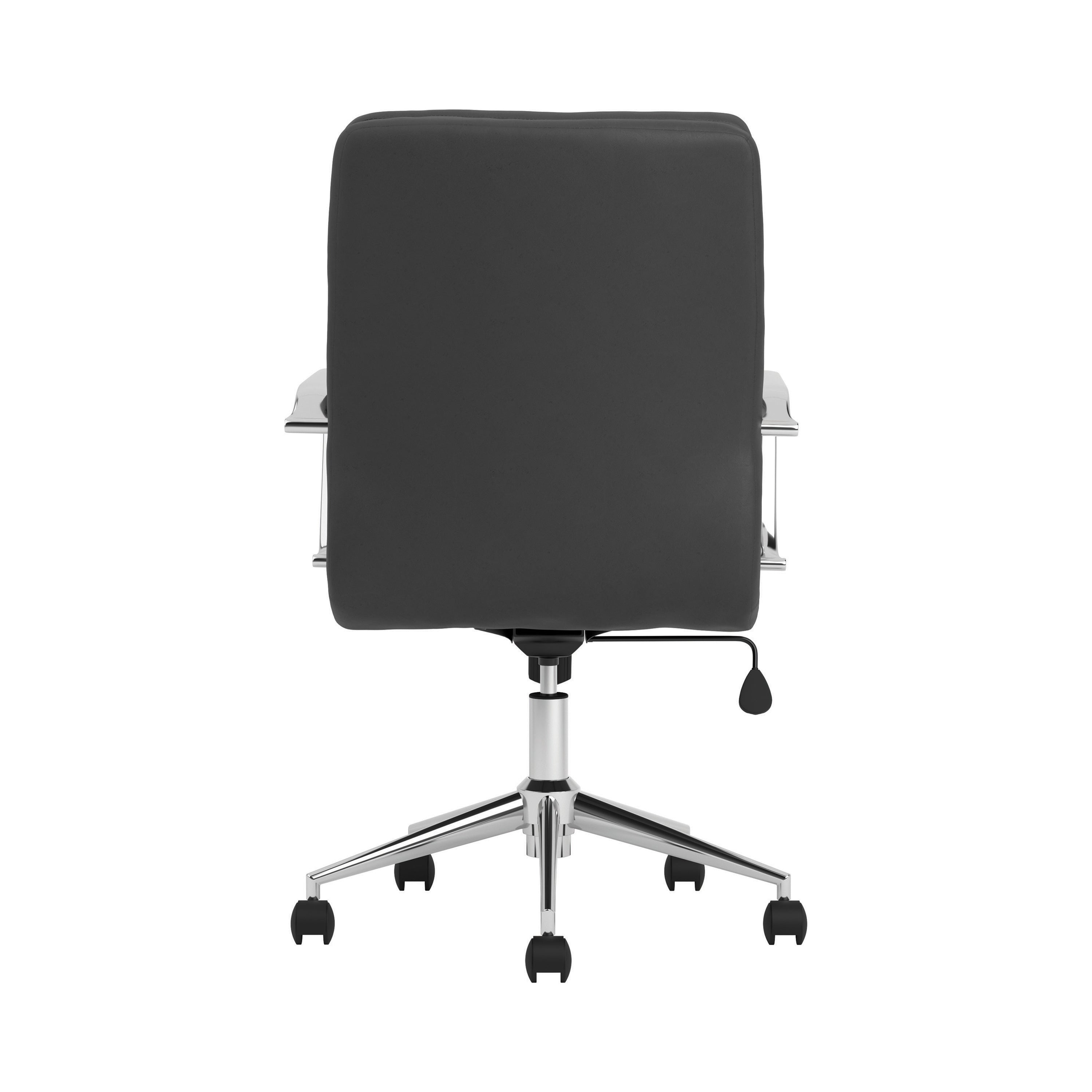 Work in modern comfort and style with this office chair. The sleek styling of the metal frame and arms displays a shiny chrome finish. This cushioned chair features a contoured mid-back design for excellent comfort in a lower profile silhouette. Your new favorite office chair is height adjustable and features casters for easy maneuvering in a busy office space. Supple leatherette upholstery is available in your choice of colors to complement the decor theme of your office.