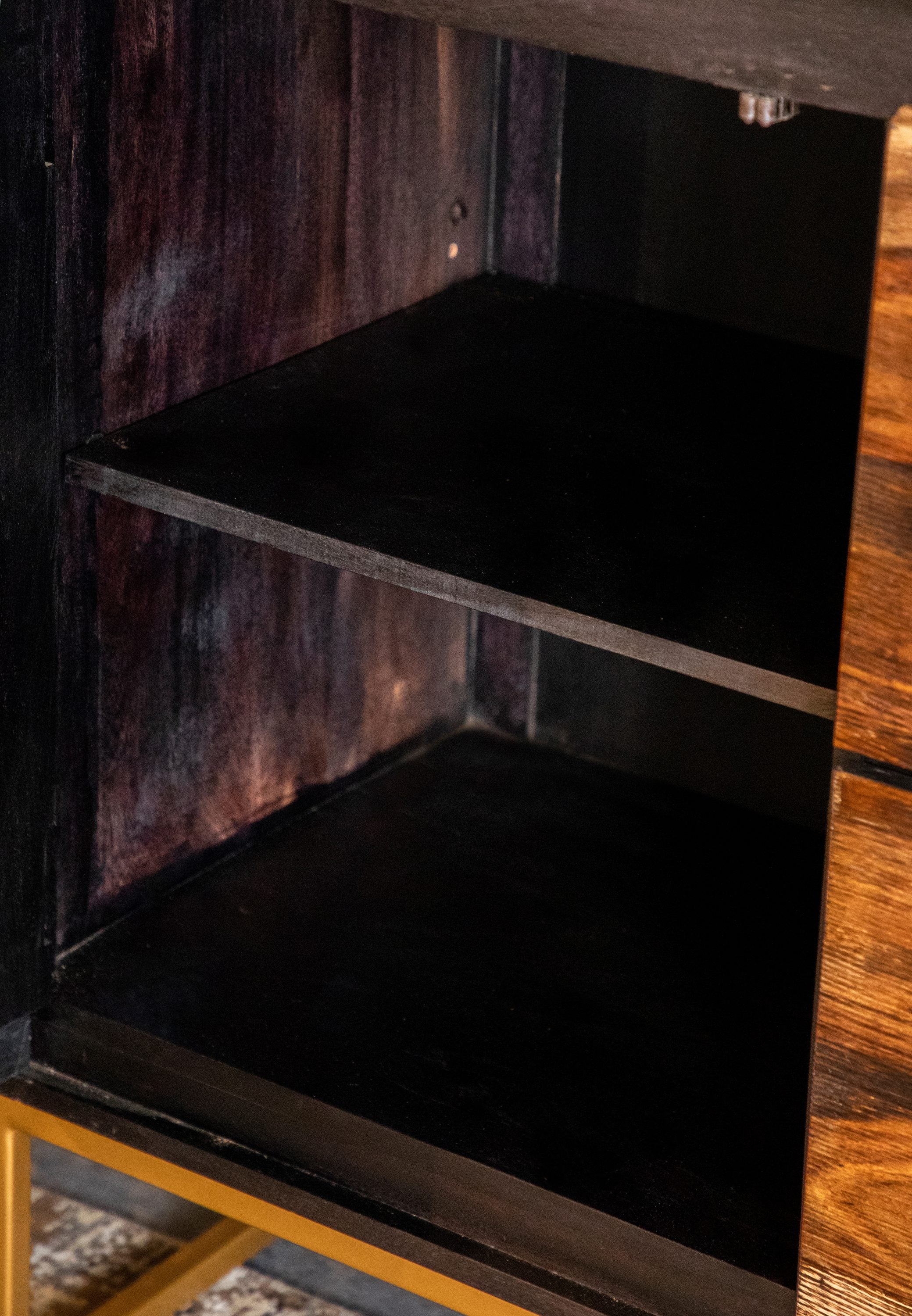 An outstanding handcrafted wood accent table from India, this piece flaunts a range of natural wood colors. Two cabinet drawers boast sleek gold bar pulls. Meanwhile, two center drawers offer additional storage space. The gold geometric base ties the entire look together. Use this piece in eclectic style living spaces.