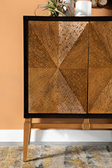 A two-tone design and sunburst effect bring exquisite personality to this accent table. Four large cabinet doors offer plenty of space for storage in an entryway or living area. The lovely combination of brown and antique gold finish provides unforgettable stylish flair. This piece is supported on angled and tapered legs. Cabinet doors remain shut with a magnetic closure.