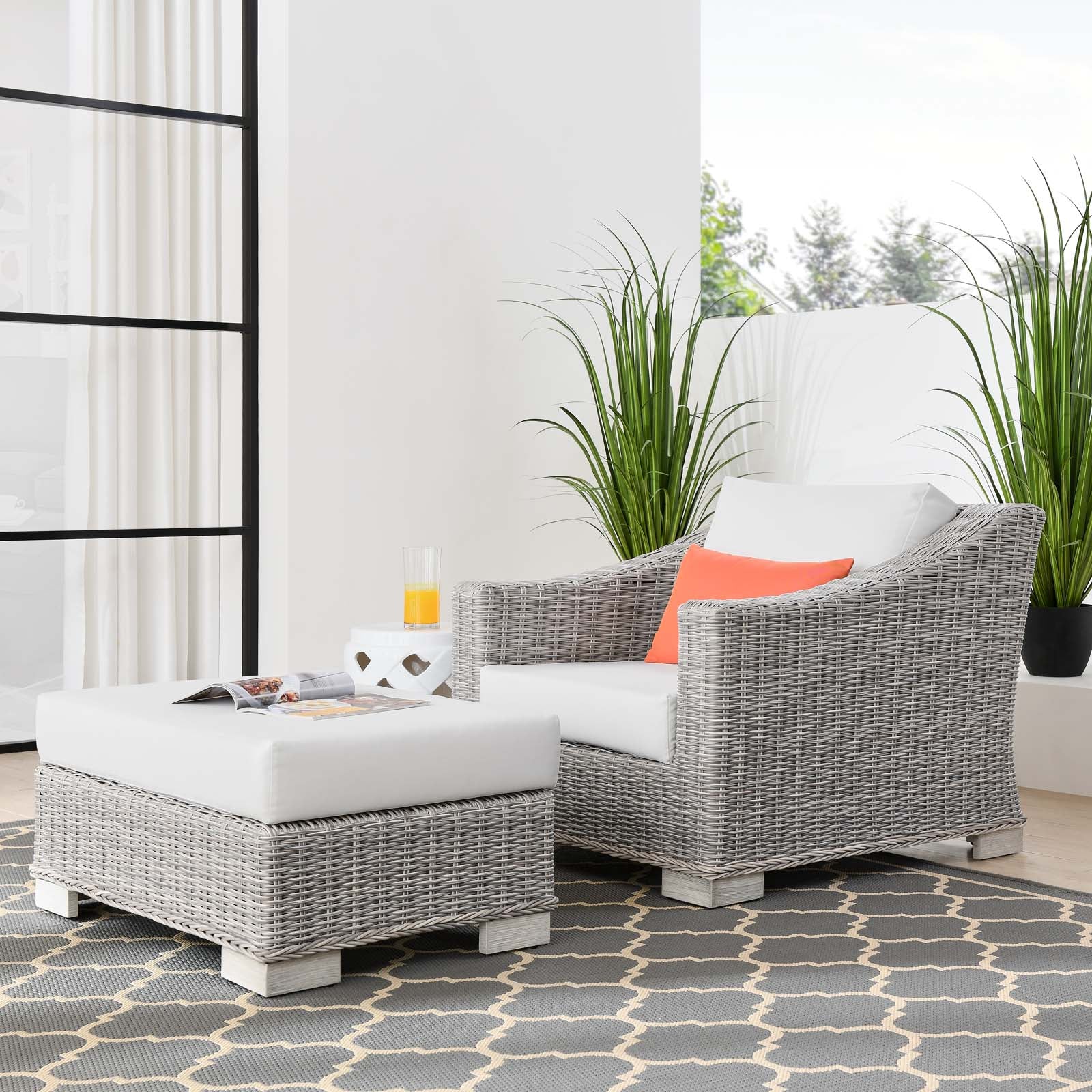 Enjoy fresh air and alfresco relaxation with the Conway Outdoor Patio Wicker Rattan 2-Piece Armchair and Ottoman Set. Wrapped in UV-resistant light gray synthetic wicker rattan, this patio chair and ottoman set boasts organic texture and a neutral hue that brings a calming presence to your outdoor space. The frames of this outdoor furniture set are crafted with durable powder-coated aluminum and rest on L-shaped legs with plastic foot glides. Thick foam padded cushions covered with removable, water-resistant polyester fabric covers offer a comfortable seat and affix securely to the lounge chair with cord tension attachments. Trending aesthetics and a classic design define this outdoor patio furniture collection making it a beautiful addition to any outdoor space including the backyard, patio, porch, balcony, or poolside. Assembly required. Set Includes: Chair, Ottoman